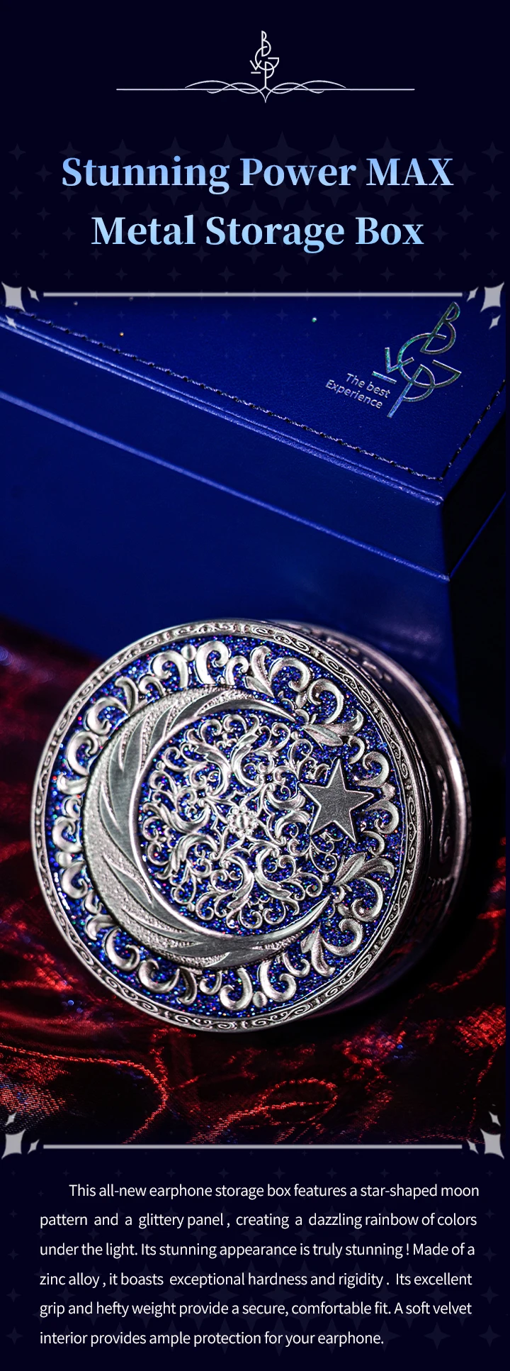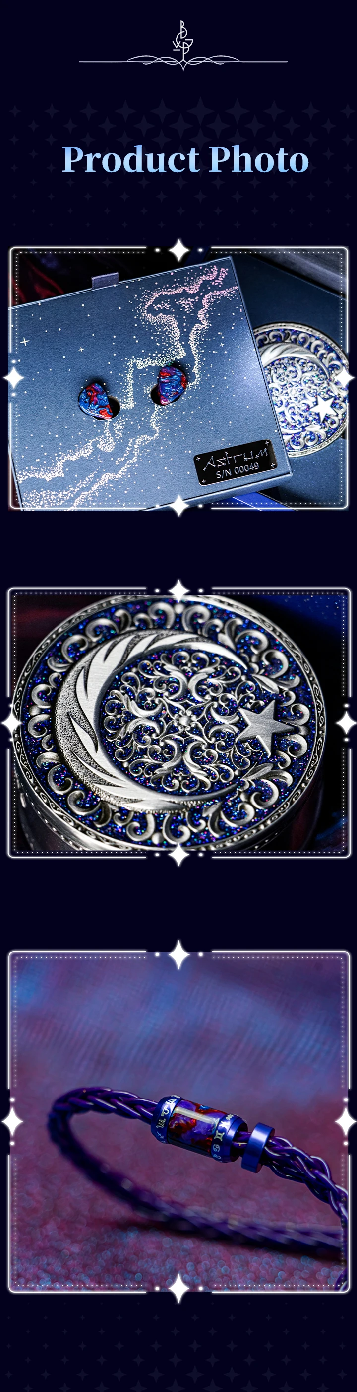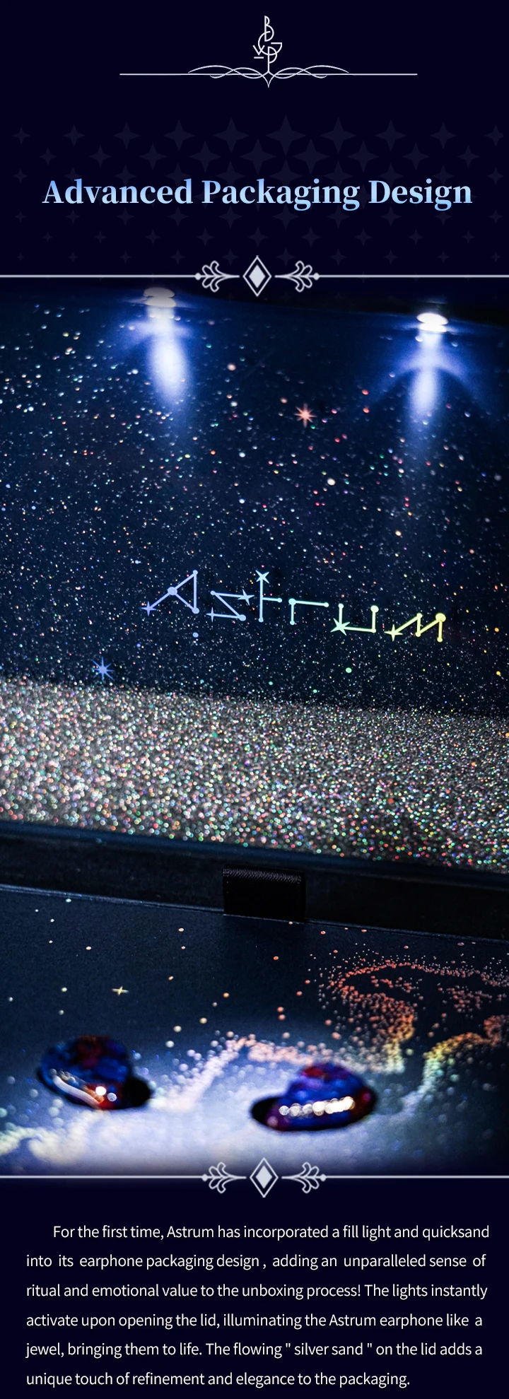 Astrum comes in a stunningly beautiful package, it incorporates a fill light and quicksand into its earphone packaging design. It’s no regular retail box, but a specially designed packaging that brings a unique experience like the pair itself. It adds an unparalleled sense of ritual and emotional connection to the unboxing process. The lights instantly lit up upon opening the lid, illuminating the Astrum IEMs like jewelry. The flowing sand on the lid adds a unique touch of refinement and elegance to the package as well. Additionally, we also have a designer metallic storage case with a star-shaped moon pattern and a glittery surface.