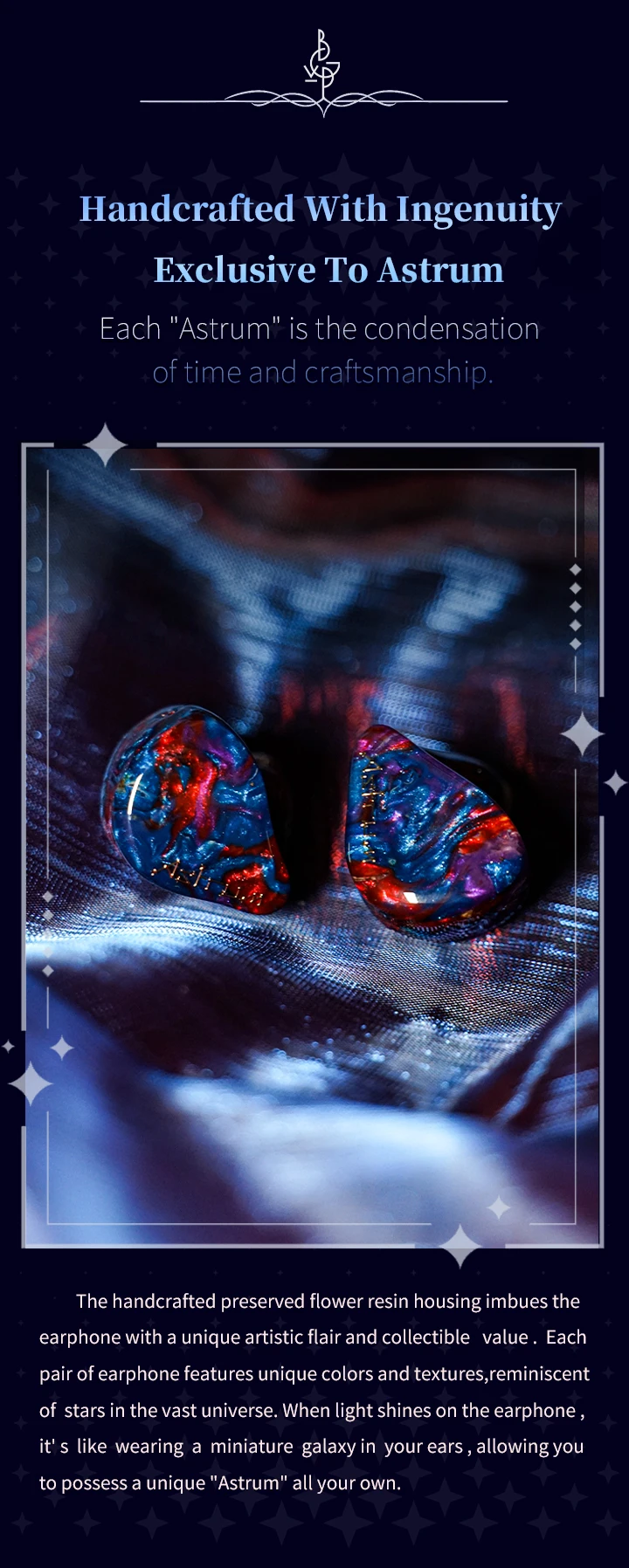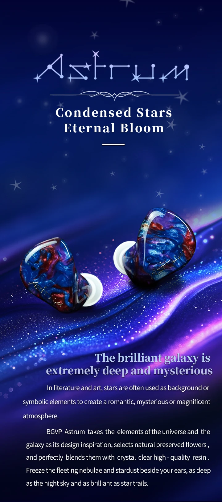 BGVP Astrum IEMs have a unique and charming design; each unit is handcrafted to perfection with preserved flower resin material housing. Each pair has a unique combination of colours and textures, and the design reflects the stars in the vast universe. It’s like wearing a miniature galaxy in your ears, the Astrum has a charm of its own!!