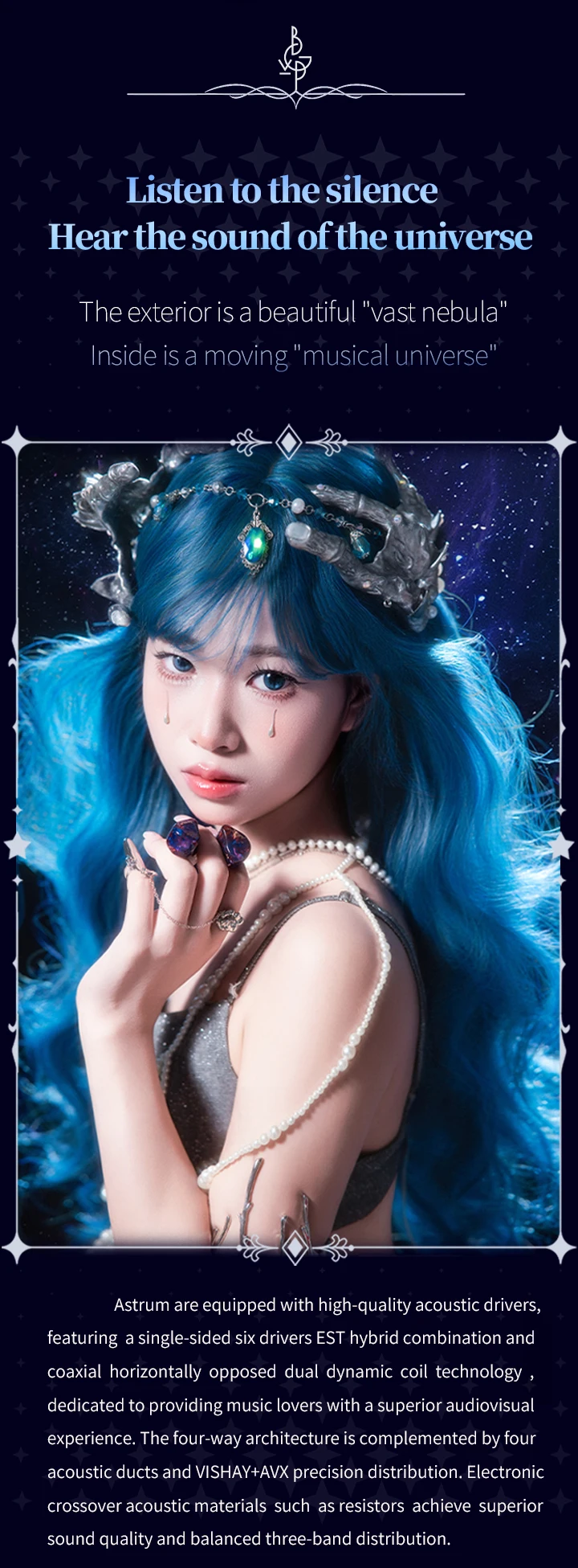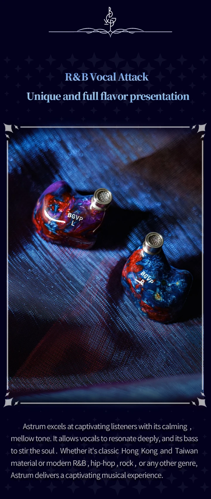 Explore the unexplored, meet the BGVP Astrum, a brand new multi-driver hybrid IEM with design inspiration featuring elements from the universe and galaxy. The pair packs spectacular looks with vivid, colourful design. BGVP has featured a six-driver hybrid setup on each side, housing a coaxial dual 8mm horizontal symmetrical dynamic driver setup, dual Knowles balanced armature drivers, and dual SONION high-performance EST drivers. With a four-way physical+electronic crossover, the BGVP Astrum delivers pure high-fidelity sonic excellence. BGVP Astrum captivates its listeners with a calming, musical, rich sound quality that complements different genres of music!!