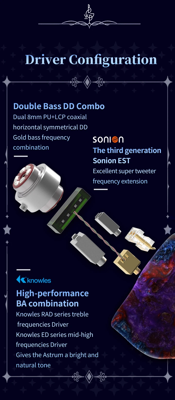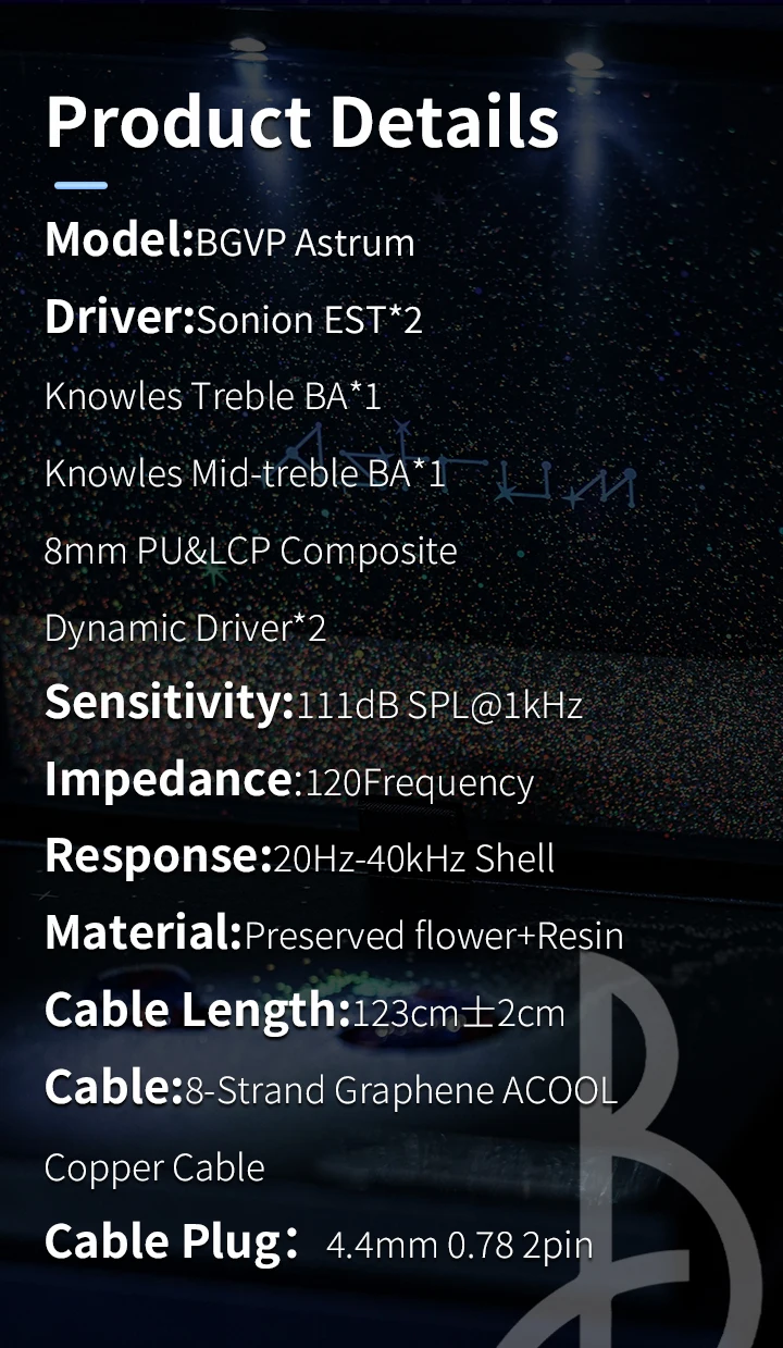 BGVP Astrum features a solid six-driver hybrid configuration featuring top-quality drivers on each side. We have a coaxial horizontally opposed dual 8mm dynamic driver setup combined with premium-quality dual Knowles Midrange and High-frequency balanced armature drivers, and dual SONION EST drivers for the ultra-high-frequency band. This multi-driver arrangement results in a solid bass punch, unmatched mid-range clarity, and extended treble response. BGVP Astrum promises a lively, natural sound which complements different genres with a rich tone and outstanding resolution across the frequency band.