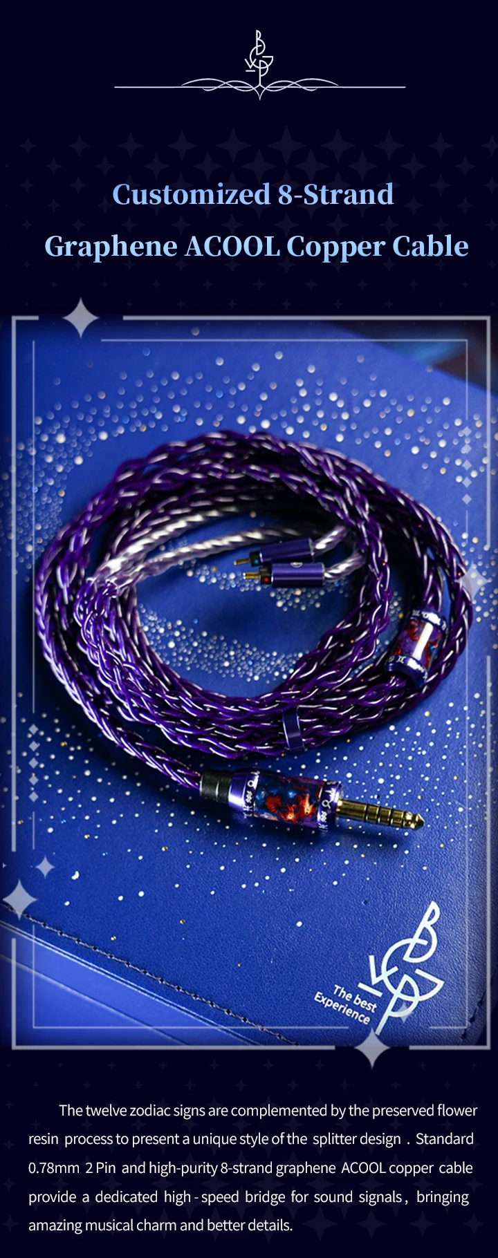 BGVP Astrum comes with a high-purity stock cable, which features high-purity 8-strand graphene ACOOL copper material wire cores that provide smooth sound signal transmission. The cable features a unique design matching the ear shells in its Y-splitter and termination plug casing. The cable has standard 0.78mm 2-pin connectors and features a 4.4mm balanced termination plug.