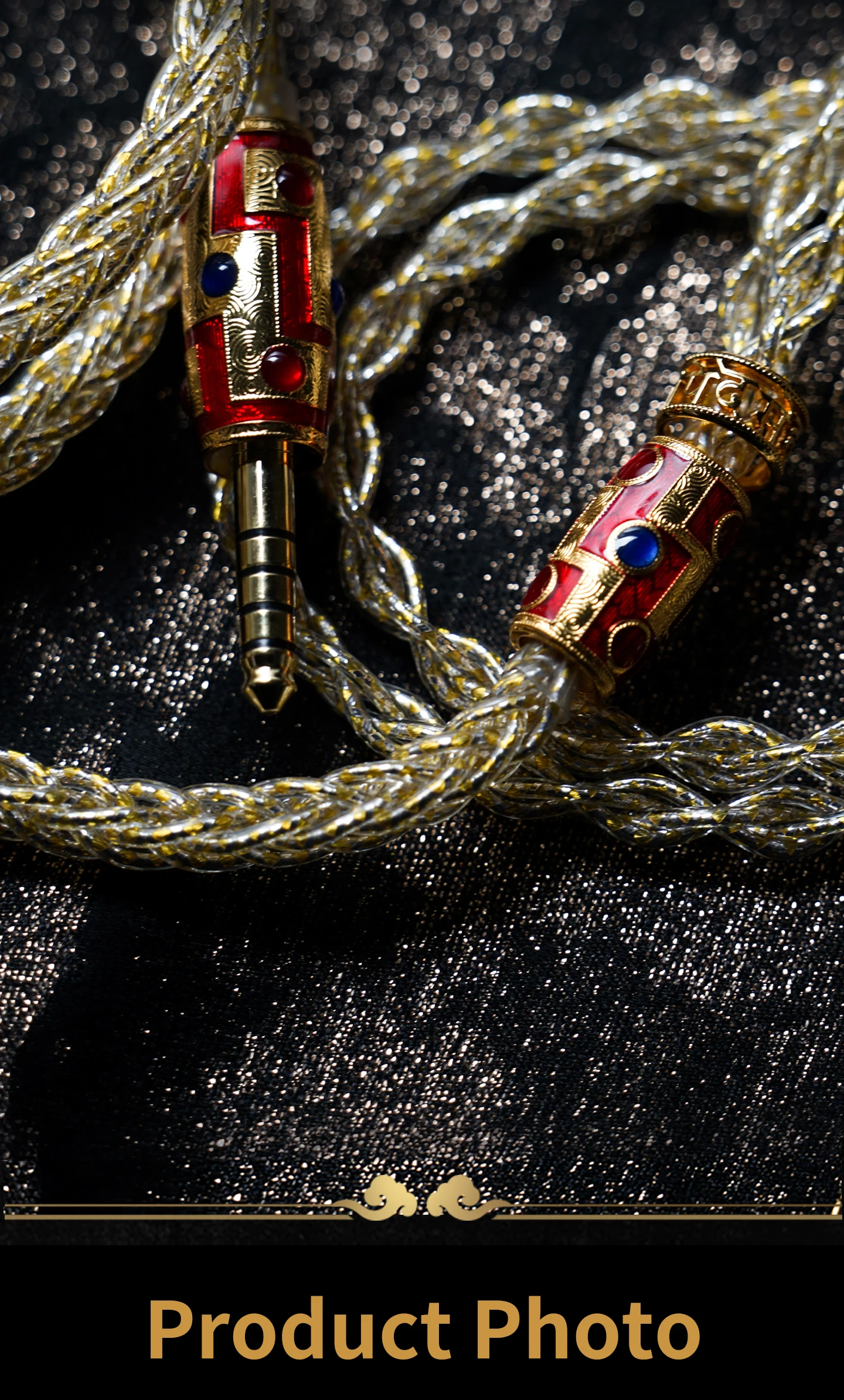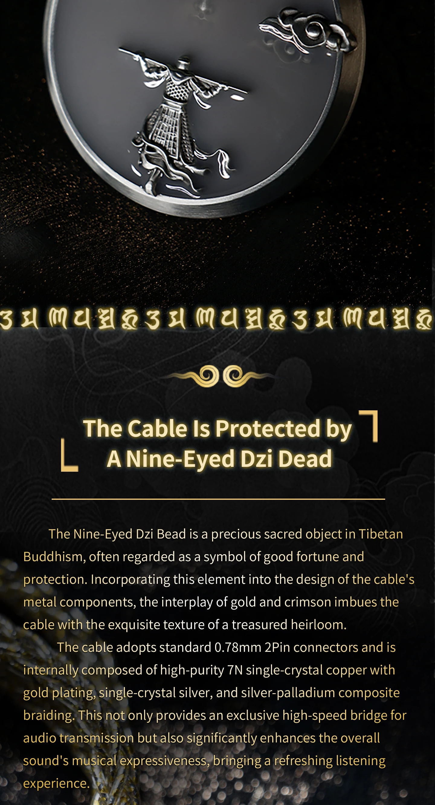 The stock cable of BGVP WuKong is a golden thread of enlightenment. The cable incorporates the Nine-Eyed Dzi Bead, a precious sacred object in Tibetan Buddhism to its design. Crafted using high-purity gold-plated 7N single-crystal copper, single-crystal silver, and silver-palladium composite material wire conductors. The Y-Splitter and Connectors are designed to mimic the texture and “eyes” of the Dzi Bead, giving the cable a heavy, jewellery-grade metallic finish. It’s a high-end cable crafted specially for the WuKong.