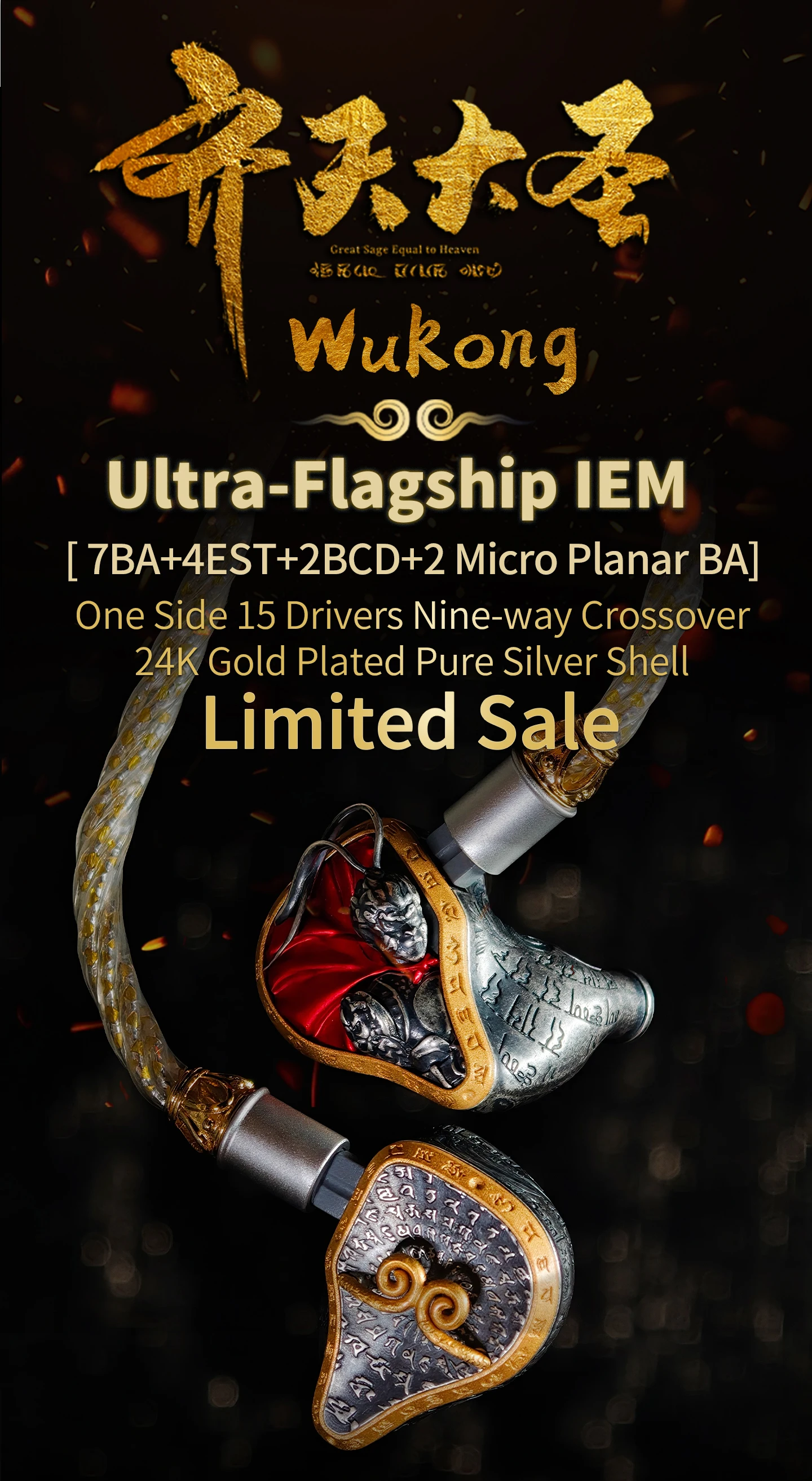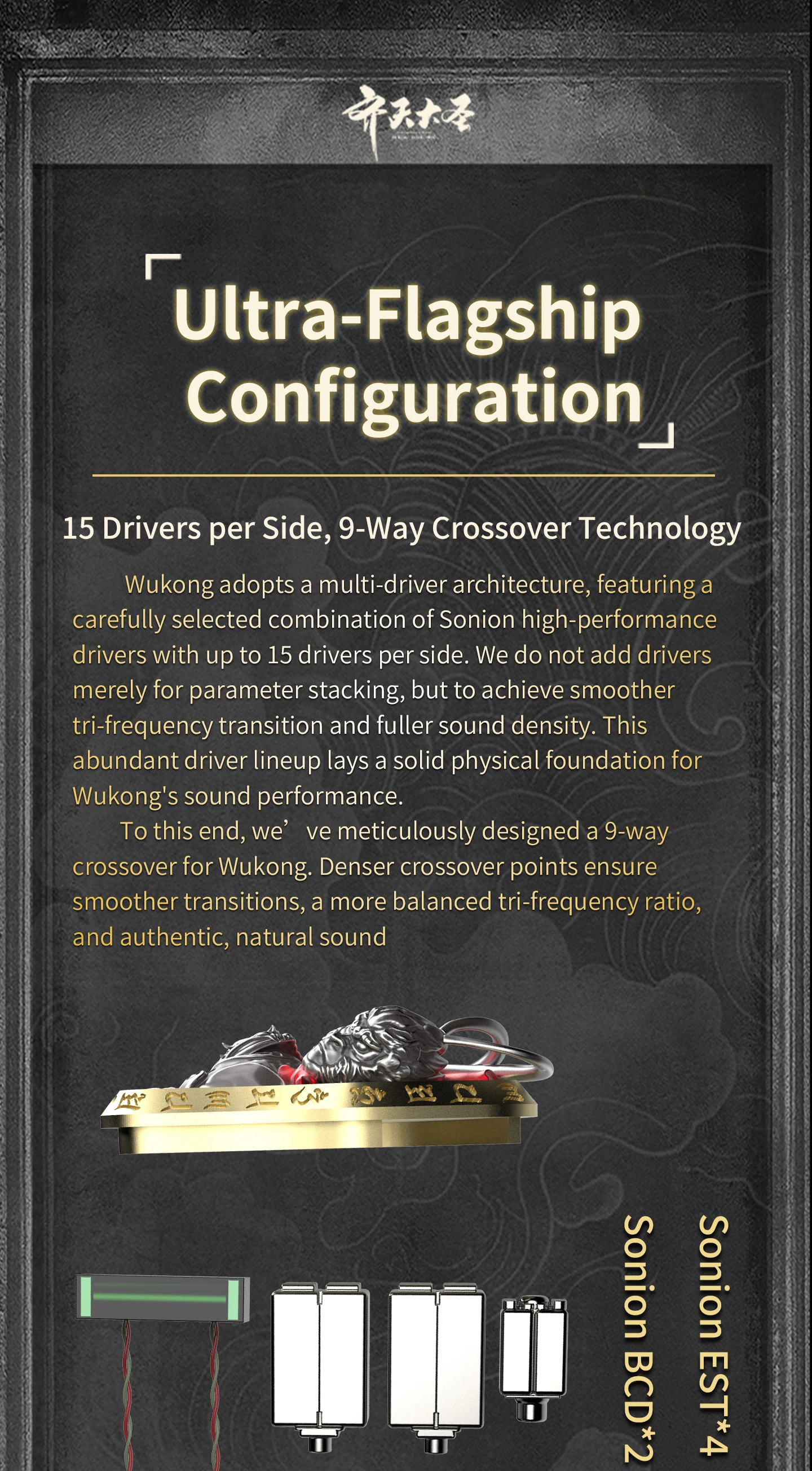 BGVP WuKong, the ultimate flagship, is finally here. Experience complete immersion with an iconic design inspired by the legendary Monkey King WuKong. The pair represents a monumental achievement in acoustic engineering with a massive 15-driver quadbrid setup arranged in an ultra-precise nine-way frequency crossover system. The pair features seven SONION balanced armature drivers, four SONION EST drivers, dual SONION bone conduction drivers, and two custom-developed micro planar drivers. BGVP has crafted the WuKong with 24K gold-plated pure silver material; the shells are literally jewellery with an iconic, intricate art inspired by the WuKong’s legendary armor and the golden Cudgel. Even the storage case is crafted with full precision and excellence to bring you a legendary experience.