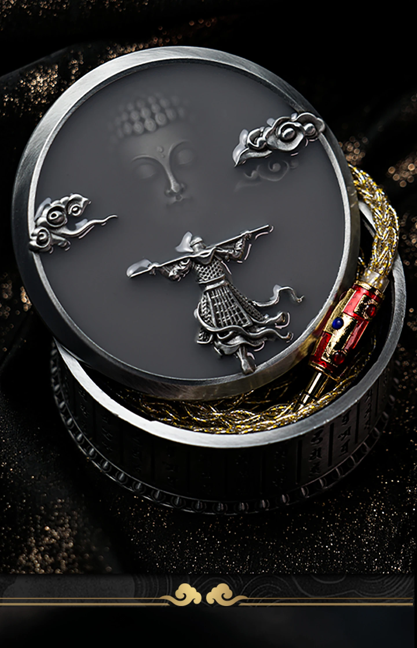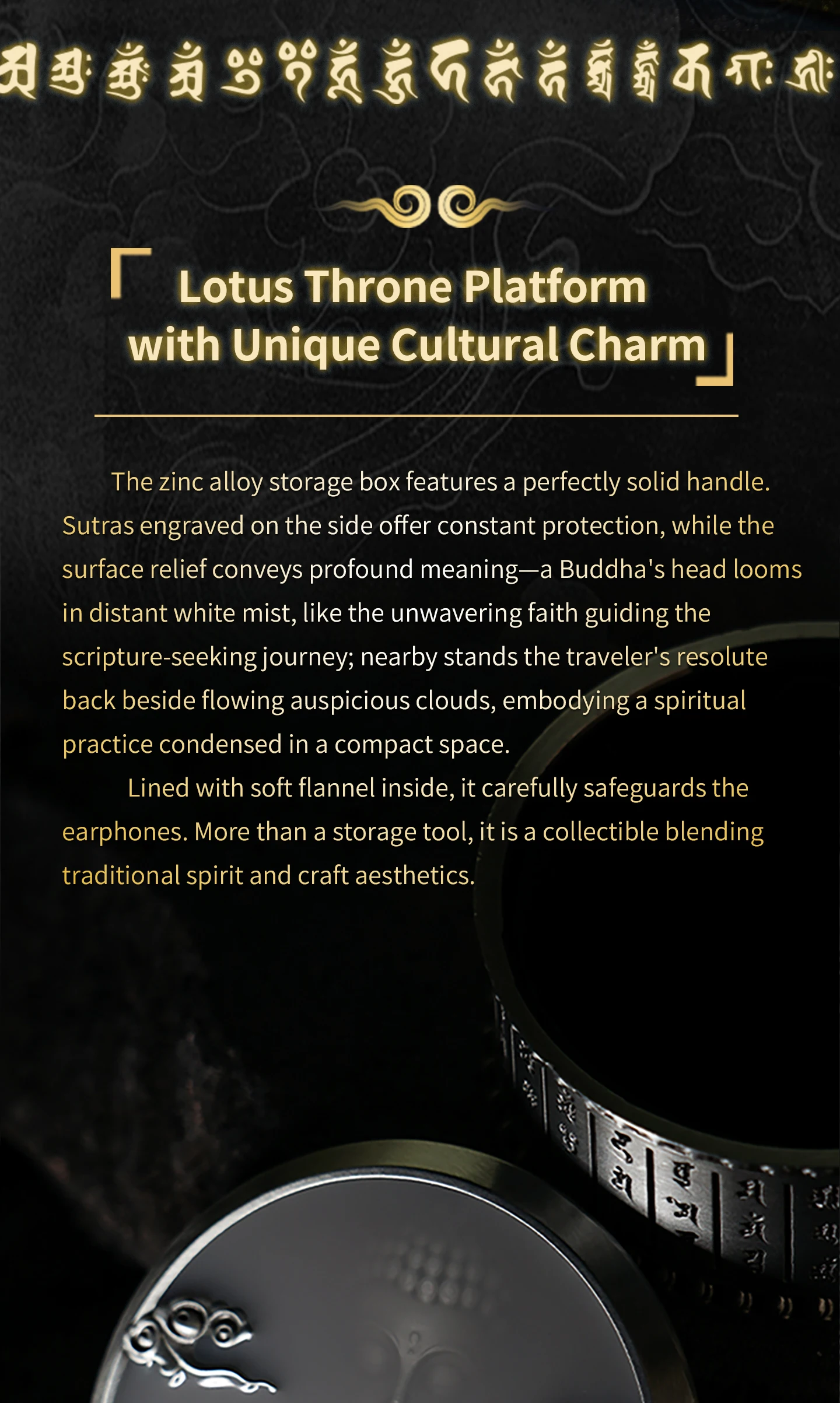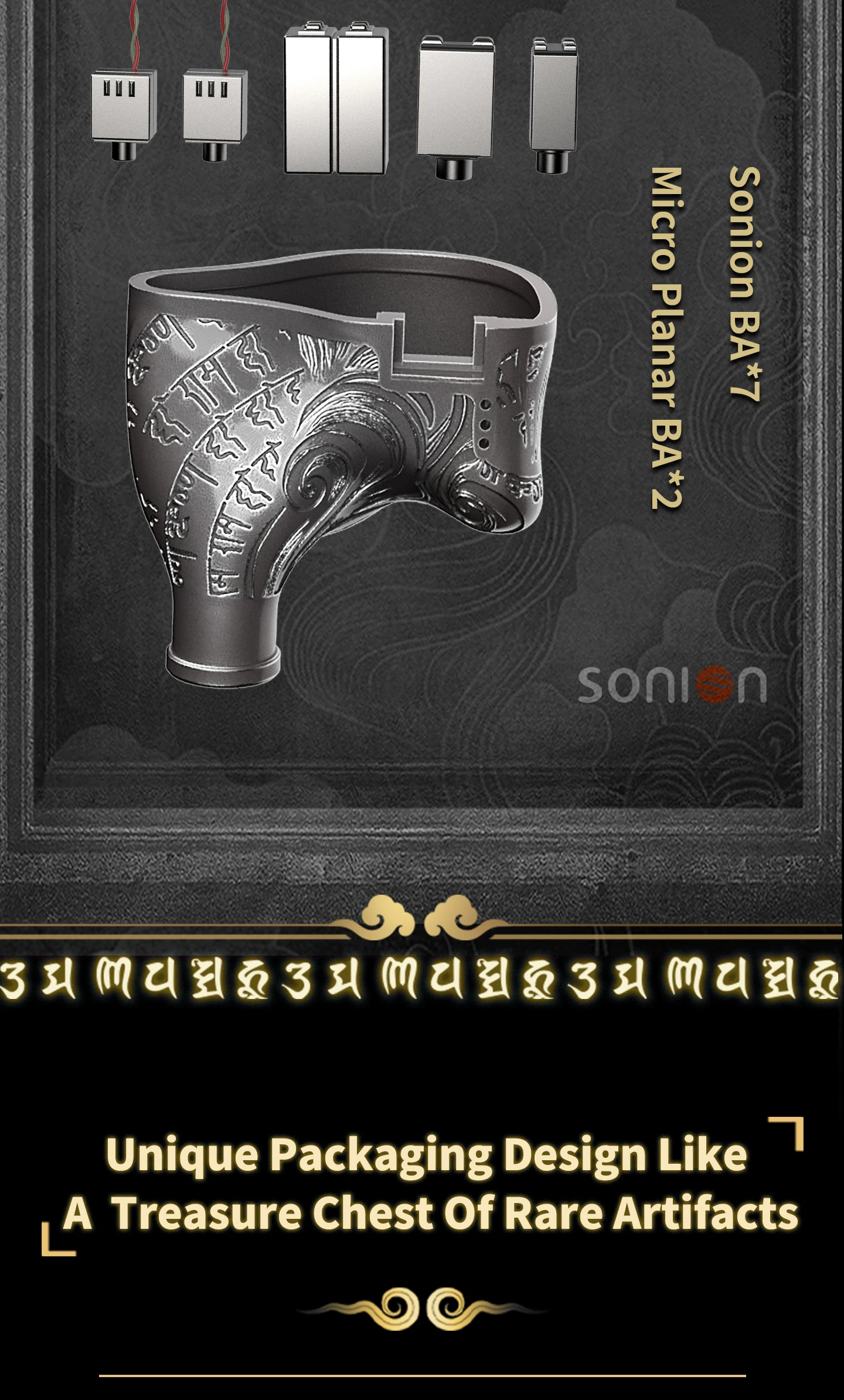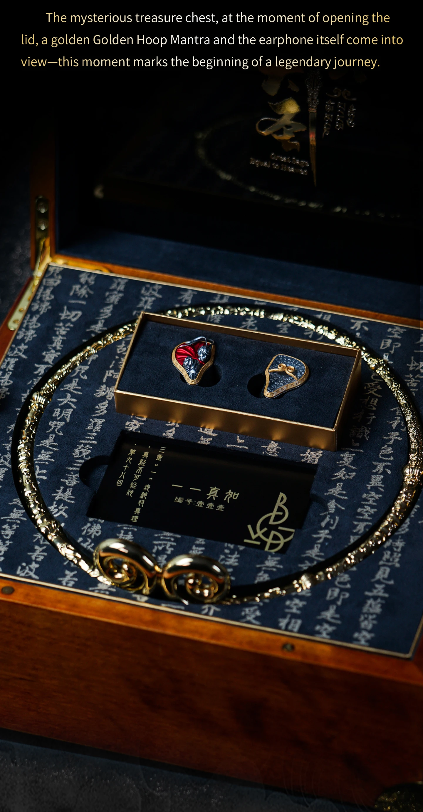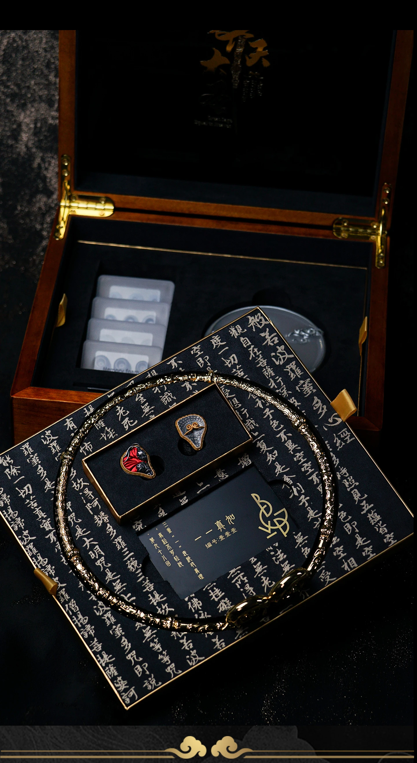 BGVP WuKong comes in a stunning package; it looks like a treasure chest full of rare artifacts. Upon opening, the IEMs sit right on the front with the magical golden hoop and scriptures all around. The stock case is made up of high-end zinc alloy material with a perfectly solid handle. On the side, we have sutras engraved on the case. On the surface, we have a Buddha’s head looming in distant white mist, we also have an iconic presentation of WuKong along with his cudgel.