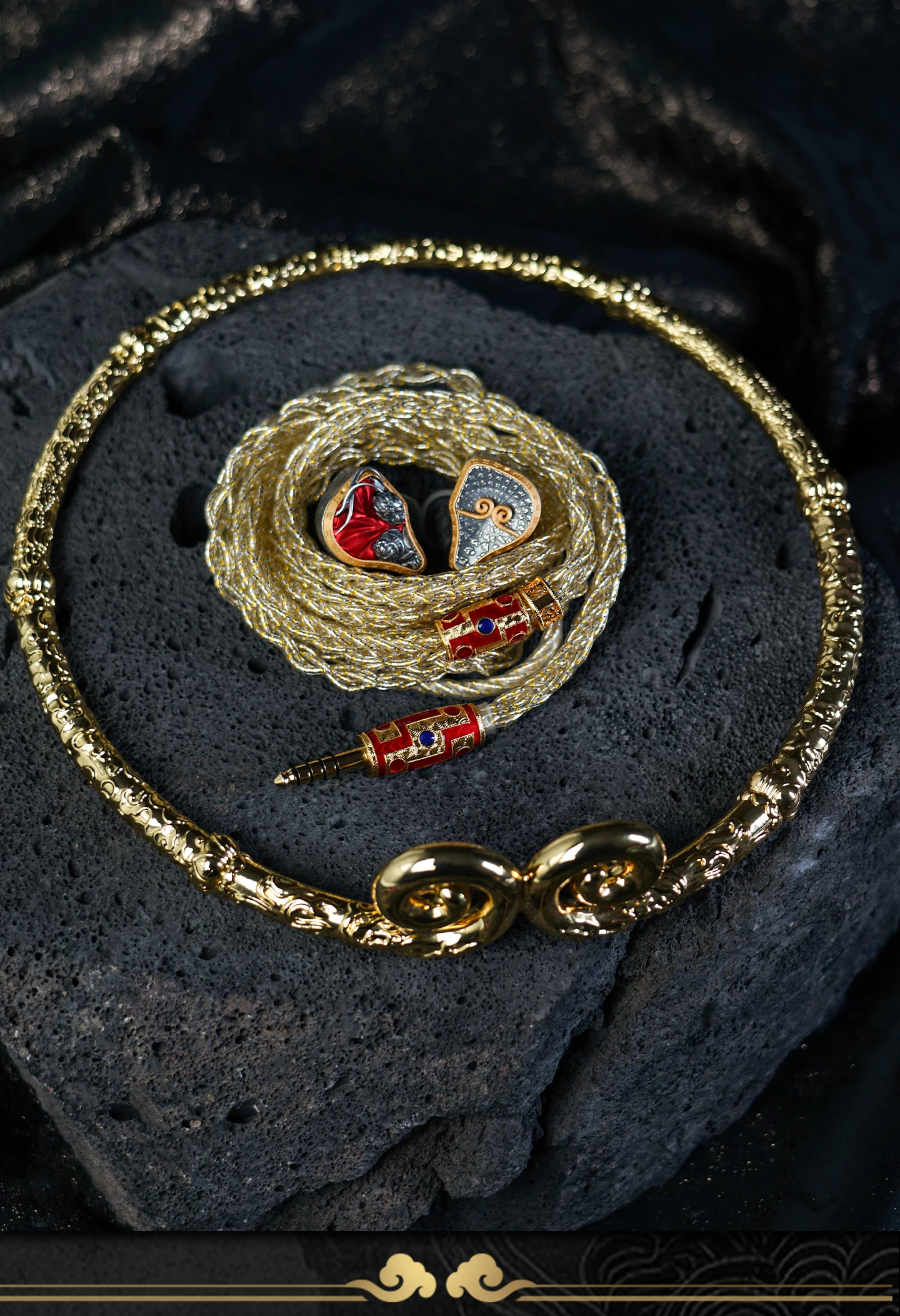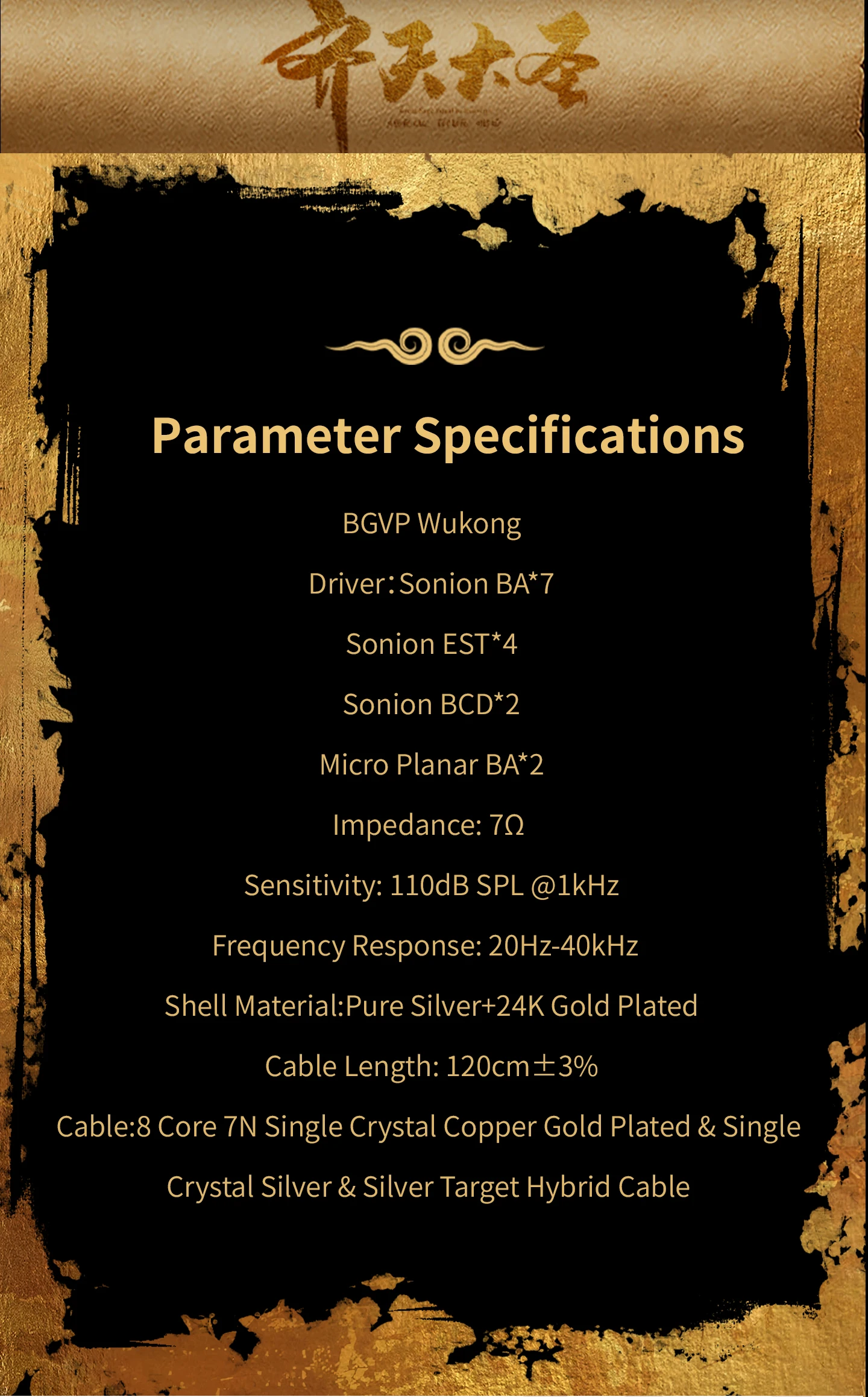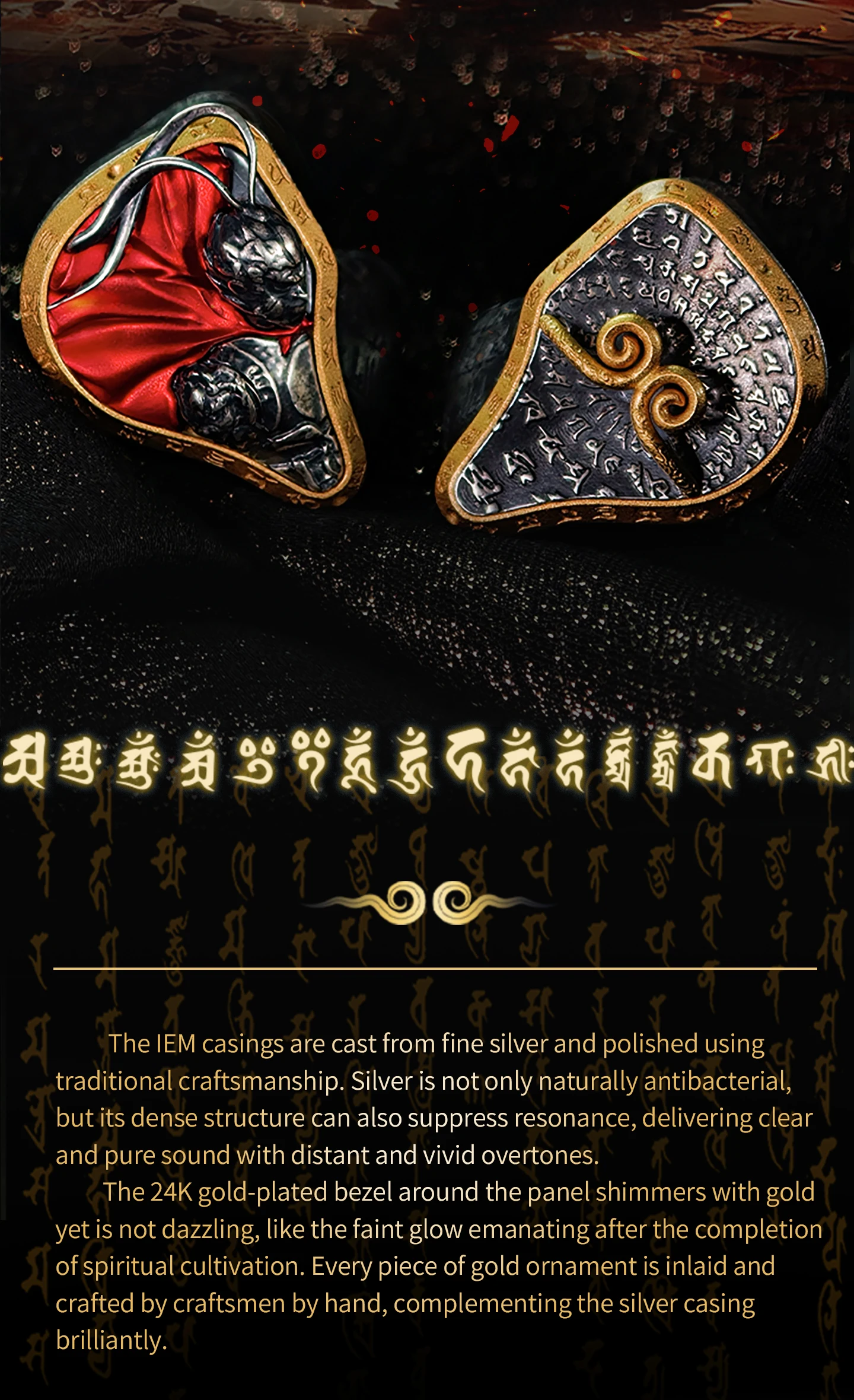BGVP WuKong tributes the legendary figure with its unique hand-engraved designer ear shells. The shells are crafted using 24K gold-plated pure silver material. Among common metals, Silver’s high-density construction effectively suppresses excessive resonance and significantly enhances the purity of the sound. Every piece of gold ornament is inlaid and crafted by hand. As for the design, WuKong stands in combat with two pheasant features and a red cloak, this is featured on one side face covers, while the other side features the Golden Hoop mantra surrounded by scriptures again hand-carved to perfection. BGVP WuKong packs a truly enigmatic and iconic design on the ear shells.