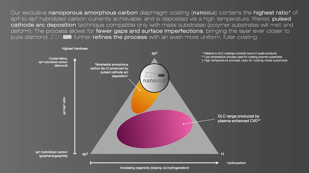 DLC Diaphragm is a common site in HiFi IEMs. But the DUNU Zen Pro features their patented Nanoporous Amorphous Carbon Diaphragm commonly known as NanoDLC. No, it's not nano in size, rather this is among the biggest diaphragm coils you will see in today's IEMs. it has the highest ratio of hybridized carbon currently achievable deposited via a high-temperature technology. It has a fine, smooth texture with fewer gaps and surface imperfections. This helps the Zen Pro deliver what it promises, an exceptional listening experience with great clarity and precision.