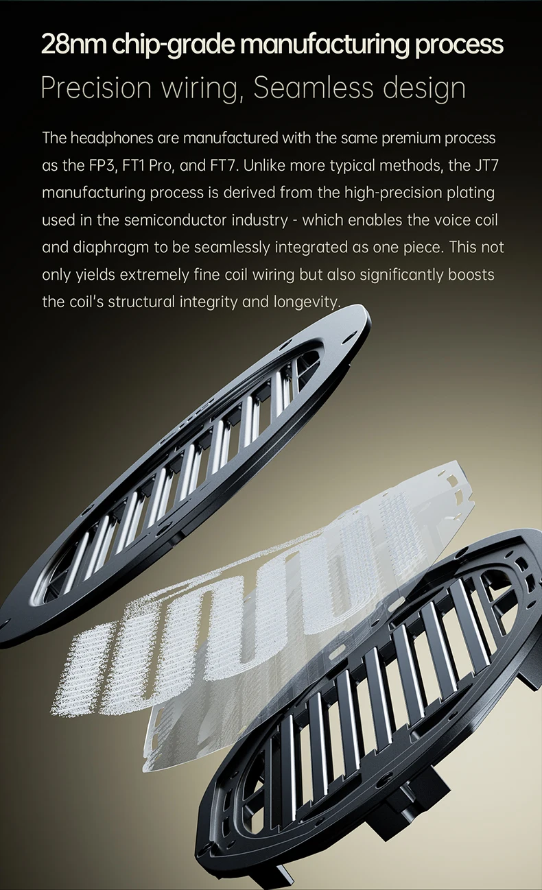 FiiO has crafted the JT7 with ultimate level precision. FiiO has utilized a 28nm chip-grade manufacturing process to achieve a seamless integration between the Voice coil and the Diaphragm. This not only yields extremely fine coil wiring but also boosts the structural integrity and durability of the driver.