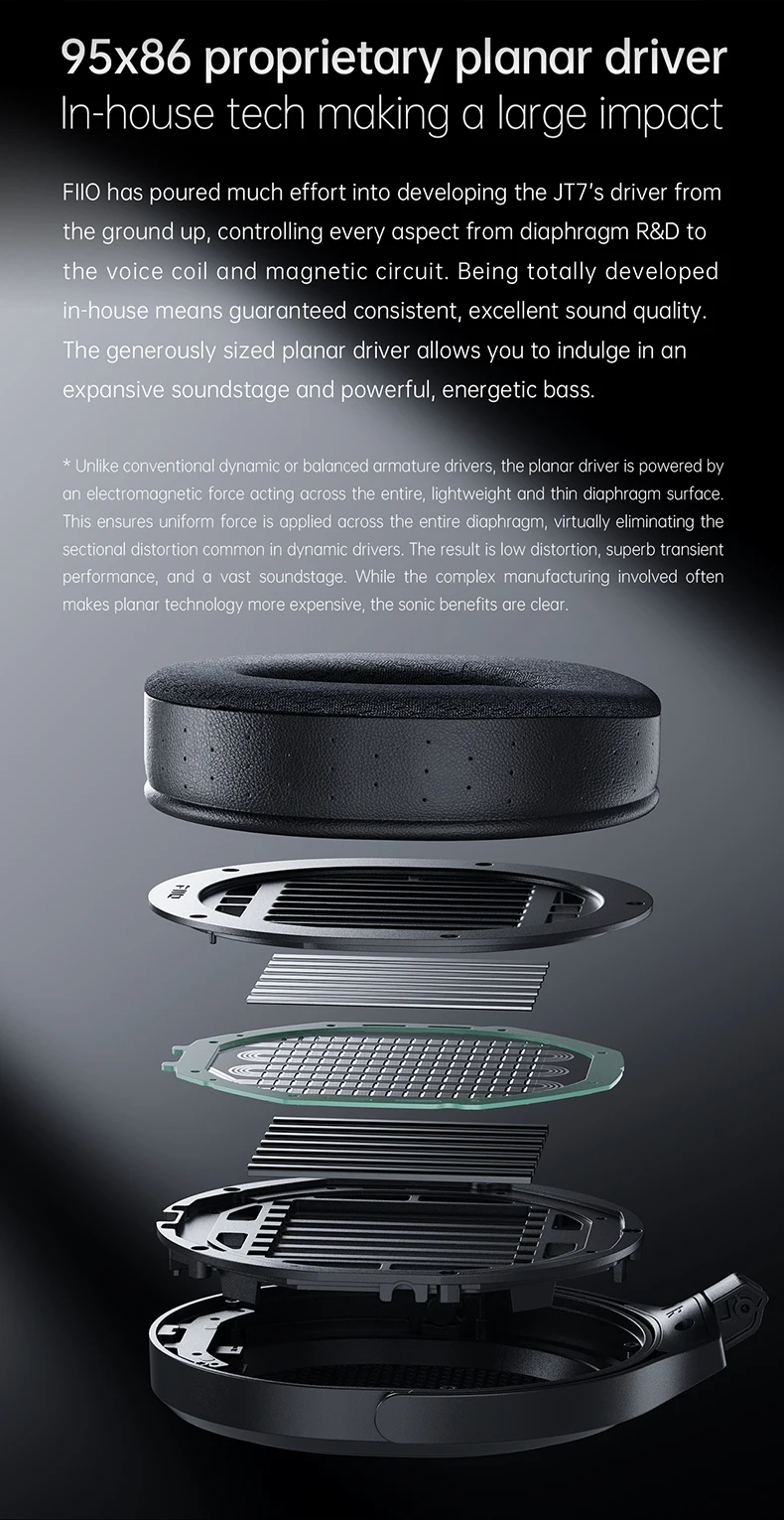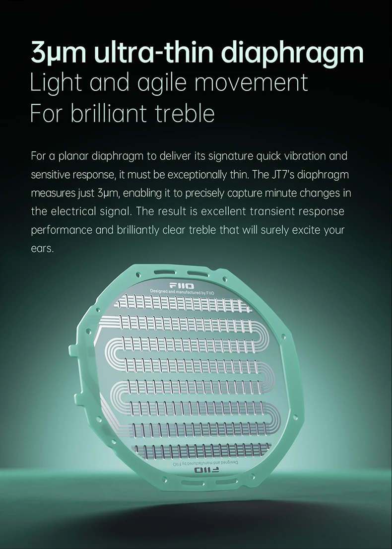 FiiO has developed a large 95x86mm planar magnetic driver for the JT7. This driver is designed from the ground up with in-depth R&D for different components, including the diaphragm, voice coil, and magnetic circuit. Being totally in-house developed, the driver has guaranteed consistency and promises excellent sound quality. It utilizes a 3µm ultra-thin diaphragm that offers light and agile movement, ensuring crystal clear sound response across a wide frequency range.
