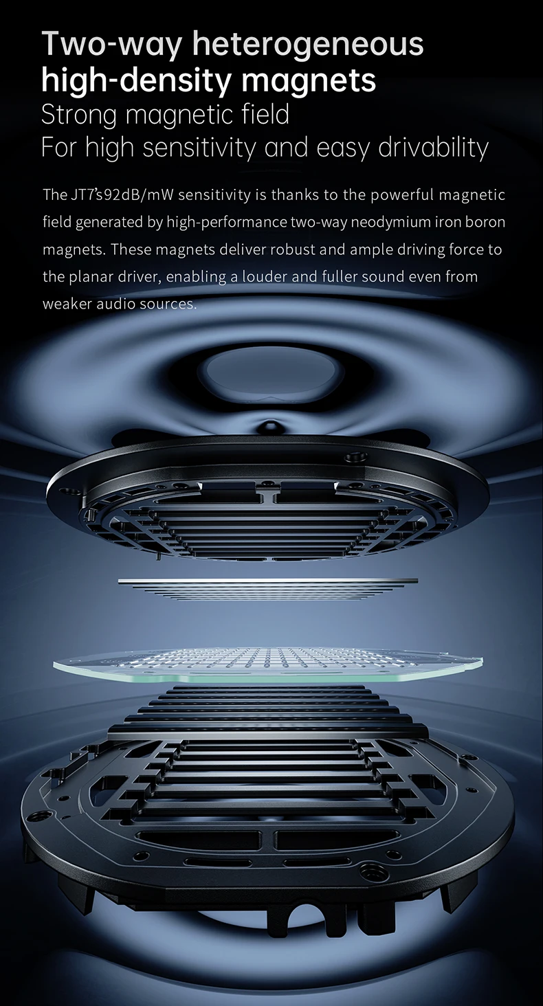 FiiO JT7 features a strong and sensational magnetic architecture. The pair adopts two-way heterogeneous high-density magnets that generate a strong magnetic field, ensuring greater efficiency with the pair. The JT7 achieves a high-sensitivity design. These magnets deliver robust and ample driving force to the planar driver, enabling a loud and fuller sound from even moderate sources. You don’t need high-end DAC/AMPs to get the best out of the FiiO JT7, with its high-sensitivity and low-distortion design, enjoy the pair as you like!!