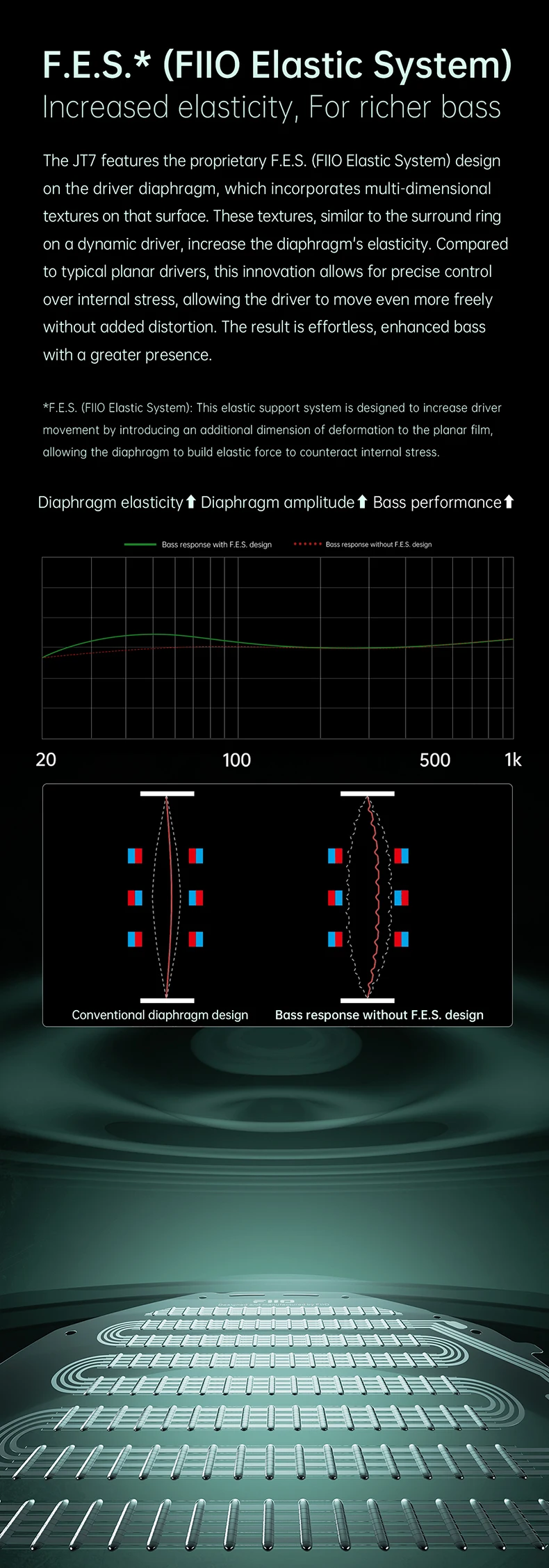 FiiO JT7 features FiiO’s self-developed F.E.S(FiiO Elastic System) design on the driver diaphragm. It incorporates multi-dimensional textures on the surface, which are similar to the surround ring textures on a dynamic driver. This unique and innovative technology increases the diaphragm’s elasticity. Compared to traditional planar drivers, this innovation allows for precise control over internal stress, resulting in swifter movement, ensuring rich and dynamic bass response. The bass is punchier and has lower distortion compared to traditional planar drivers.