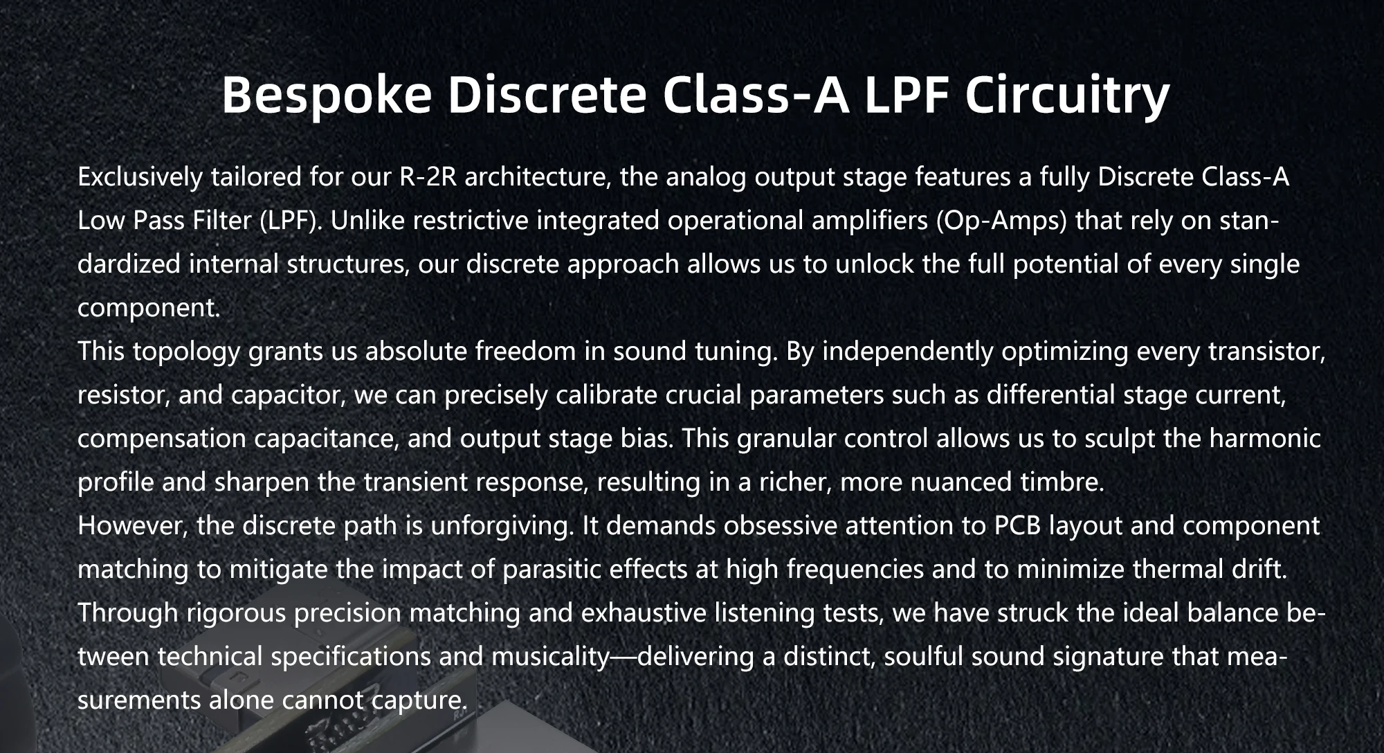 At the heart of the R26II lies a fully discrete R2R resistor ladder network, a "purist" approach to digital-to-analog conversion. Unlike Delta-Sigma DACs, which rely on high-frequency modulation and noise-shaping, R2R performs a direct and instantaneous conversion of digital signals to analog, delivering a cleaner, more natural sound. This design eliminates digital artifacts, ensuring a highly accurate and organic audio experience. The result is a sound signature that is rich, smooth, and distinctly analog.