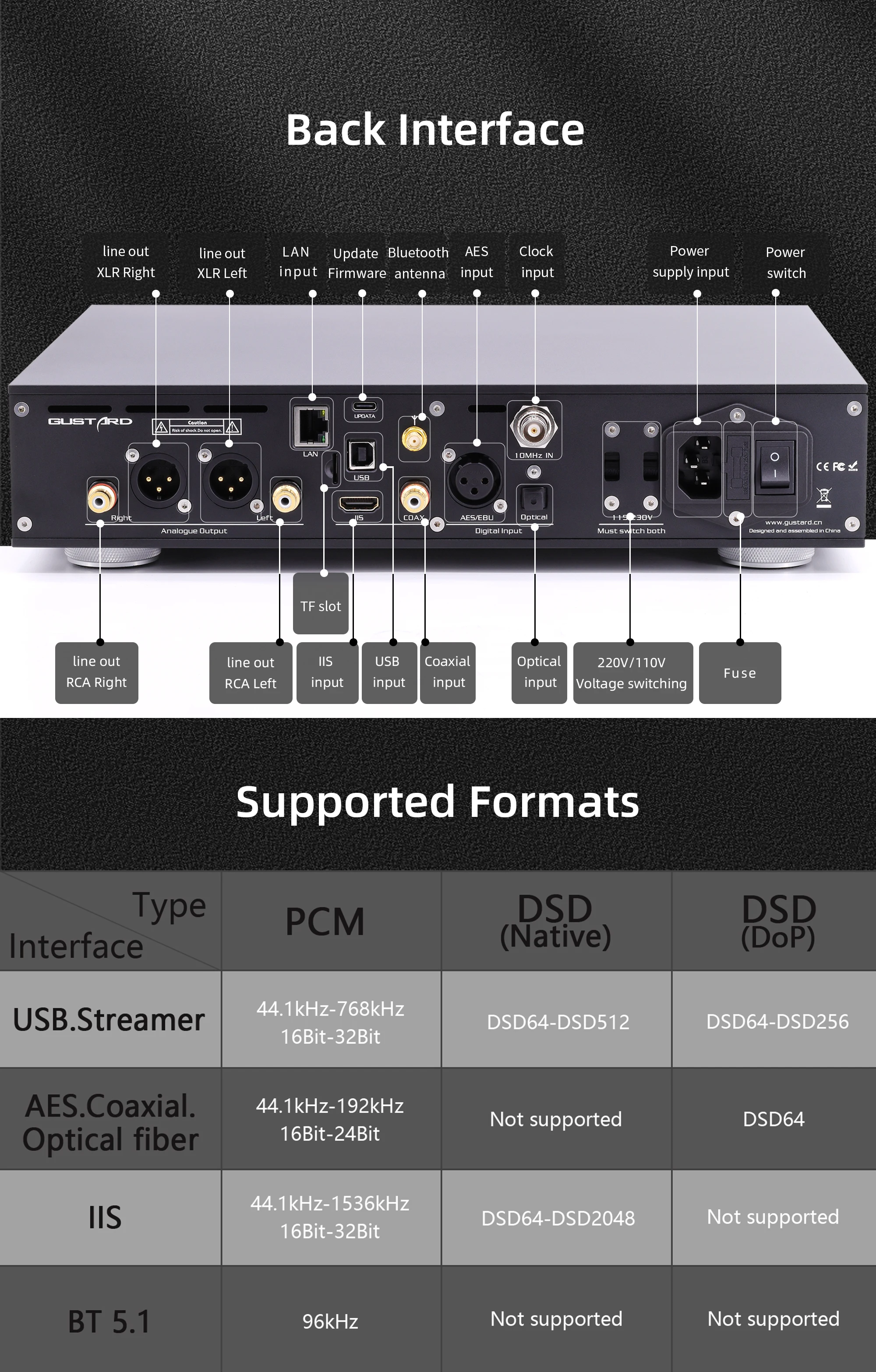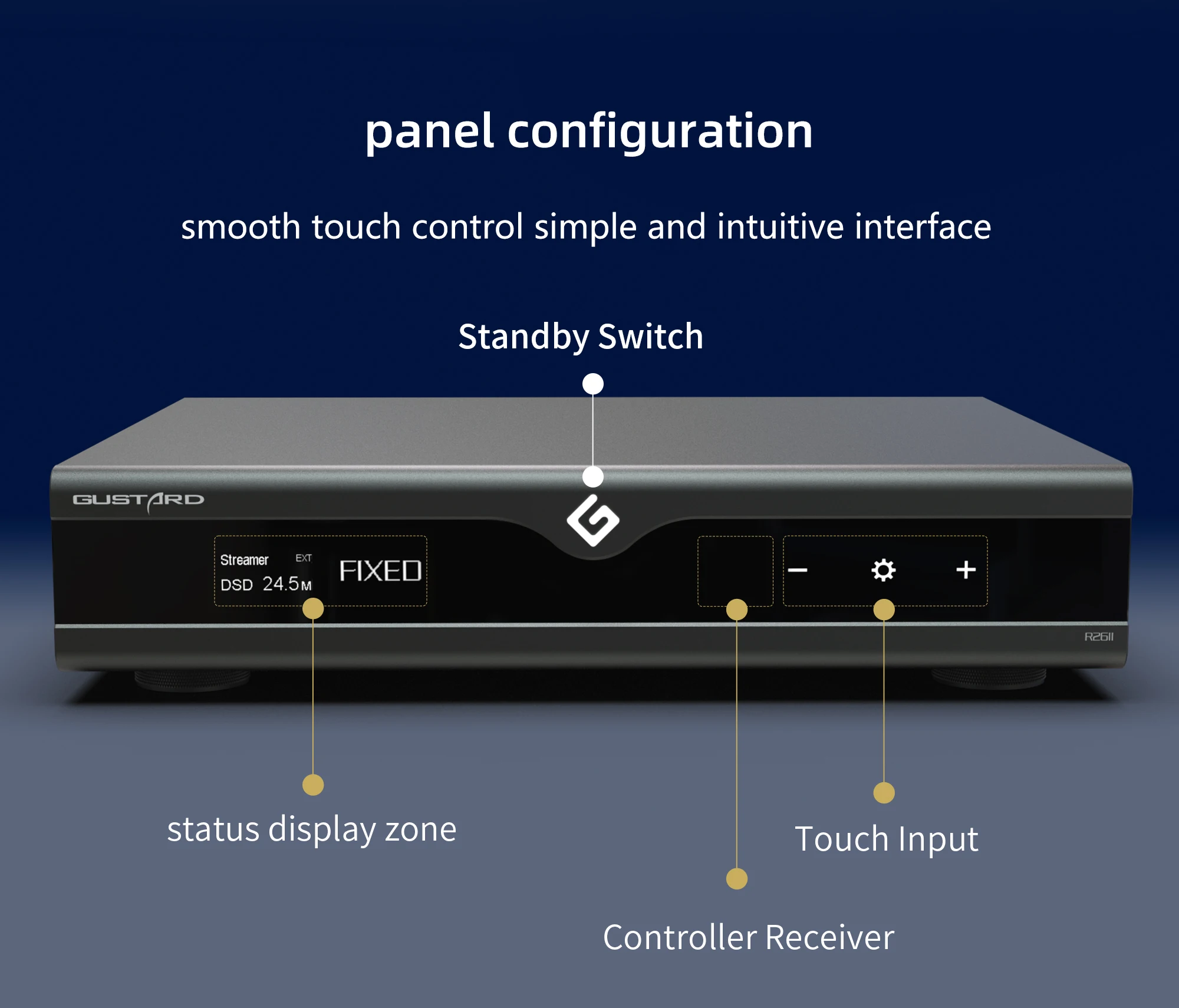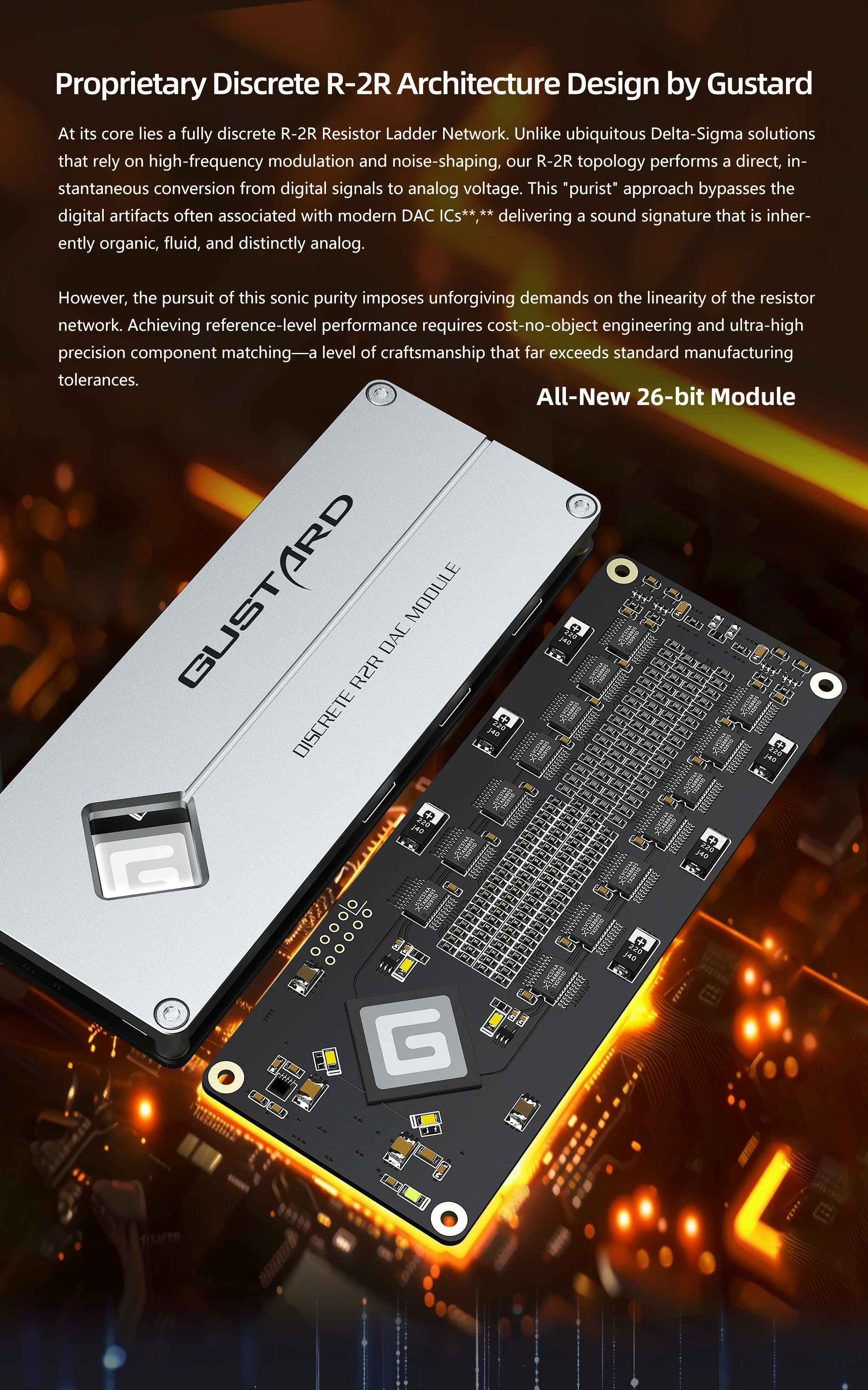 The GUSTARD R26II features a native 1-Bit DSD DAC, supporting up to DSD2048 through the I2S interface. This allows for an astonishing 32x the resolution of standard SACD (DSD64), delivering extraordinary dynamic range, clarity, and detail. By bypassing any internal PCM transcoding or DSP manipulation, it ensures a "pure" signal path that preserves the full depth and atmosphere of the original recording. Whether you're listening to high-resolution files or classic recordings, the R26II reproduces music with unmatched realism and depth.