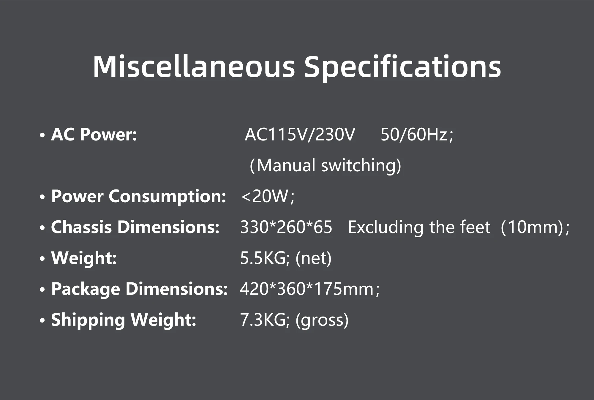 AC Power: AC115V/230V, 50/60Hz (Manual switching)