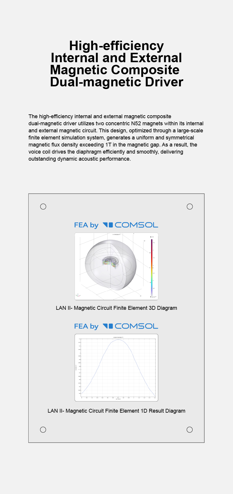 In order to get the best out of the new glass-dome diaphragm dynamic driver, Lan 2 IEMs feature a high-efficiency dual magnetic circuit, including both internal and external magnetic setups on the driver. It produces a strong magnetic flux that results in a high-sensitivity design, fast transient performance, and also enhances the lower-end performance.