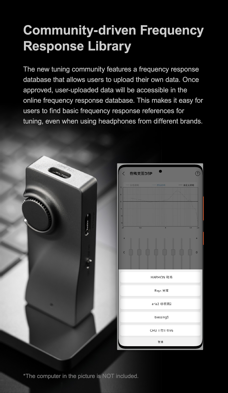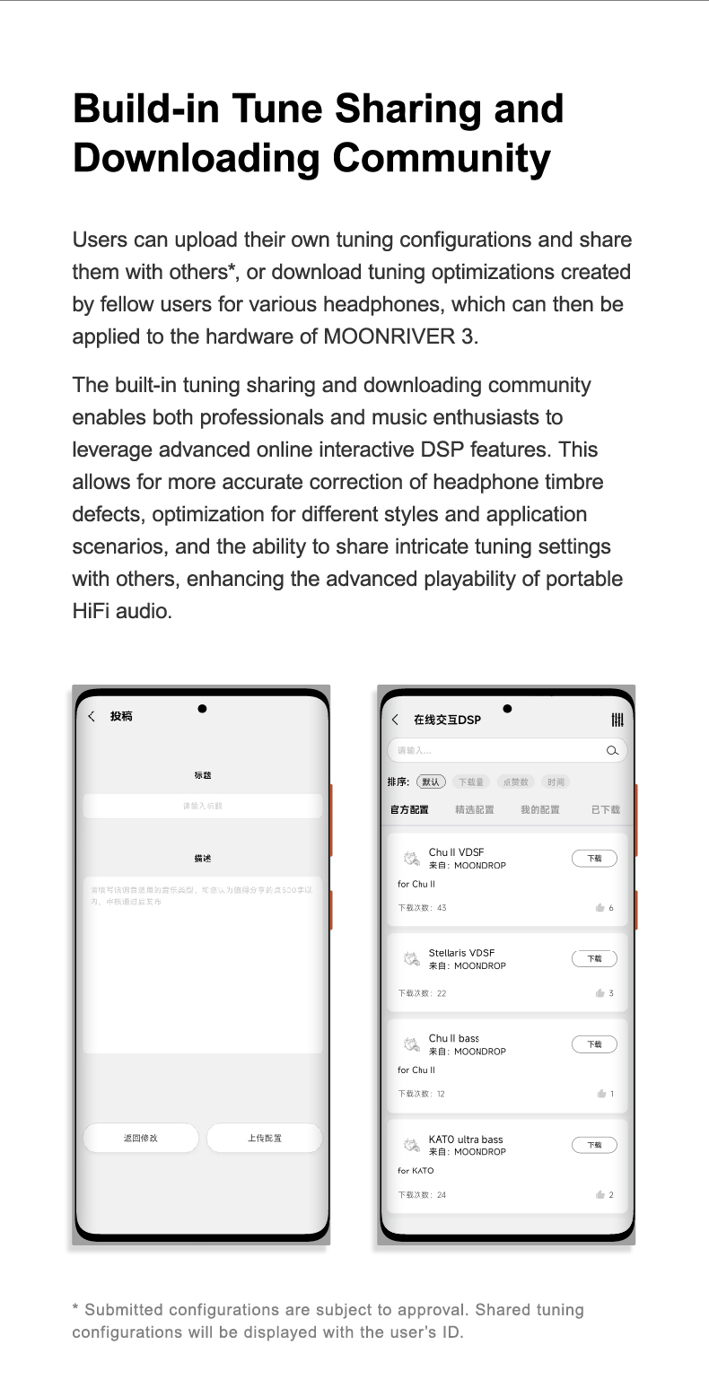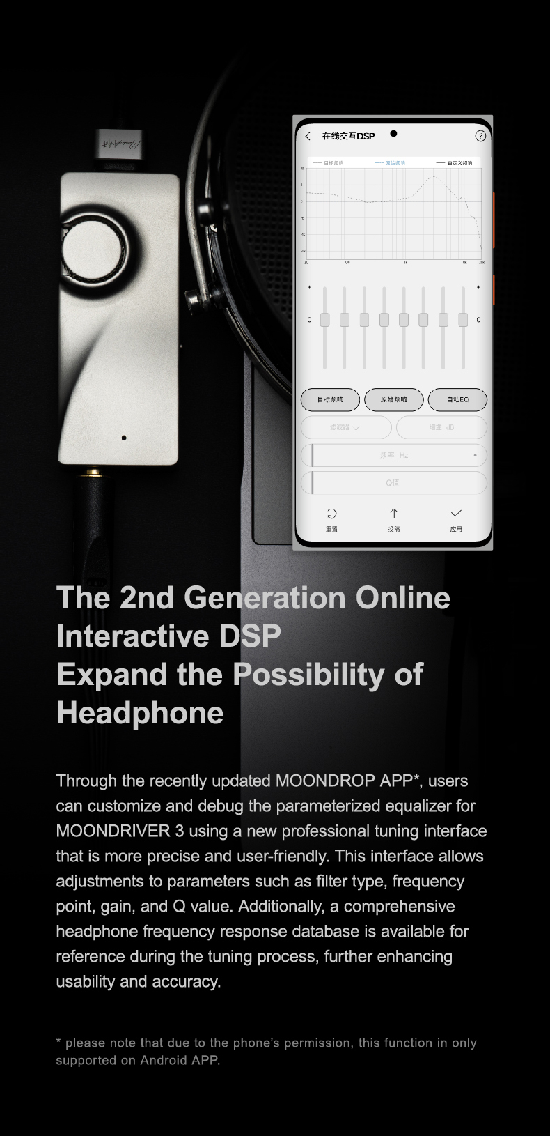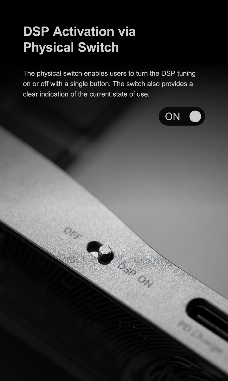 Through the Moondrop Application, users can customize the sound output of the Moonriver with a dedicated Parametric Equalizer(PEQ). The PEQ has a new tuning interface which is more precise and user-friendly. Users can adjust filter type, gain level, frequency point, and Q factor. The application also has a built-in community where users can share/download different tuning configurations and share them with other users worldwide. Moondrop also has an online web software that allows for more professional and precise tuning compared to the mobile application. Additionally, the community sharing and download feature is also available on the web interface. Moondrop Moonriver 3 has a physical switch for one-button DSP on/off.
