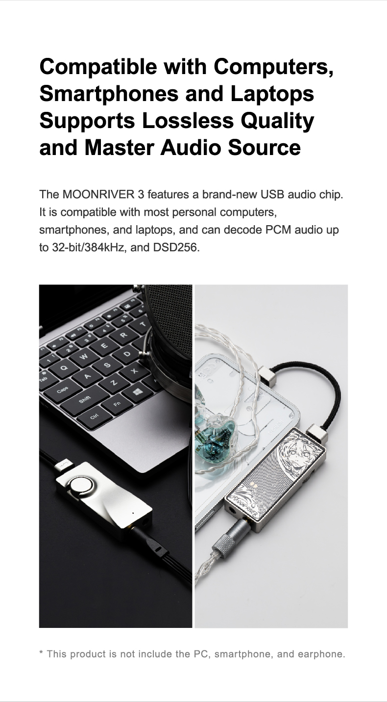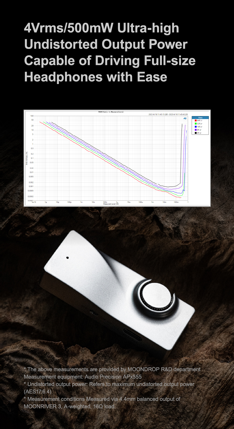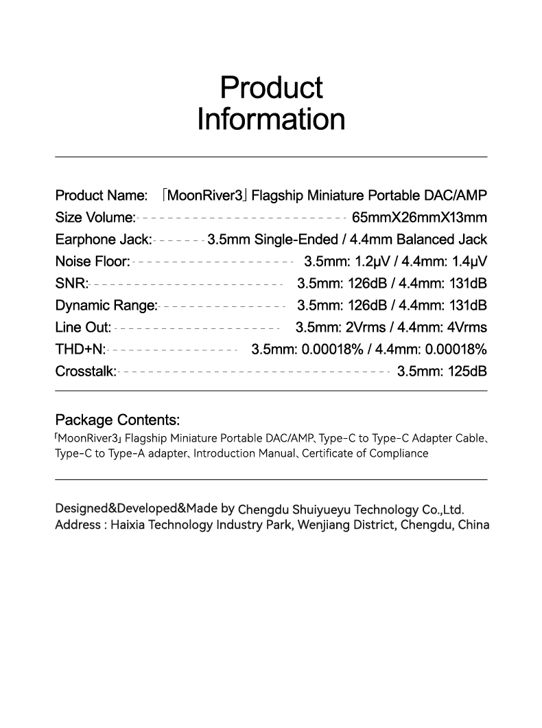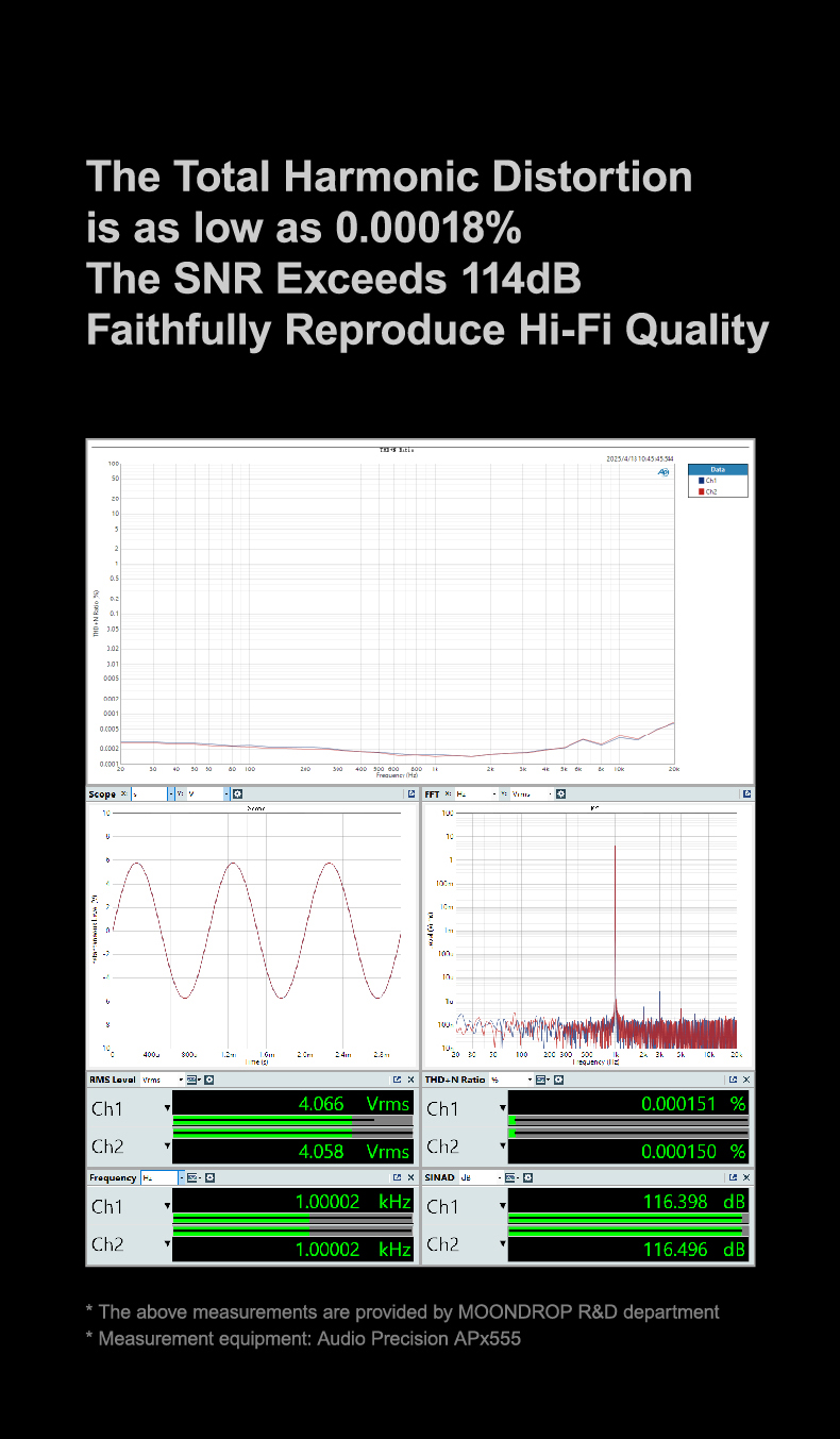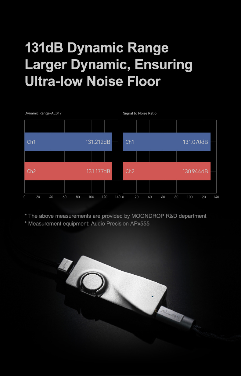 With high-end chipsets on the circuit, the Moondrop Moonriver 3 achieves a true high-fidelity sound output. It reaches 131dB dynamic range, ensuring a crystal clear background with ultra-low noise floor. The SNR and THD+N values are also very promising, Users will experience a pure high-resolution sound decoding with the DAC/AMP.