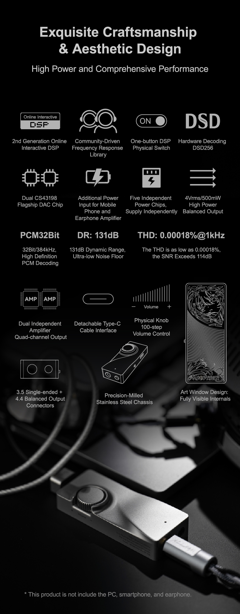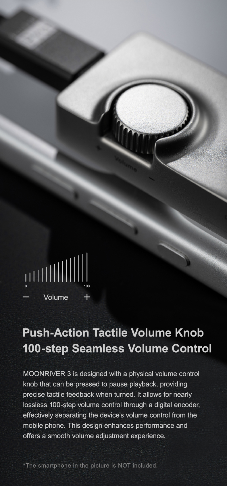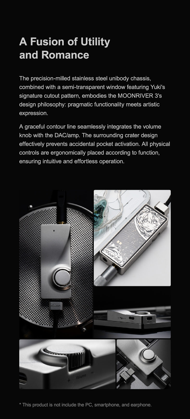 Moondrop welcomes the third-generation of its highly acclaimed portable DAC/AMP, the Moondrop Moonriver 3. Featuring a brand new design with a Precision-Milled Stainless Steel Chassis, independent volume knob, and state-of-the-art pattern on the transparent back panel. Moondrop has equipped the Moonriver 3 with a dual CS43198 DAC setup combined with dual independent amplifier chips, it not only provides crystal clear decoding, but also delivers a strong output on the go. With 3.5mm SE and 4.4mm Balanced output ports, users can pair their favourite set of in-ear monitors with the Moonriver 3 easily. The Moonriver 3 has independent power input where you can feed PD charging to your connected device. Moondrop Moonriver 3 also offers an expansive PEQ with its 2nd-generation interactive DSP functionality. It is fully compatible with Moondrop Link application, also opening doors to unlimited possibilities with the community-driven frequency-response library. Moondrop Moonriver 3 is the most versatile and high-performing portable DAC/AMP in Moondrop’s lineup. Upgrade your portable arsenal today with this masterpiece!!