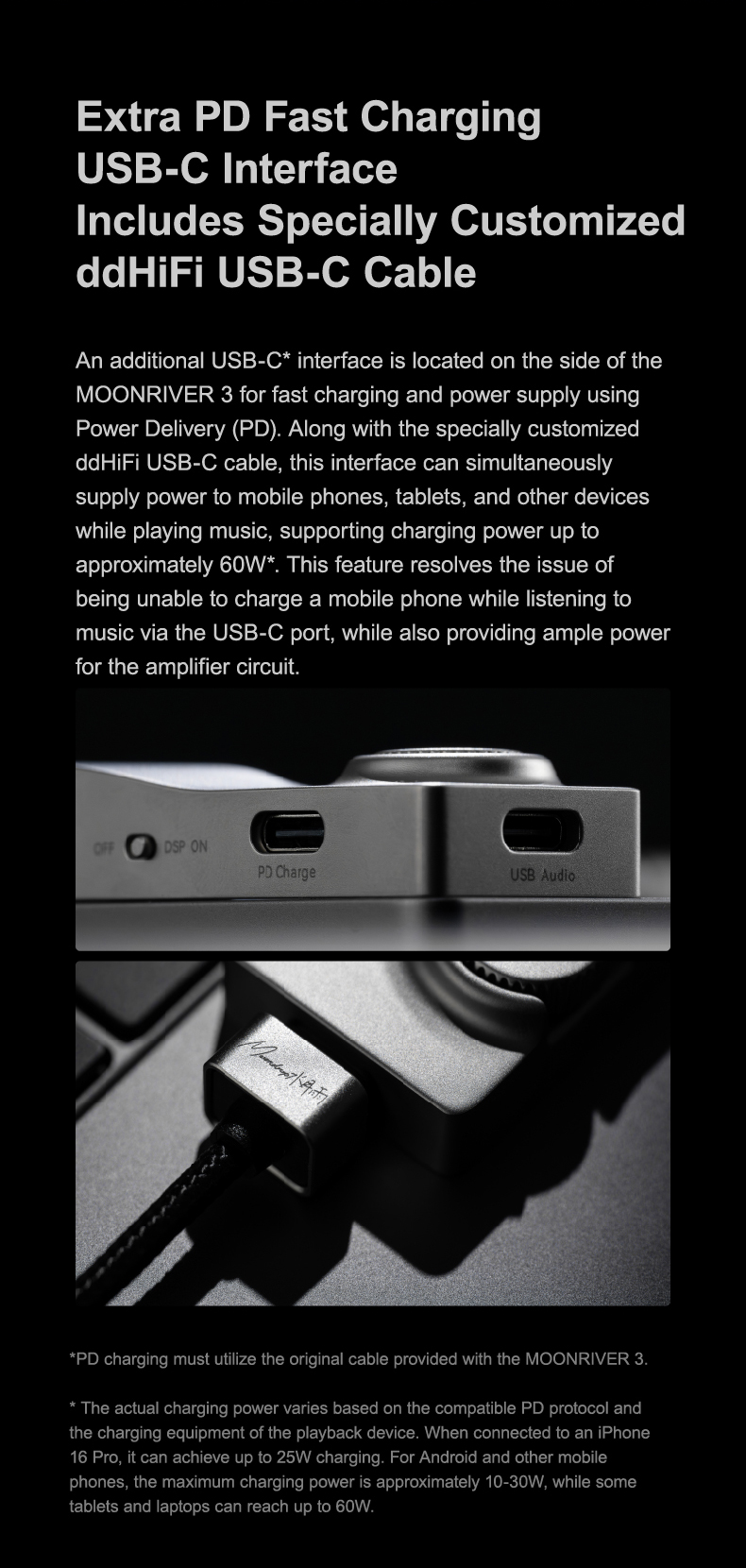 Moondrop Moonriver 3 has an additional Type-C port for independent power to the amp circuit and PD Charging support for the connected device. This port is only compatible with the included ddHiFi PD cable and supports up to 60W charging to your connected device(actual power input will depend on the connected device.