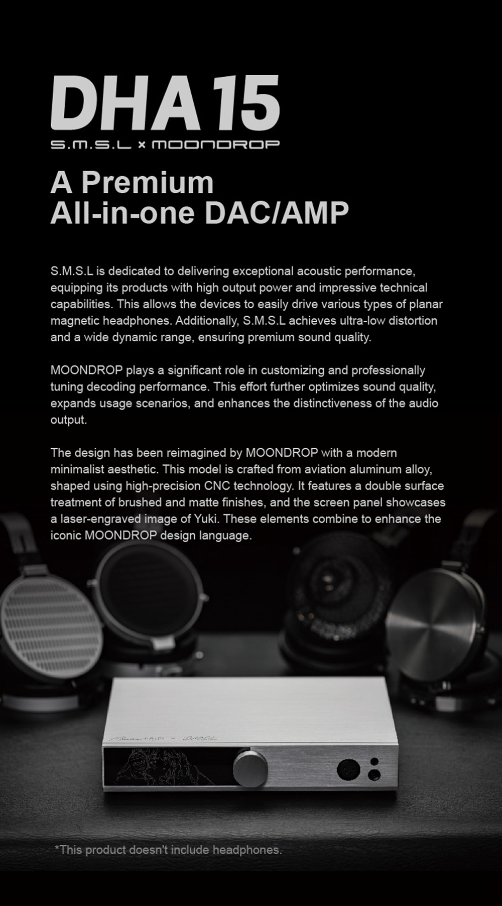 S.M.S.L and Moondrop, both are veterans of the HiFi audio industry. On one hand we have S.M.S.L, the brand that focuses on dedicated desktop audio gear, and on the other we have Moondrop, a fan-favorite brand in the audiophile market. Both the brands have years of expertience in designing products for audiophiles all over the world. The latest DHA15 is an impressive creation, it’s not just a powerful desktop all-in-one DAC/AMP, but also a versatile device that incorporates advanced multi-band PEQ and online community access through the Moondrop application support.