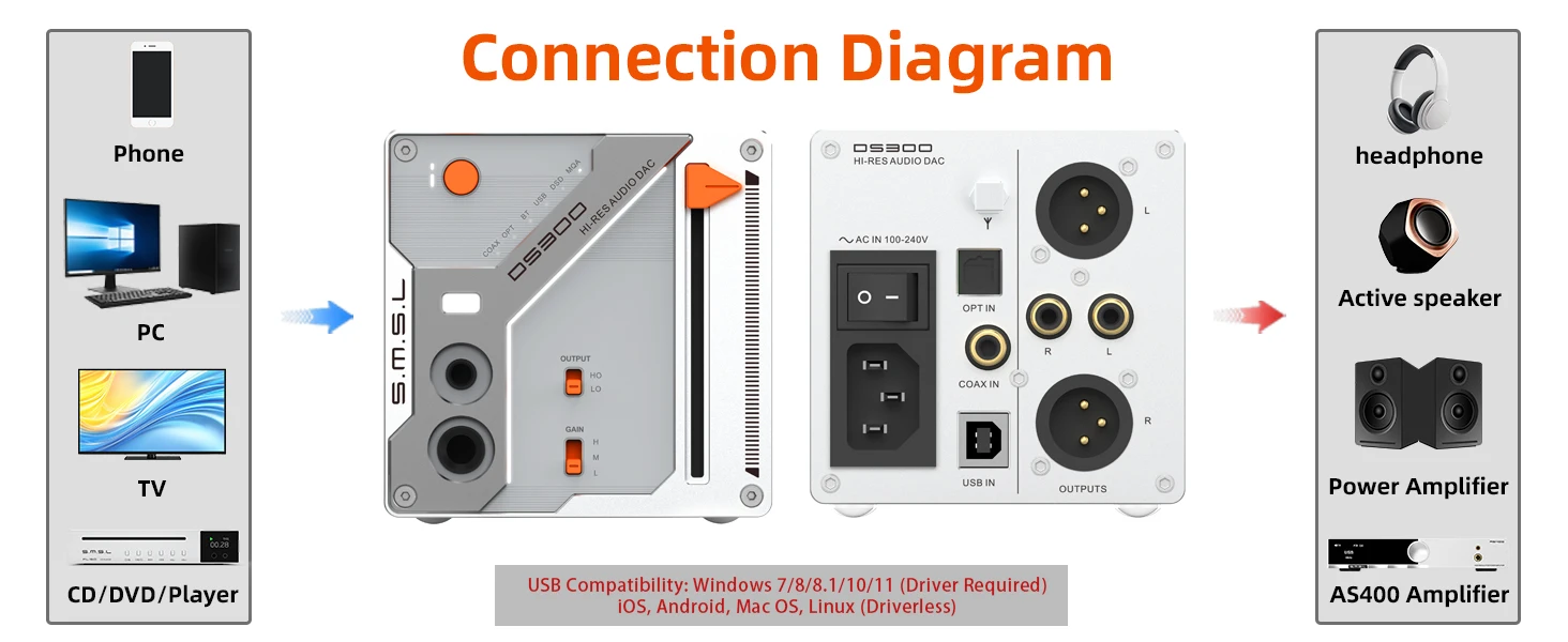Discover the SMSL DS300, a state-of-the-art DAC and headphone amplifier that delivers superior sound quality, customizable gain settings, and extensive connectivity options. Featuring low-noise power supplies, MQA support, and modern aesthetics, this device is perfect for audiophiles and music enthusiasts looking for a high-performance audio experience. Compatible with USB, Bluetooth, and more. Experience true audio perfection with the SMSL DS300.