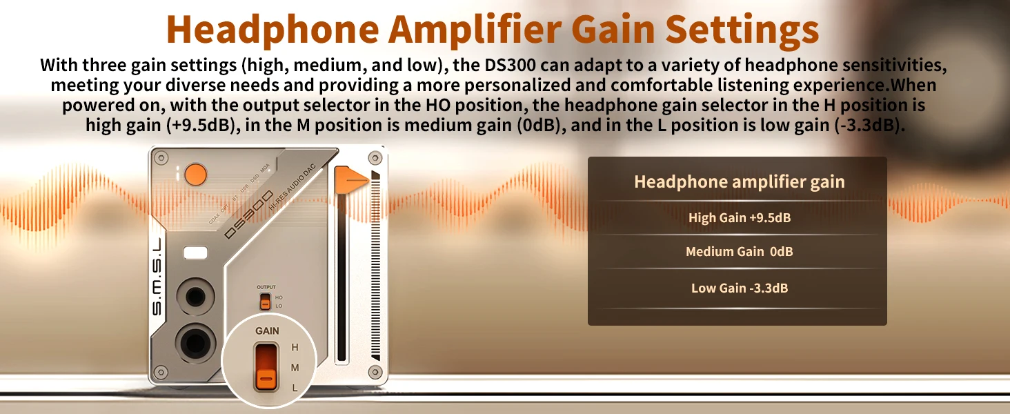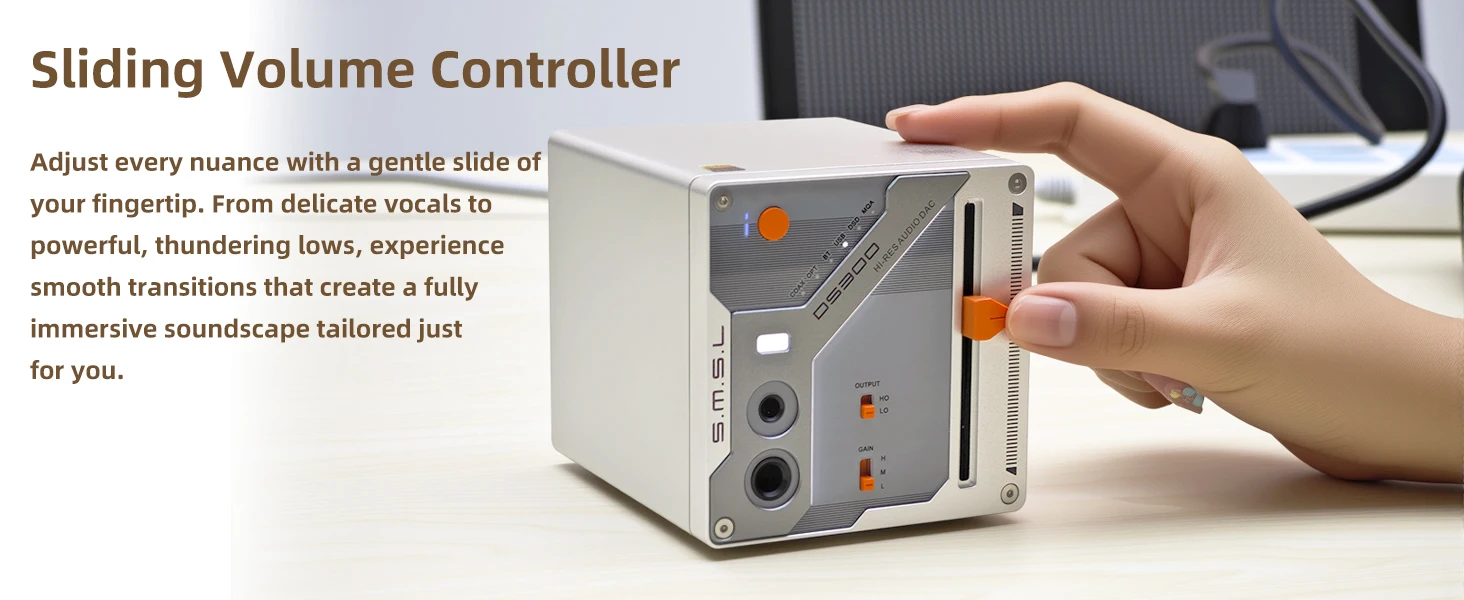 SMSL DS300’s cyberpunk design is well-equipped with extensive features. It has an LED indicator, volume slider, and gain mode slider. It has three gain modes: high gain(+9.5dB), medium gain(0dB), and low gain(-3.3dB).