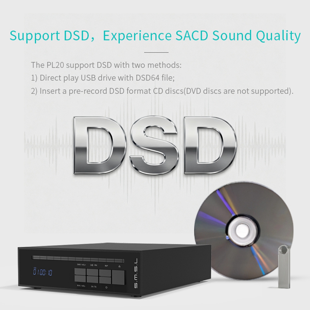 SMSL PL20 supports local music playback with USB flash drives. It even supports DSD with DSD64 files in the USB drive, or you can also use pre-recorded DSD format CD Discs. It provides an exceptional studio-grade music listening experience to its listeners.