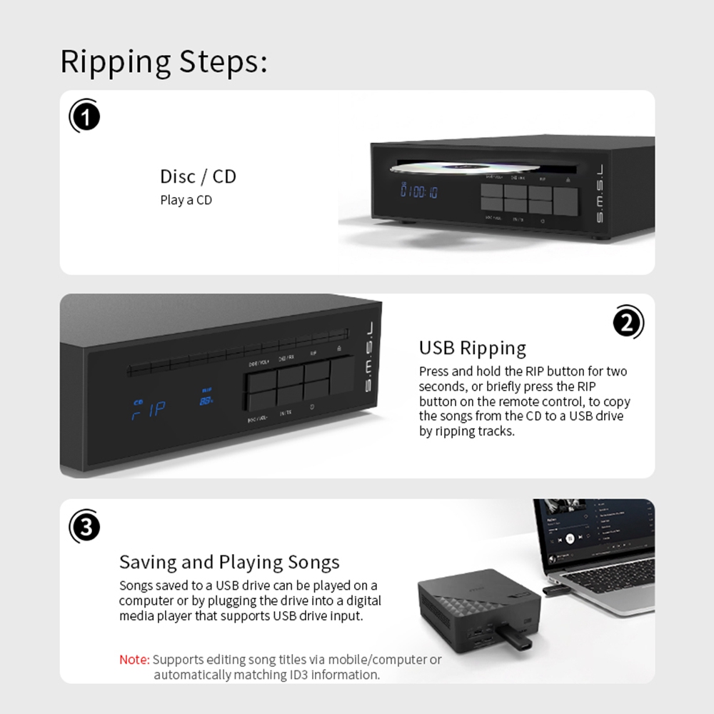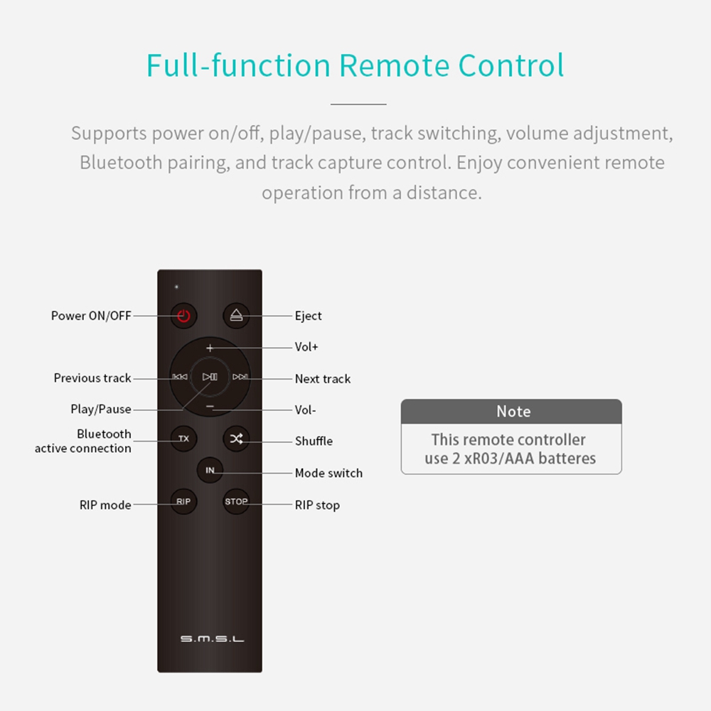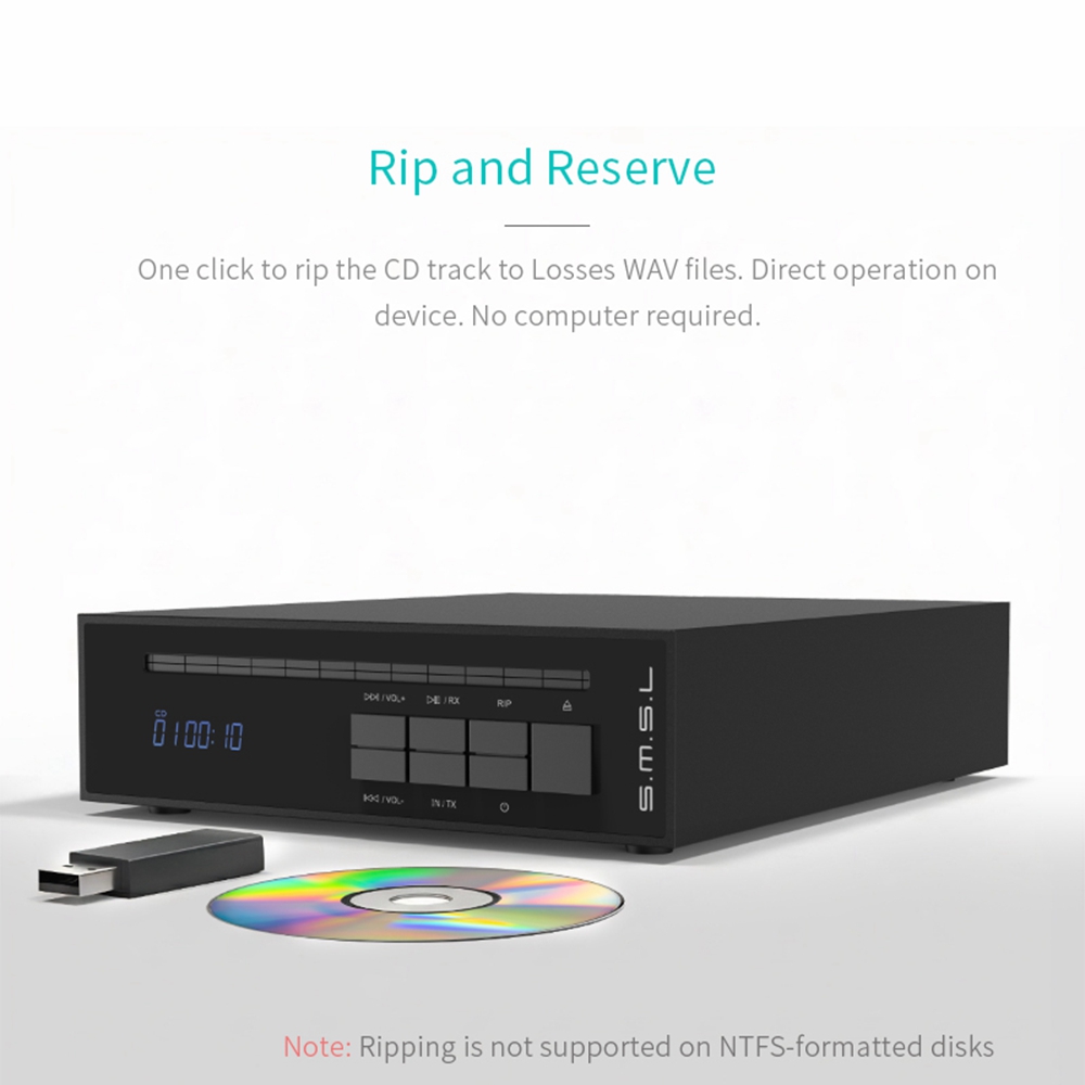 SMSL PL20 supports instant CD playback, simply insert a CD, and it will automatically play without any complex procedure. It also supports one key CD ripping, you can rip your favourite music from your CDs and save that music in digital format with you forever. One click to rip the CD to lossless WAV files.