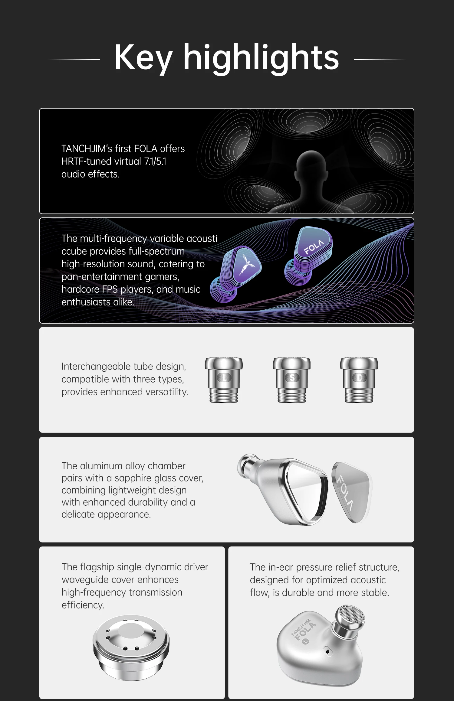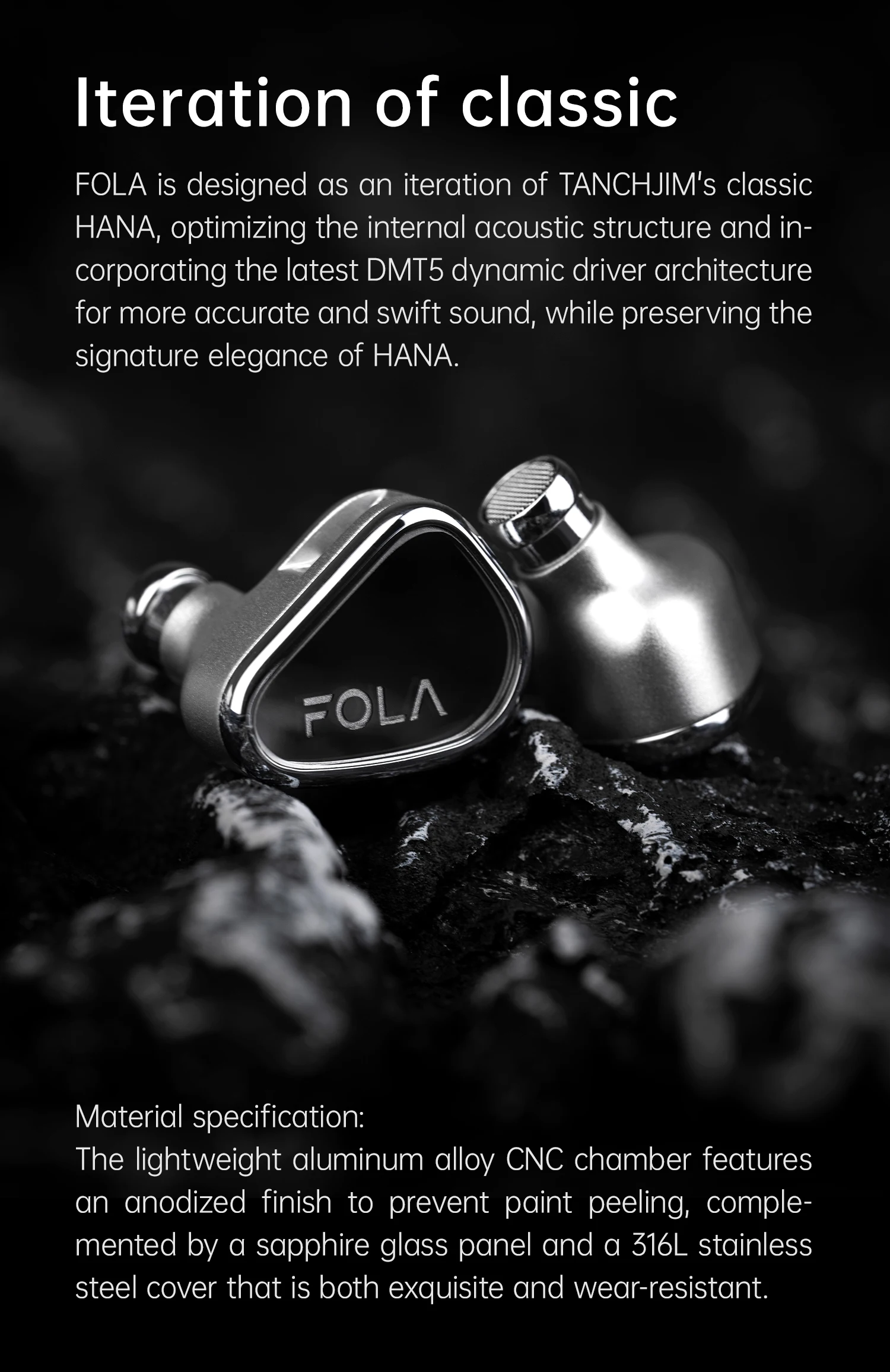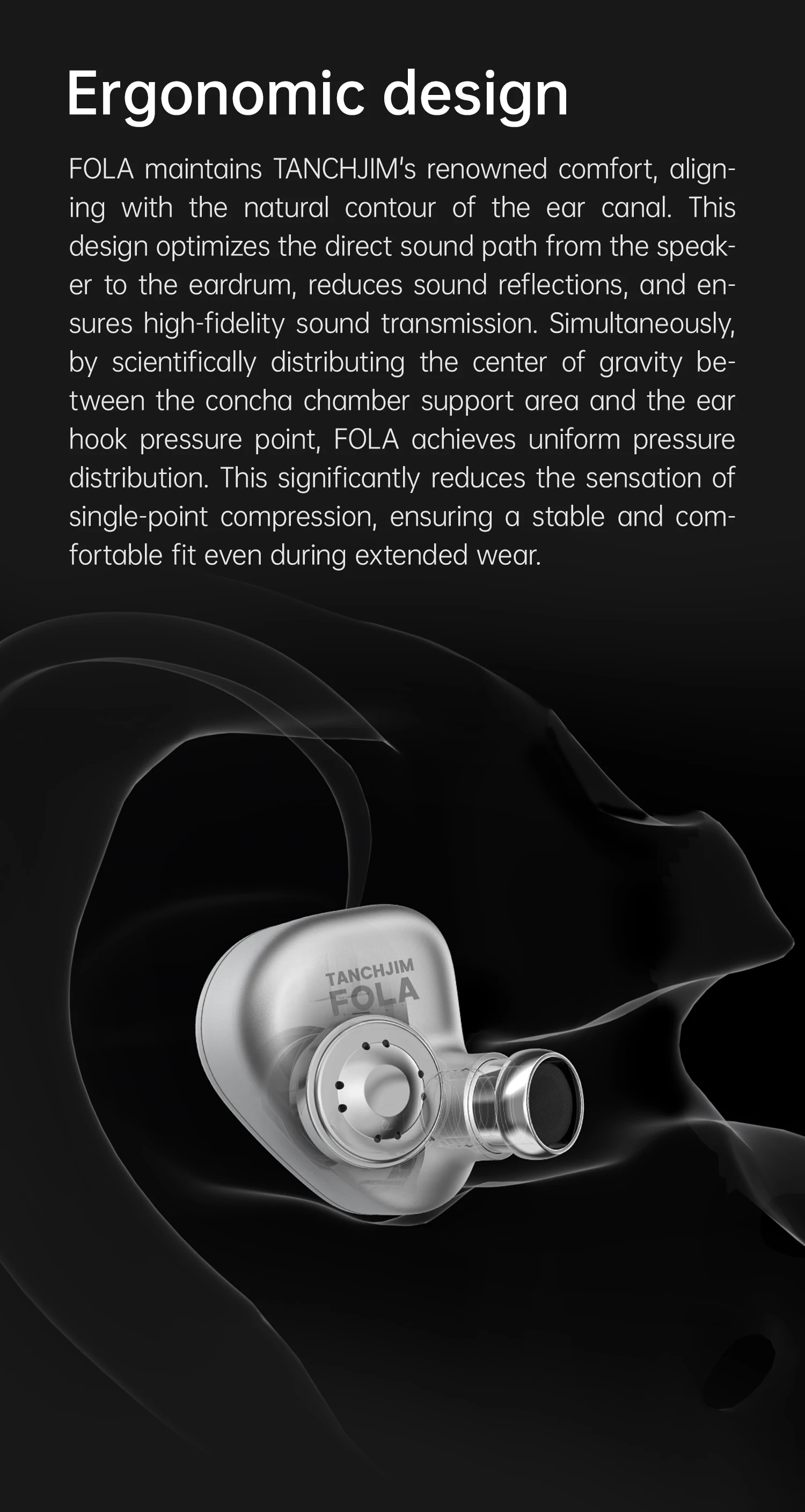 TANCHJIM FOLA integrates TANCHJIM's DMT5 architecture with a double-chamber, double-magnetic circuit dynamic driver to achieve high energy conversion efficiency and minimal distortion. This design ensures smooth, precise sound reproduction across a wide frequency range. Combined with the flagship single dynamic driver waveguide cover, FOLA provides a flawless high-frequency response, ideal for music enthusiasts, hardcore gamers, and movie lovers alike.