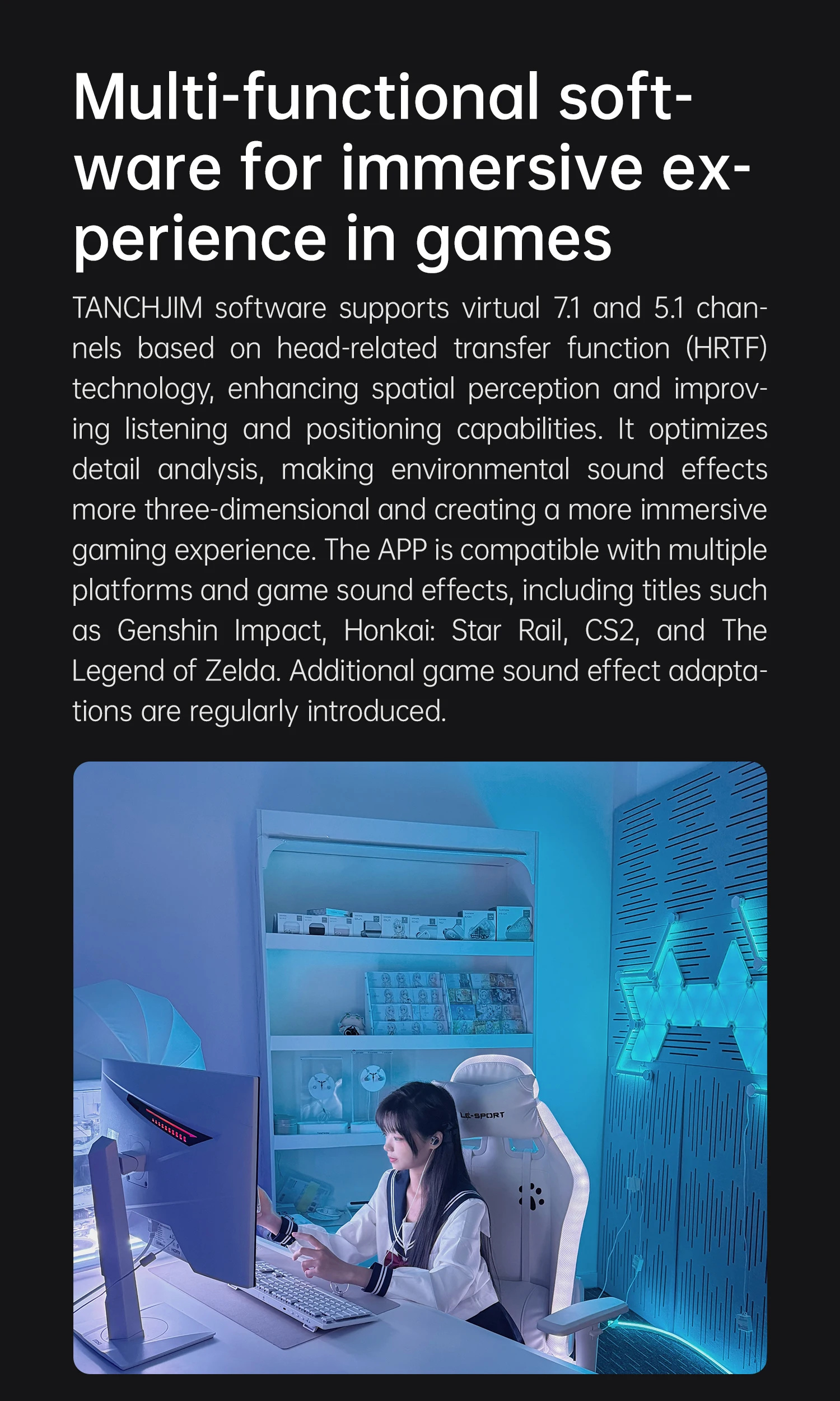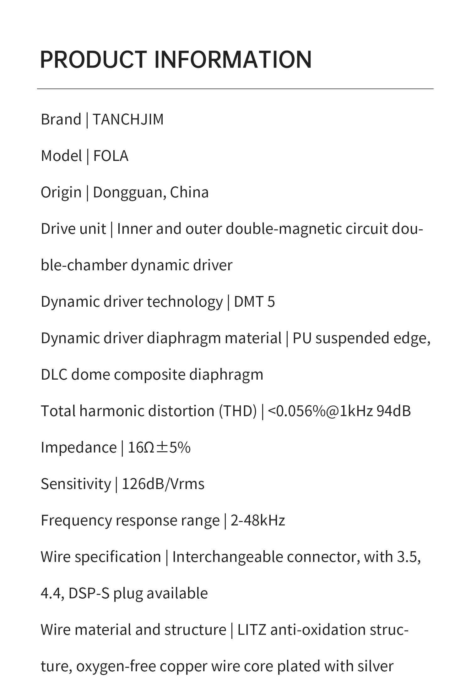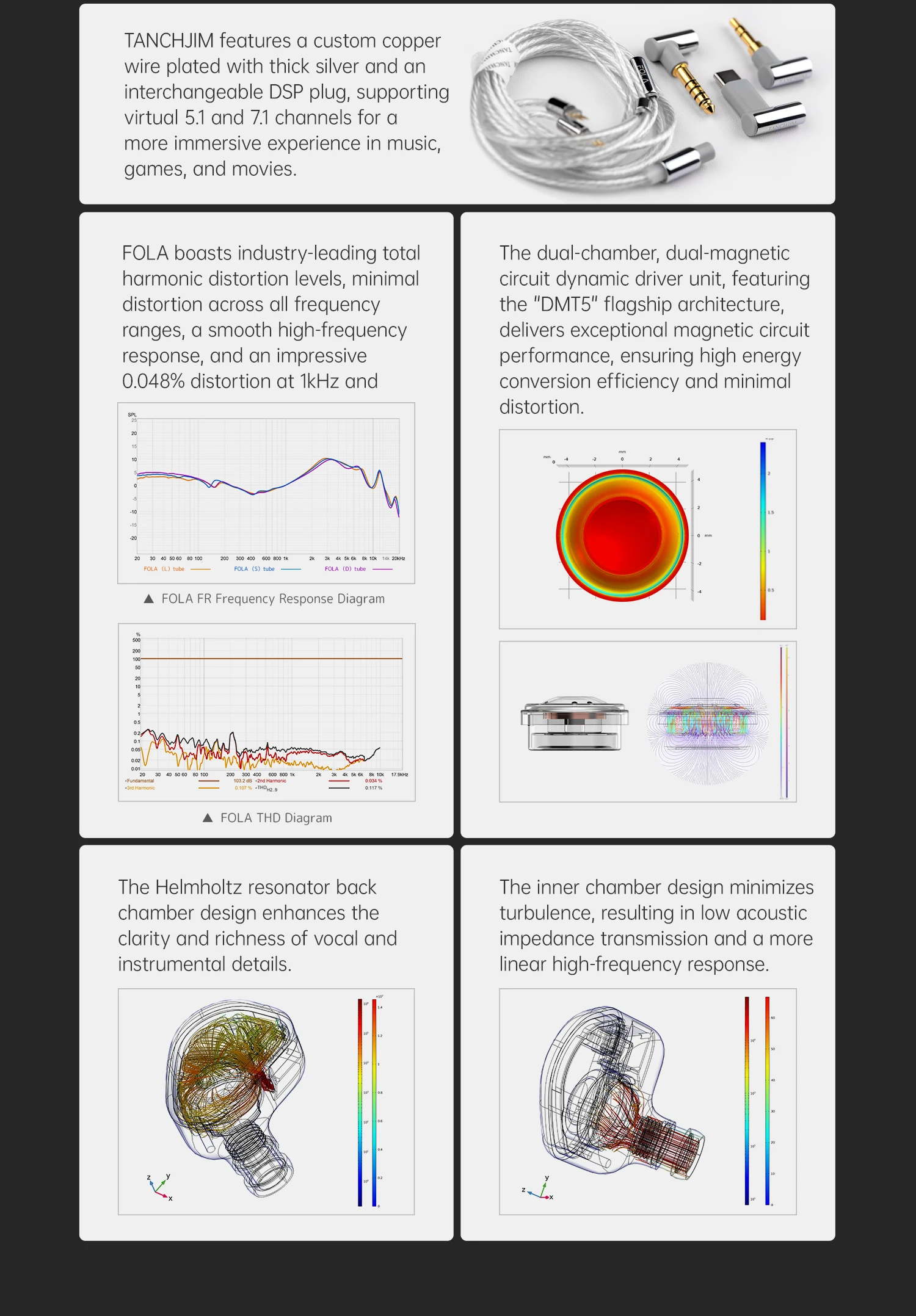 TANCHJIM FOLA integrates TANCHJIM's DMT5 architecture with a double-chamber, double-magnetic circuit dynamic driver to achieve high energy conversion efficiency and minimal distortion. This design ensures smooth, precise sound reproduction across a wide frequency range. Combined with the flagship single dynamic driver waveguide cover, FOLA provides a flawless high-frequency response, ideal for music enthusiasts, hardcore gamers, and movie lovers alike.