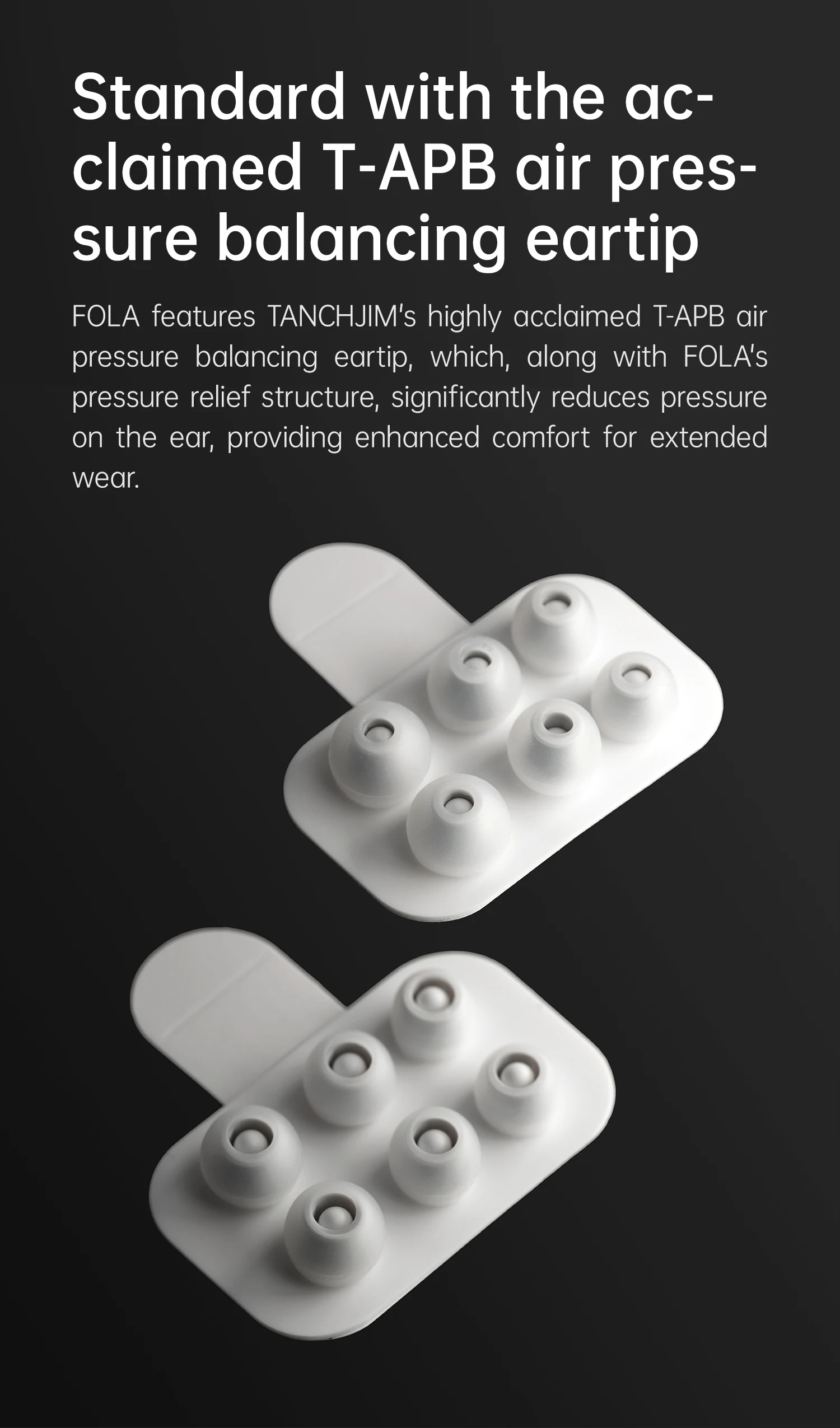 The FOLA earphones feature an aluminum alloy chamber with a sapphire glass faceplate, offering a premium, lightweight, and durable design. The high-quality materials not only improve the aesthetics but also ensure longevity. The ergonomic design, paired with TANCHJIM’s T-APB air pressure balancing eartips, ensures a comfortable, secure fit for extended listening sessions.