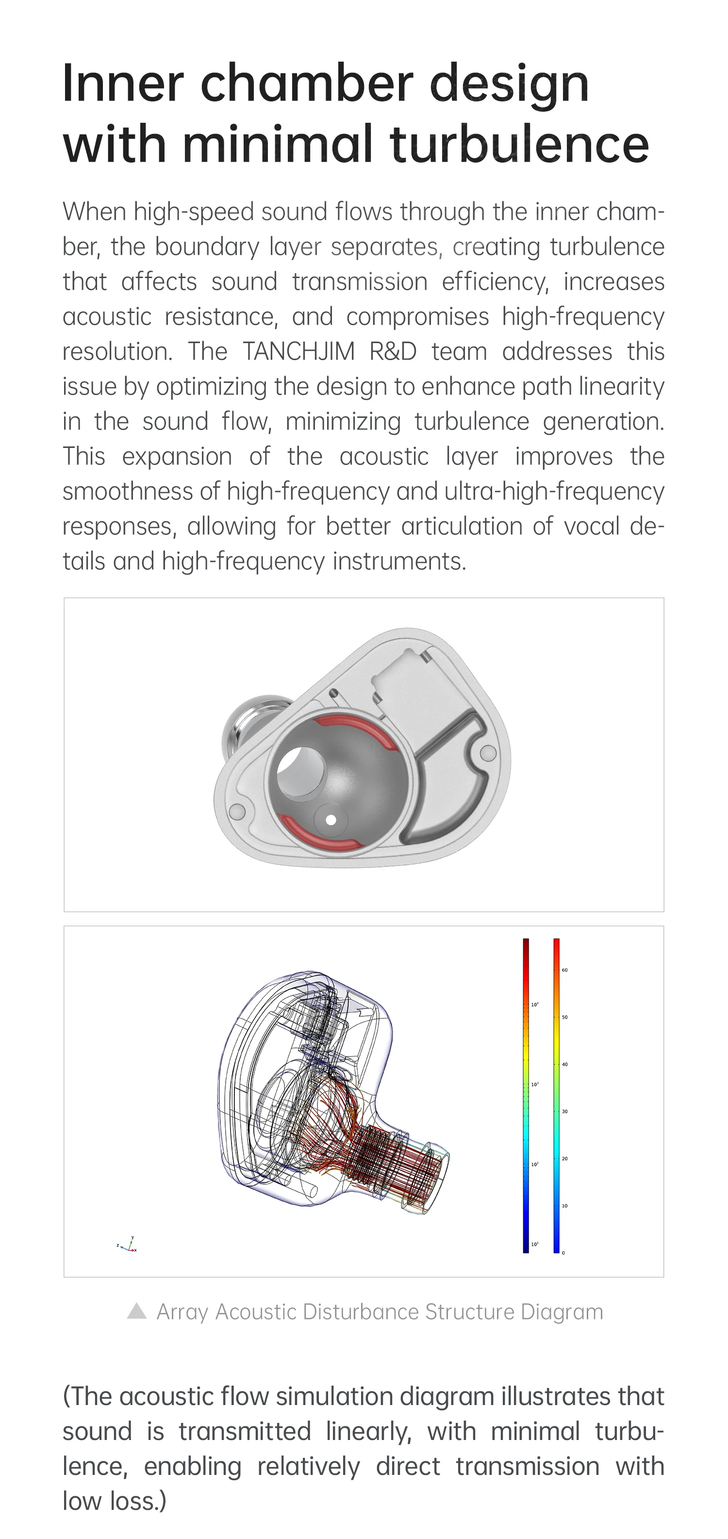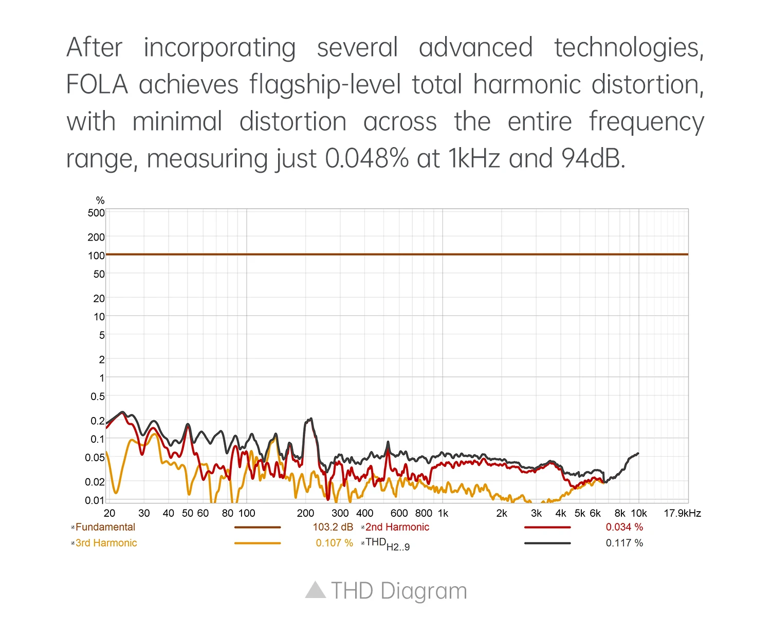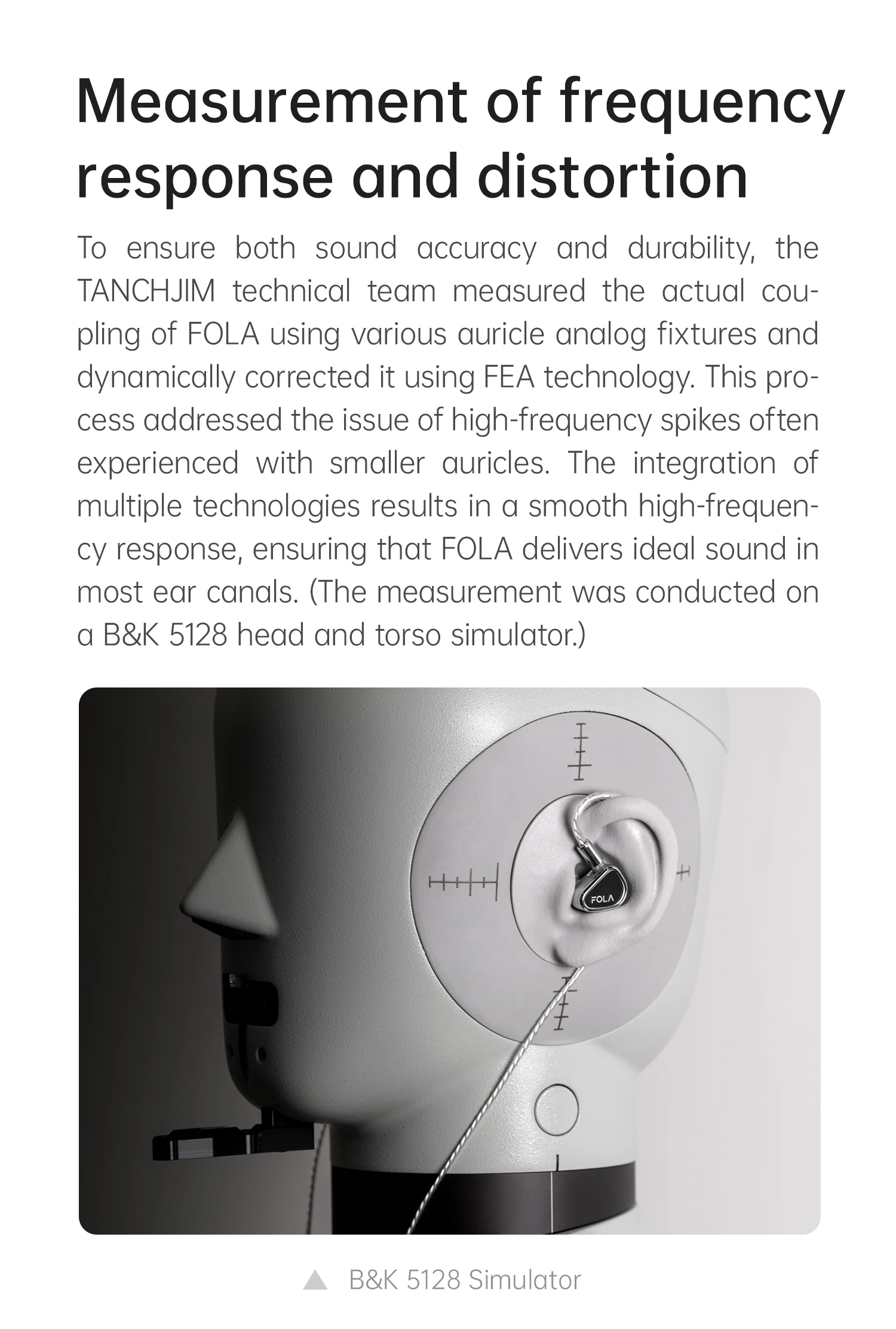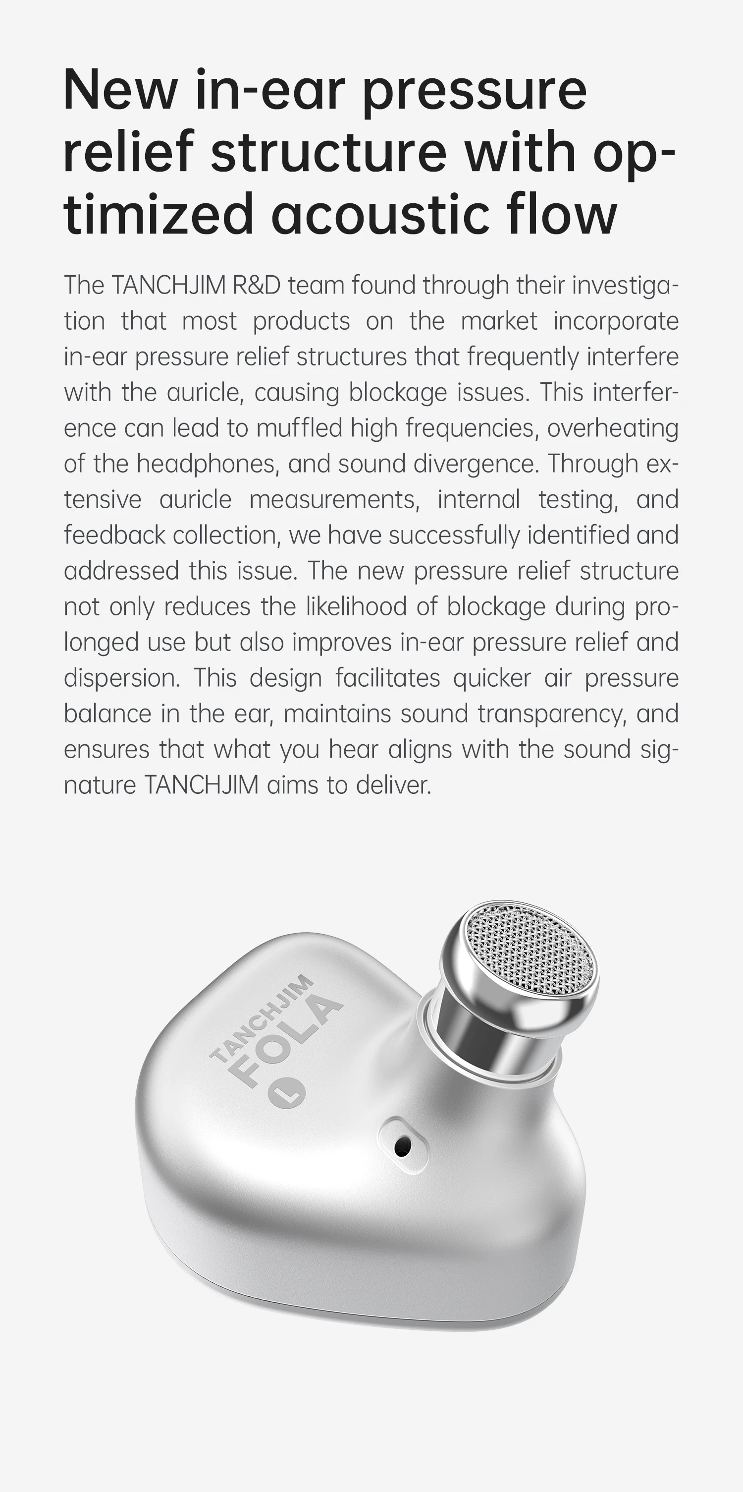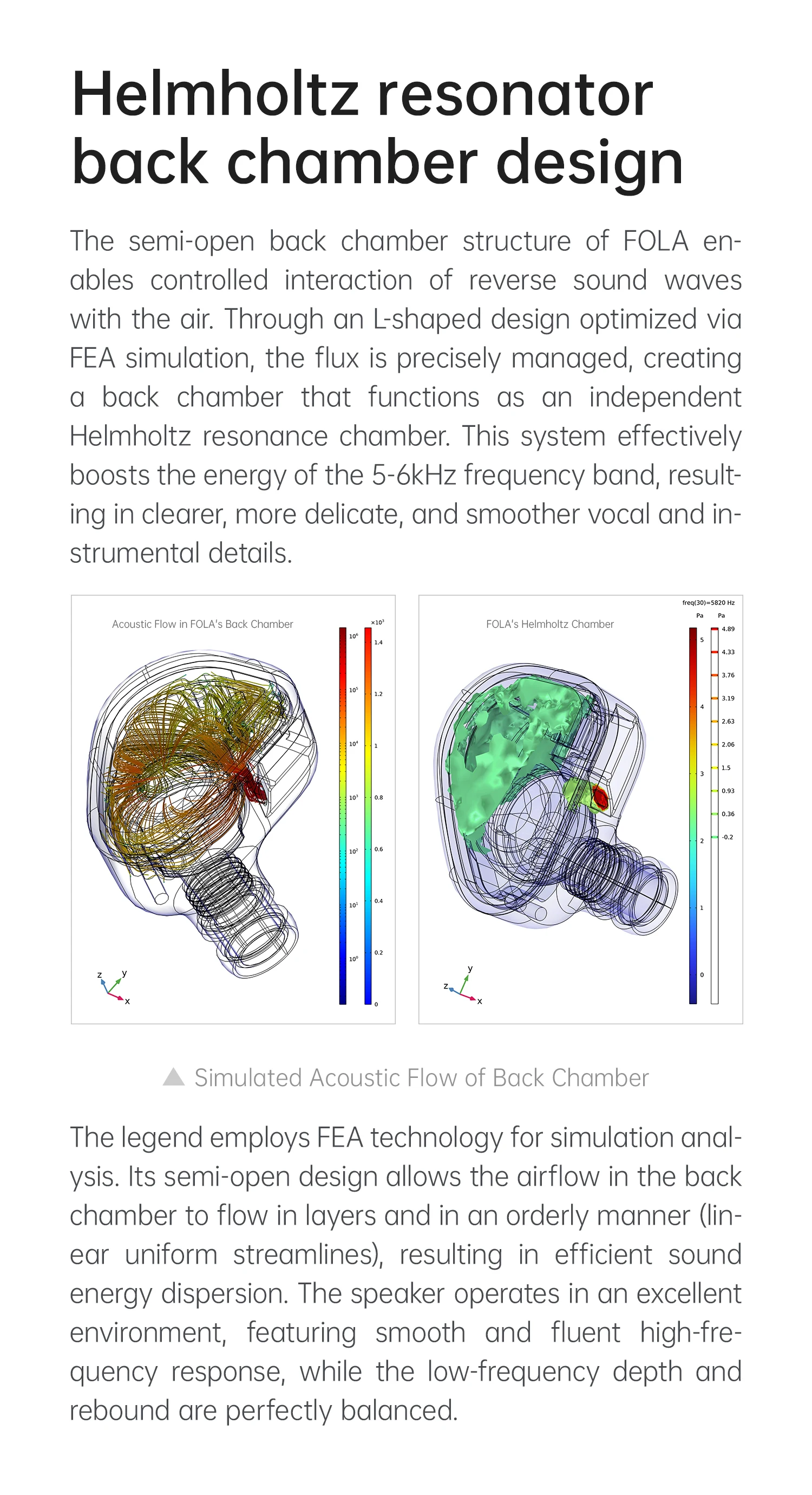 FOLA’s inner chamber design minimizes turbulence in the sound flow, allowing for smoother high-frequency responses and better articulation of vocal and instrumental details. The semi-open back chamber design further boosts sound clarity by controlling the airflow and enhancing frequencies in the 5-6kHz range, crucial for clearer and more detailed vocals.