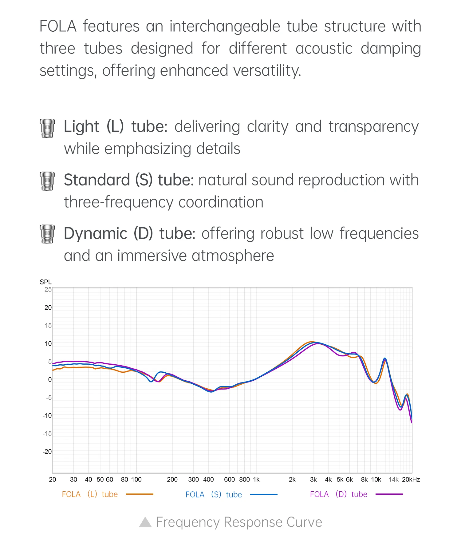 FOLA’s interchangeable tube design offers three different tubes (Light, Standard, and Dynamic) to cater to various listening preferences. Whether you're looking for clarity and detail, natural sound reproduction, or immersive low-end, FOLA provides the flexibility to tailor your listening experience. The addition of a custom copper-plated thick silver cable ensures superior signal transmission for the best sound quality.