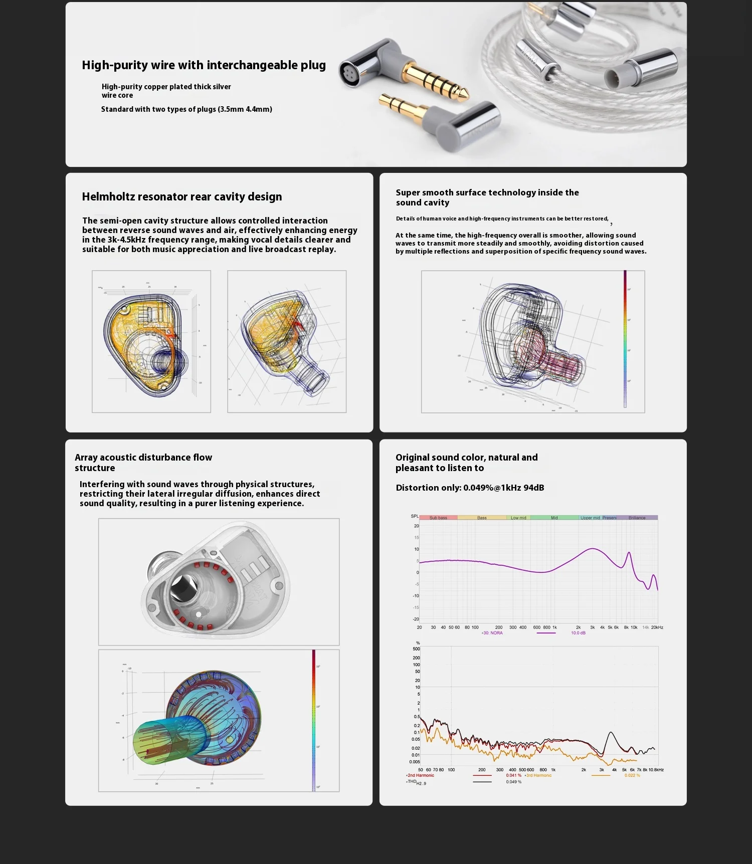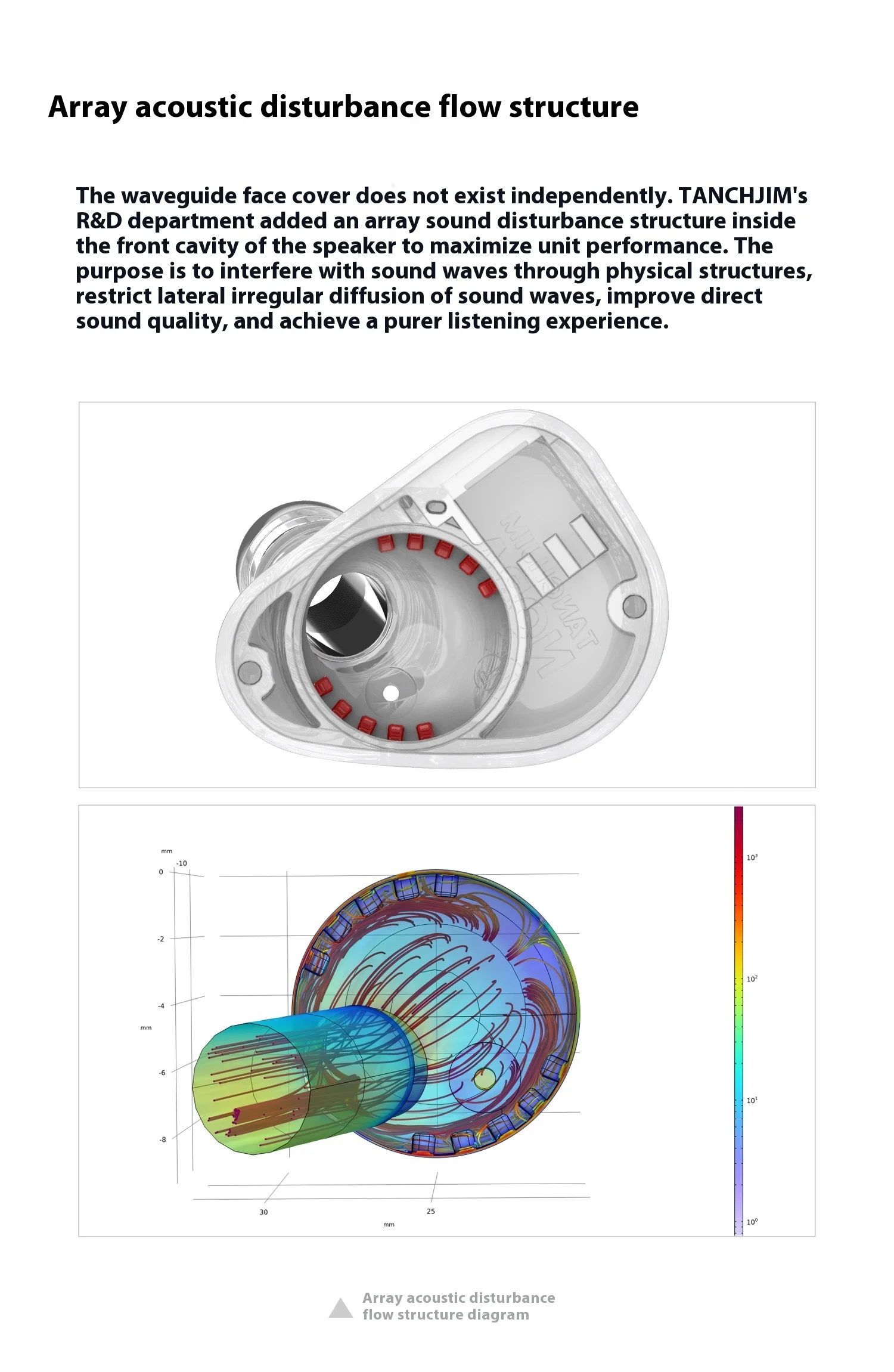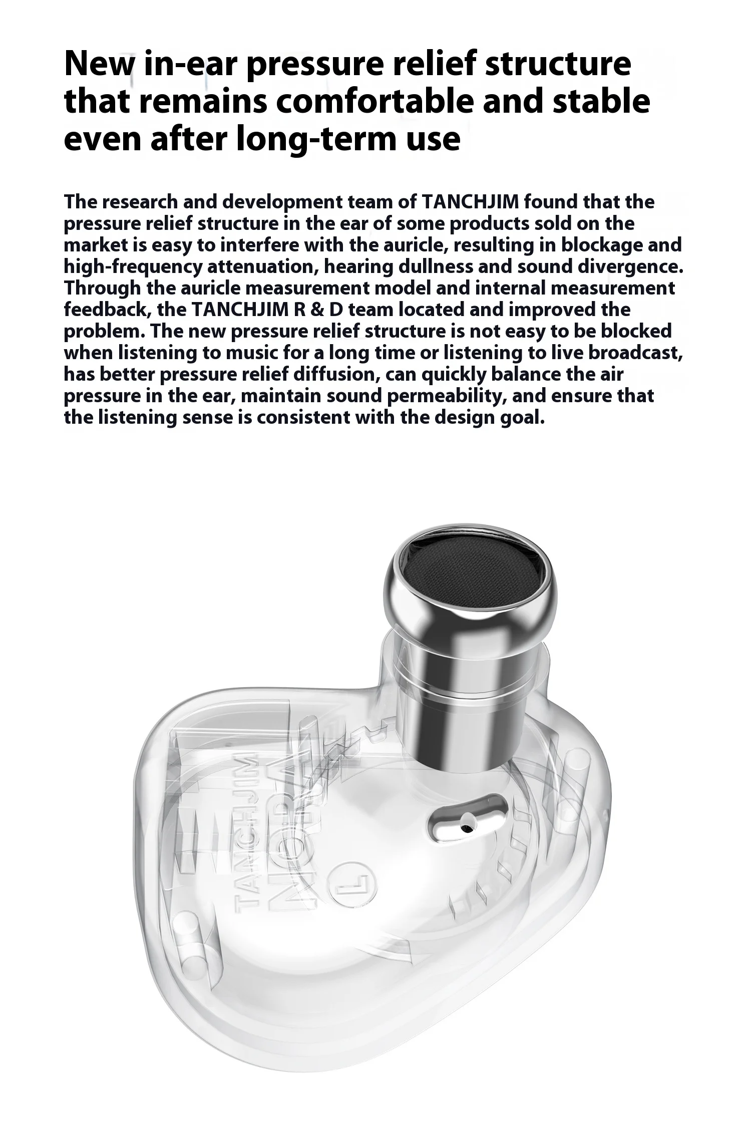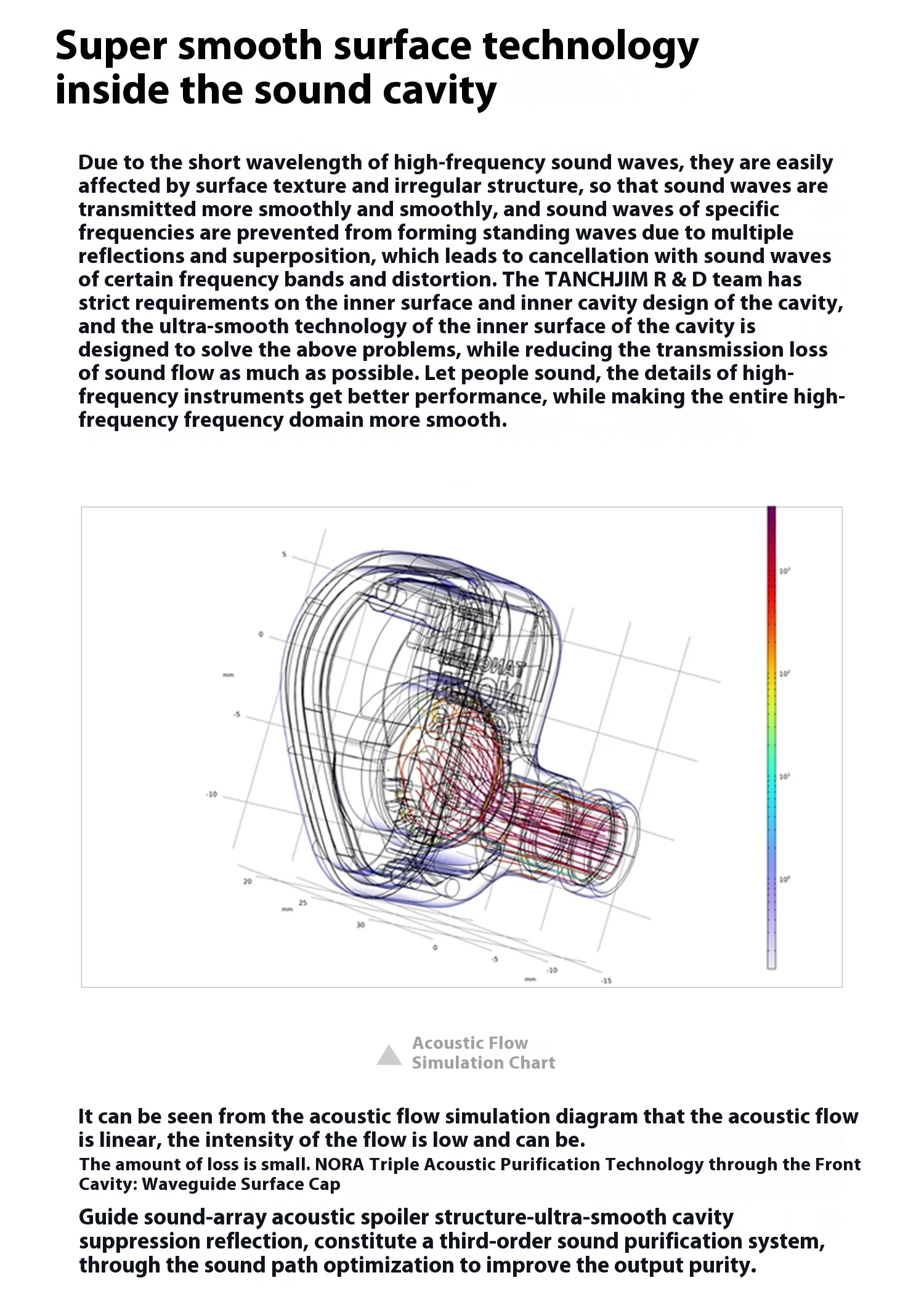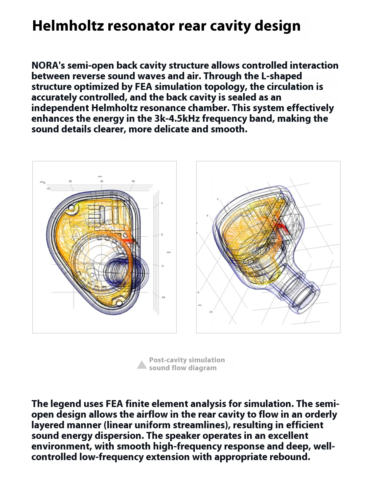 Experience acoustic engineers at Tanchjim have reimagined the acoustic structure of their IEMs for the Nora. The pair features a specially designed inner cavity that optimizes the sound signal flow. It features a super smooth surface inside the cavity to smoothen out the high-frequency resonances, with a Helmholtz resonator rear cavity design, the pair achieves controlled interaction between reverse sound waves and air. This Helmholtz resonator rear cavity optimizes the 3~4.5kHz frequency region, making vocals cleaner. We also have a new external vent which regulates the air-pressure buildup and ensures smooth comfort and enhanced bass response. Tanchjim Nora also features an Array acoustic disturbance flow structure. They have optimized the cavities with physical structures to restrict the sound wave movements in a controlled manner. This results in a pure, natural sound presentation with the pair.