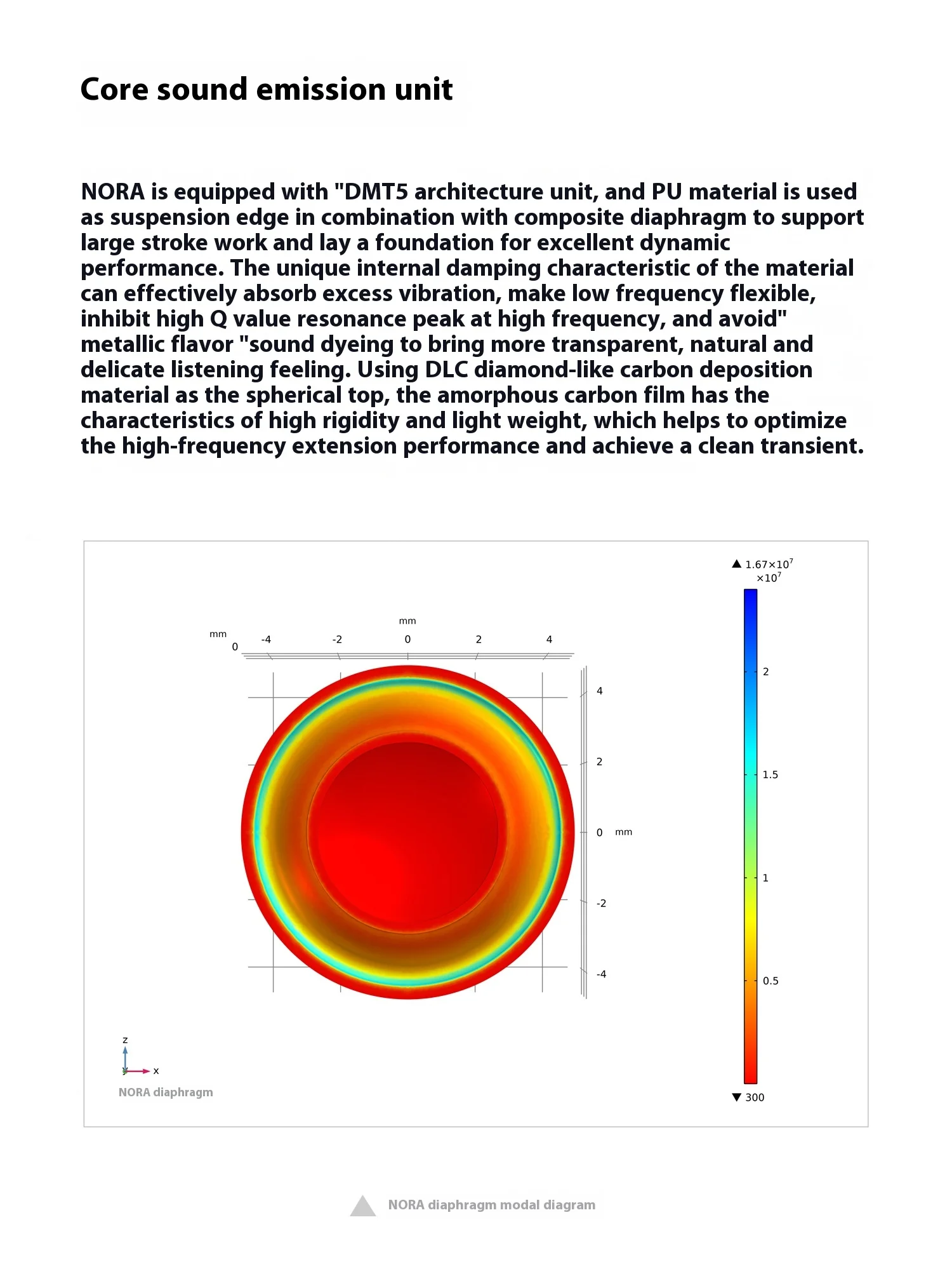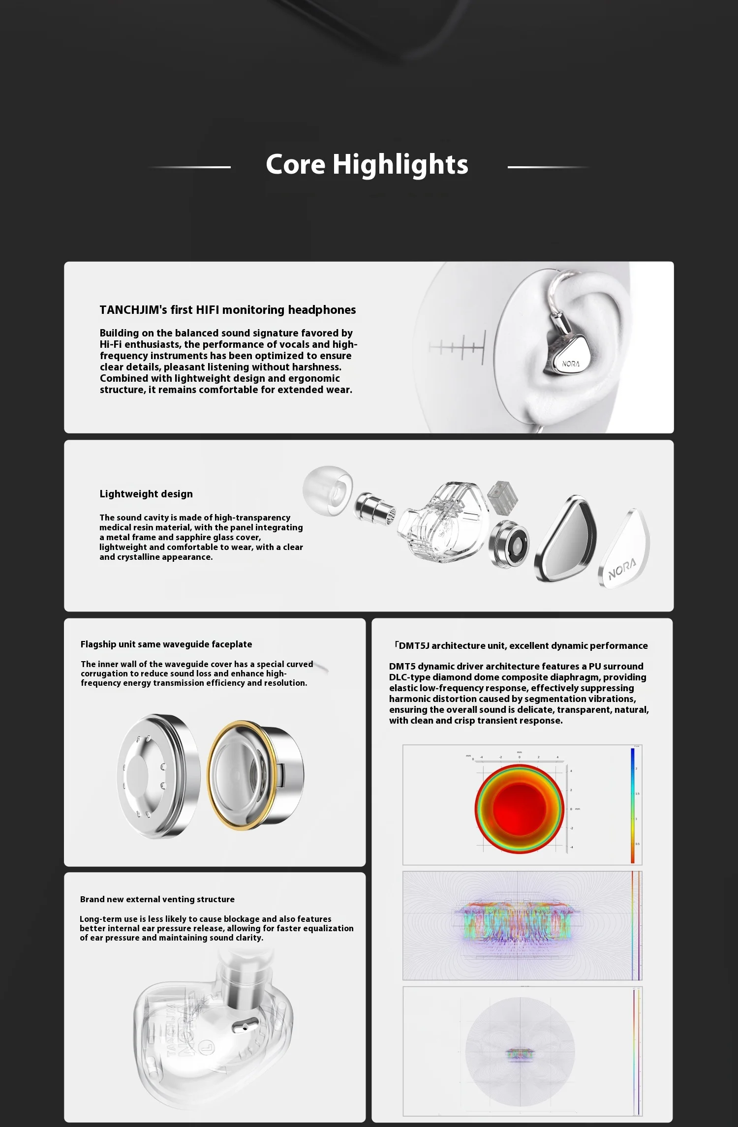 Tanchjim Nora is equipped with their DMT5 dynamic driver architecture. The pair features a PU surround, DLC diamond dome composite diaphragm material. It features a dual-cavity, dual-magnetic design. Crafted using high-quality components and an efficient dual-magnetic architecture, this driver enables the driver to produce a solid lower end with transparent, natural midrange, and clean, crisp treble response. The inner wall of the waveguide cover on the pair has a special curved corrugation that effectively reduces sound loss and enhances high-frequency energy with the pair.