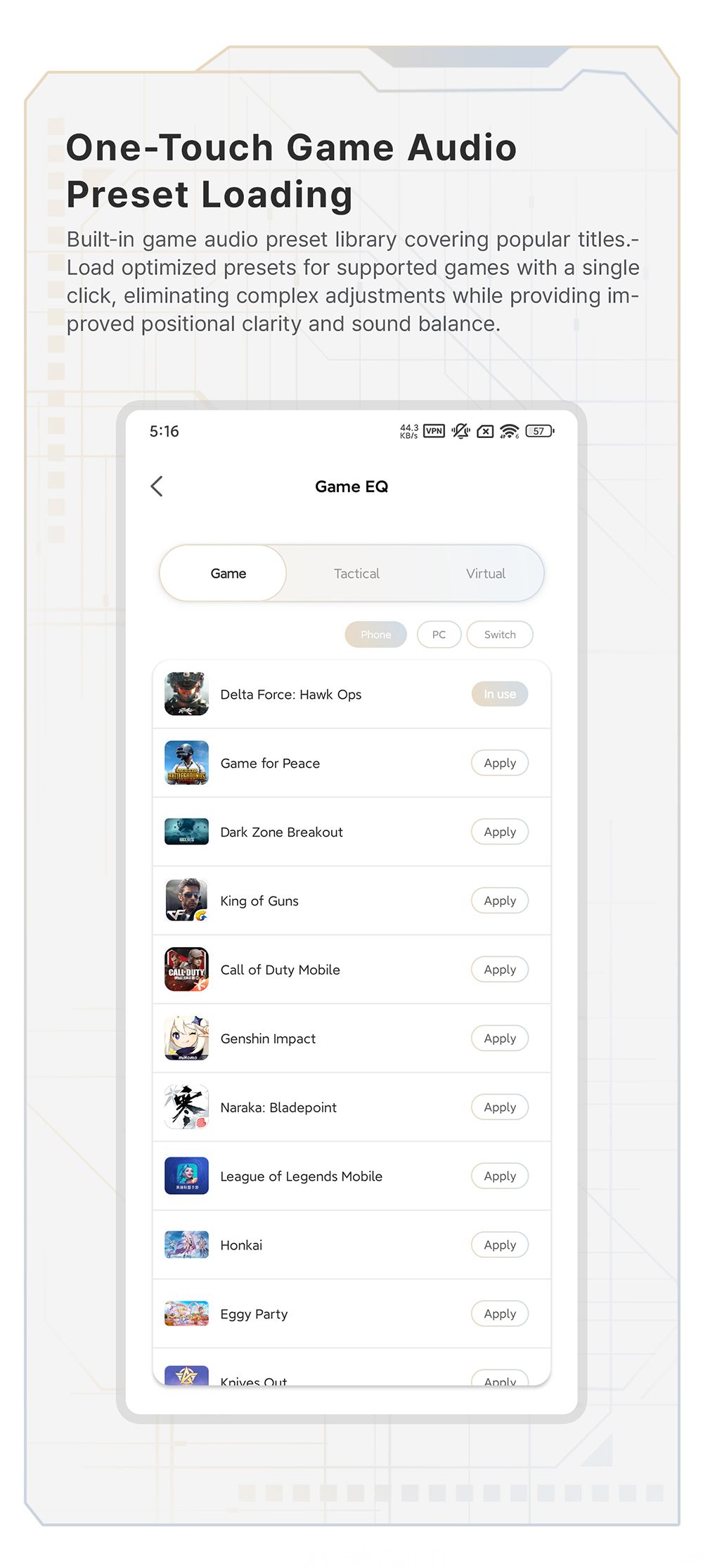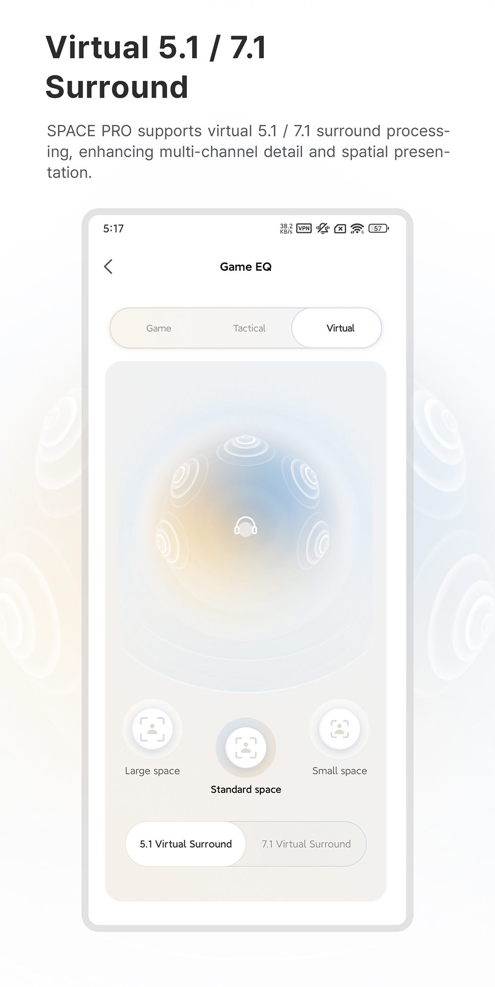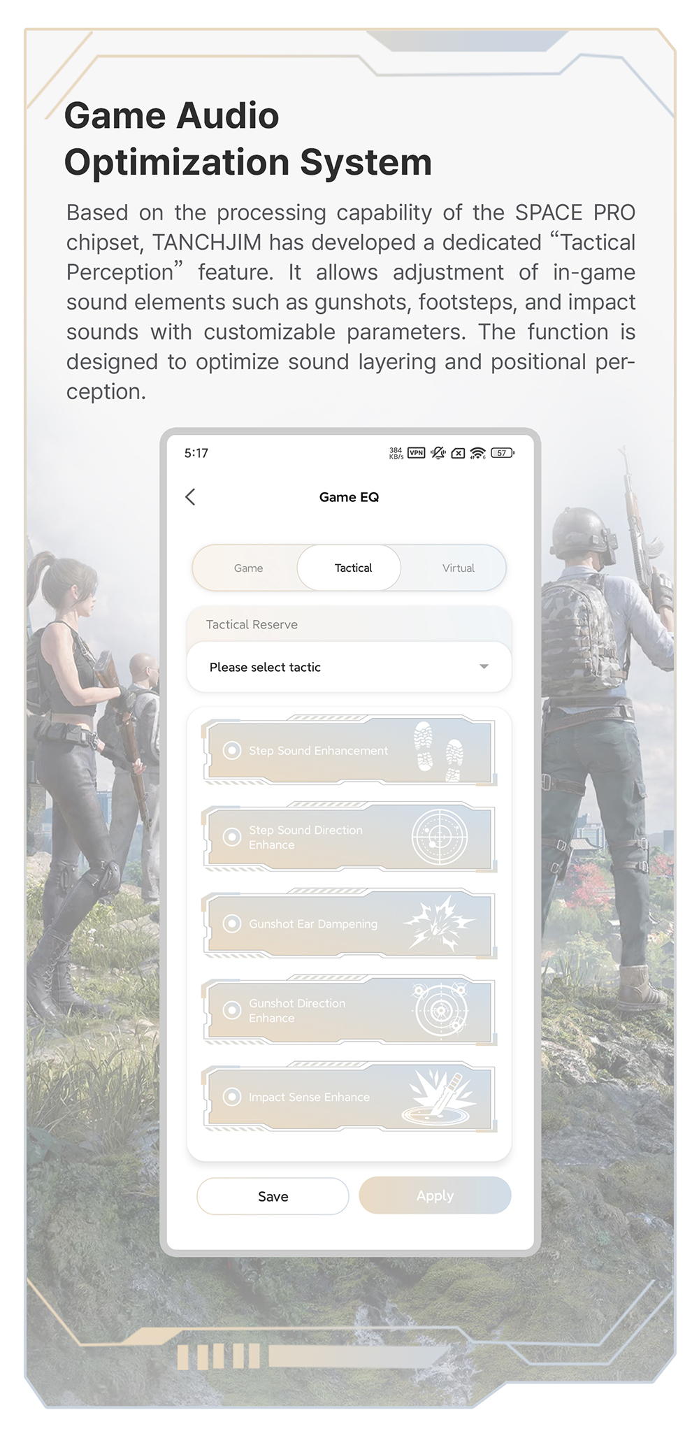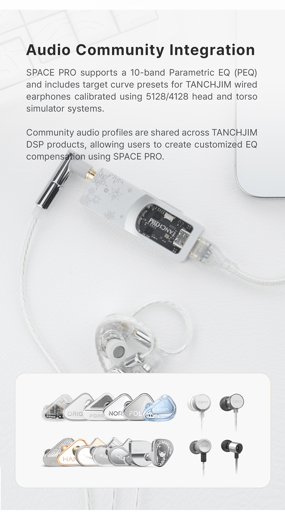 Tanchjim Space Pro is compatible with the Tanchjim application. The application has a dedicated Game Audio Optimization System for the Space Pro. It allows adjustment of in-game sound elements such as gunshots, footsteps, and impact sounds with customizable parameters. It has multiple built-in gaming audio presets, featuring audio setting parameters for many popular titles. The application also has dedicated 10-band PEQ with community sharing feature, which allow for further customization and easy output adjustment. Space Pro also supports virtual 5.1/7.1channel surround processing; this feature enhances multi-channel detail and offers a spatial presentation.