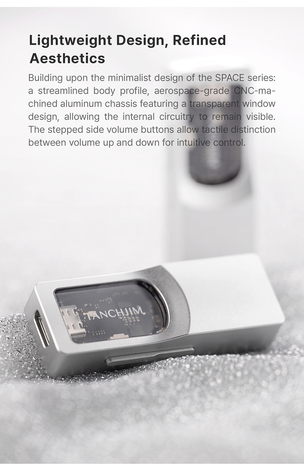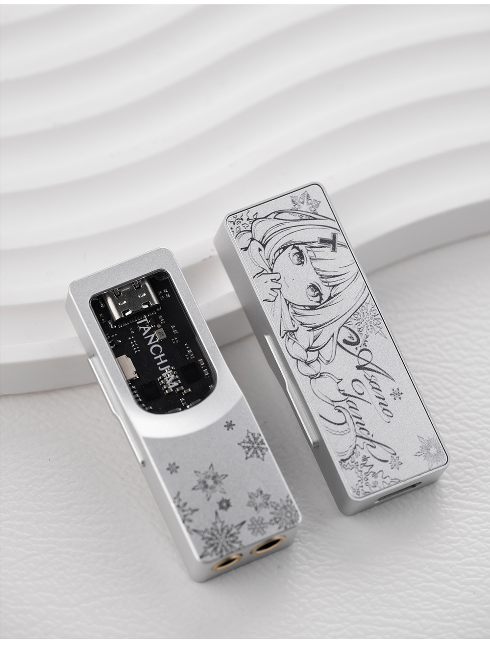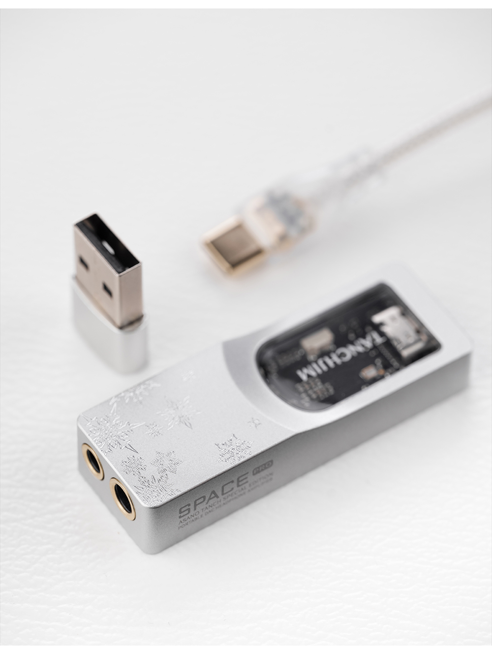 Tanchjim Space series has always been about compact and lightweight portable DAC/AMPs. The latest Space Pro follows that classic theme and offers a minimalistic design with a seamless body profile carved using a CNC-machined aerospace-grade aluminum alloy chassis and a transparent window. There are two variants available for the Space Pro, Standard variant offering a simple build, and the Asano-Tanch Snowfall edition, which features enhanced craftsmanship with high-precision laser engravings on the front and back surfaces. Tanchjim Space Pro comes with a detachable cable made up of high-quality silver-plated single-crystal copper wire conductors.