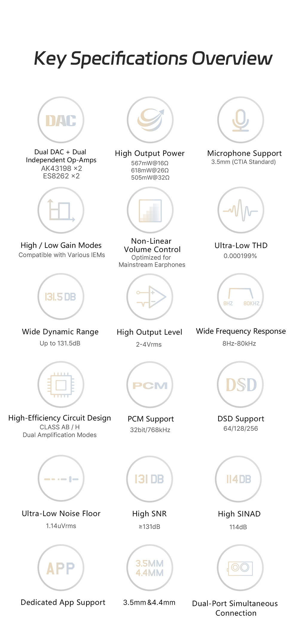 Tanchjim Pro promises an astonishing sound quality with its professionally designed Dual DAC+Dual OPAMP architecture. The DAC/AMP houses dual CS43198 DAC chips paired with dual independent ES8262 OP-AMPs. This results in an open soundstage with precise details and a rich tone. The dual DAC+dual OPAMP design forms an optimized circuit with a fully-balanced four-channel decoding architecture. Enjoy seamless high-resolution audio signal processing with native DSD256 and 768kHz PCM signal decoding support.