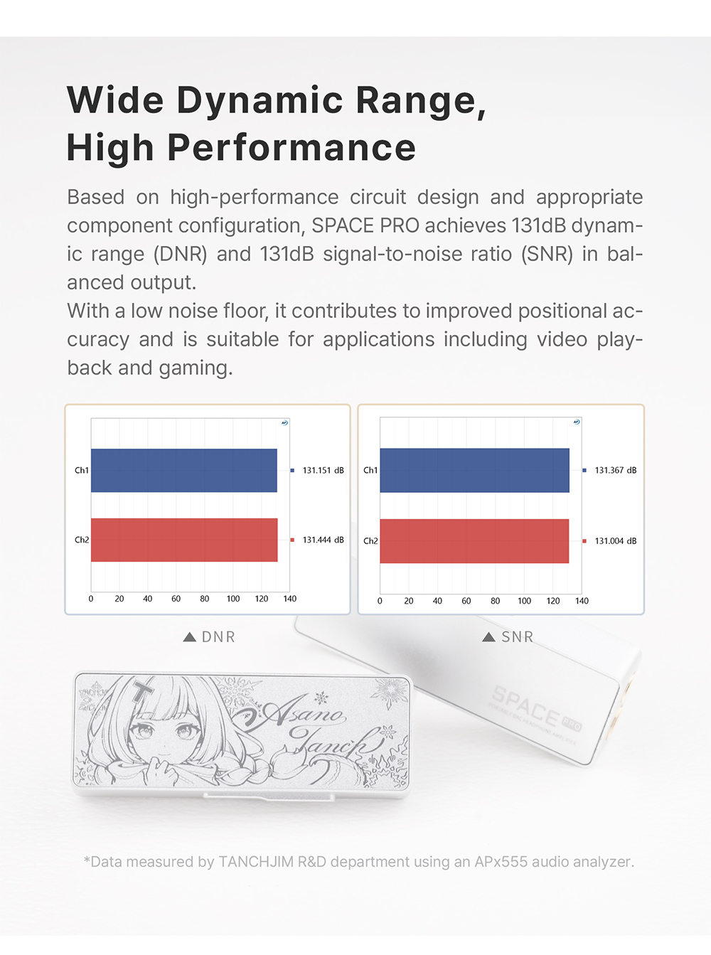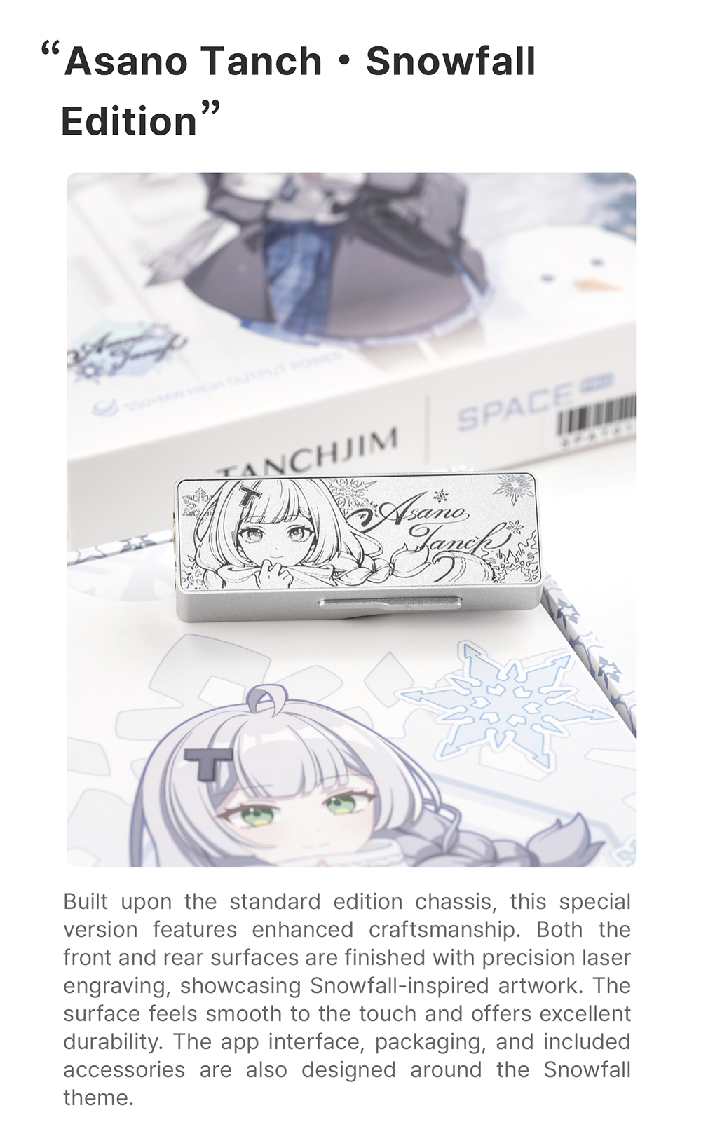 Tanchjim has released a brand new high-resolution portable DAC/AMP, introducing the Tanchjim Space Pro. Featuring a brand new dual DAC+ dual independent OP-AMP architecture, the Space Pro promises true high-fidelity audio performance with high SNR, DNR, and ultra-low THD+N performance. It houses dual CS43198 DAC chips combined with dual ES8262 amplification chips. It offers a strong output thrust reaching up to 618mW per channel. Tanchjim has made the Space Pro available in two variants: the standard variant and the Asano Tanch Snowfall Edition variant. The Space Pro has complete integration with the Tanchjim application that brings native game audio optimization system, dedicated gaming presets, 10-band native PEQ, virtual 5.1/7.1ch optimization, and many more features. With 3.5mm and 4.4mm dual headphone output options, the Tanchjim Space Pro offers unmatched performance with full versatility for customization. Elevate your portable chain with the all-new Tanchjim Space Pro.