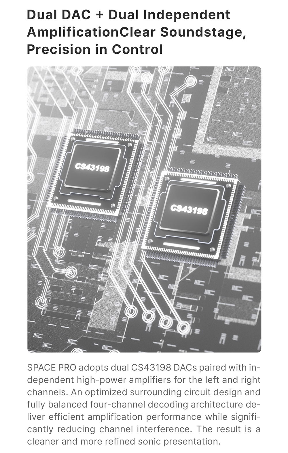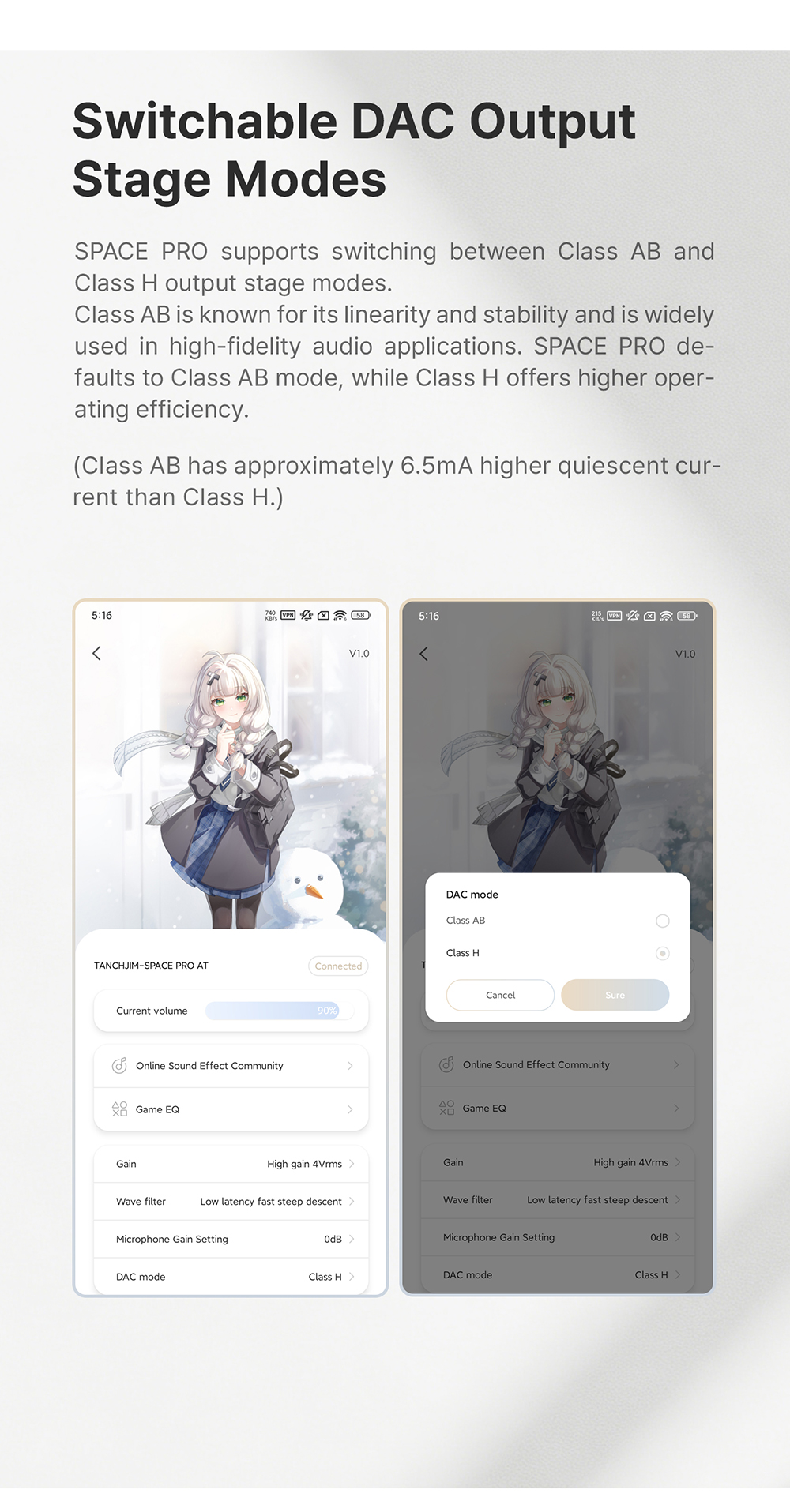 Tanchjim Space Pro supports dual DAC output stage modes featuring Class AB and Class H modes. Class AB mode delivers a stable and linear performance; it is widely used in high-fidelity audio devices. Class H mode, on the other hand offers smooth output with higher operating efficiency. Class H mode is perfect for low-output current devices to ensure seamless performance.