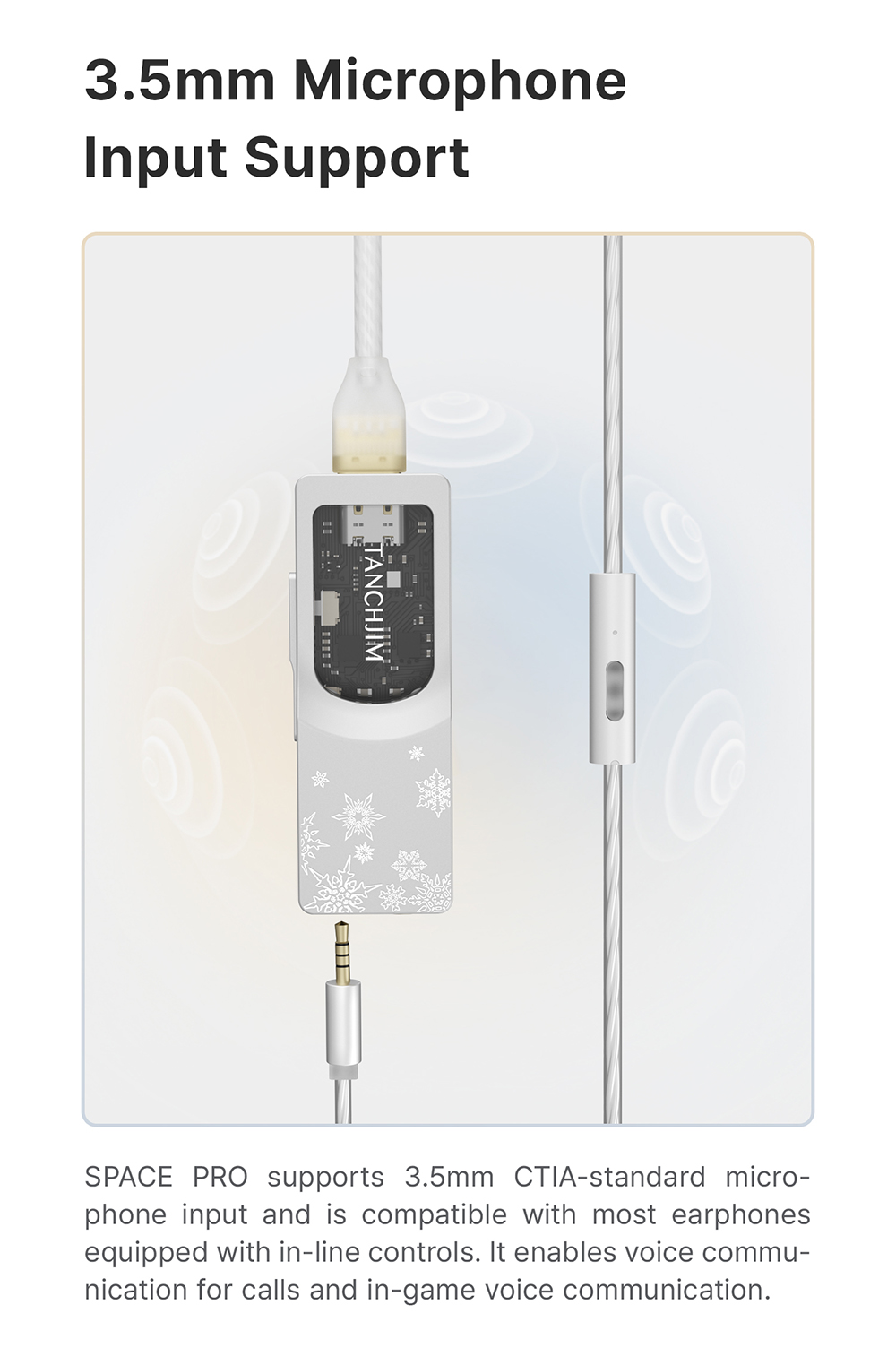 Tanchjim Space Pro has two headphone output options: 3.5mm single-ended and 4.4mm balanced output ports. The 3.5mm port supports an in-line microphone with CTIA standards. Even when using the earphones/headphones with the 4.4mm output port, users can use the 3.5mm port for dedicated mic usage.