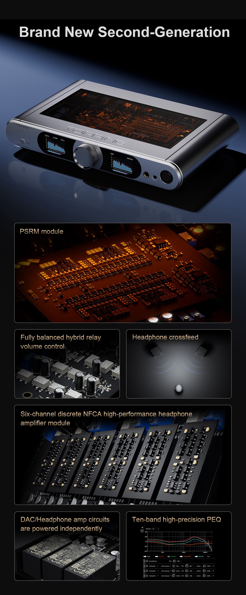 Topping DX9 Discrete features a dynamic 10-band parametric equalizer that helps you customize the output to your liking. This PEQ helps you individually adjust different frequency sections, adjust their gain, and also the Q-Factor. We also have Headphone crossed technology that brings speaker-like massive staging to create a more immersive and engaging sound profile with your headphones.