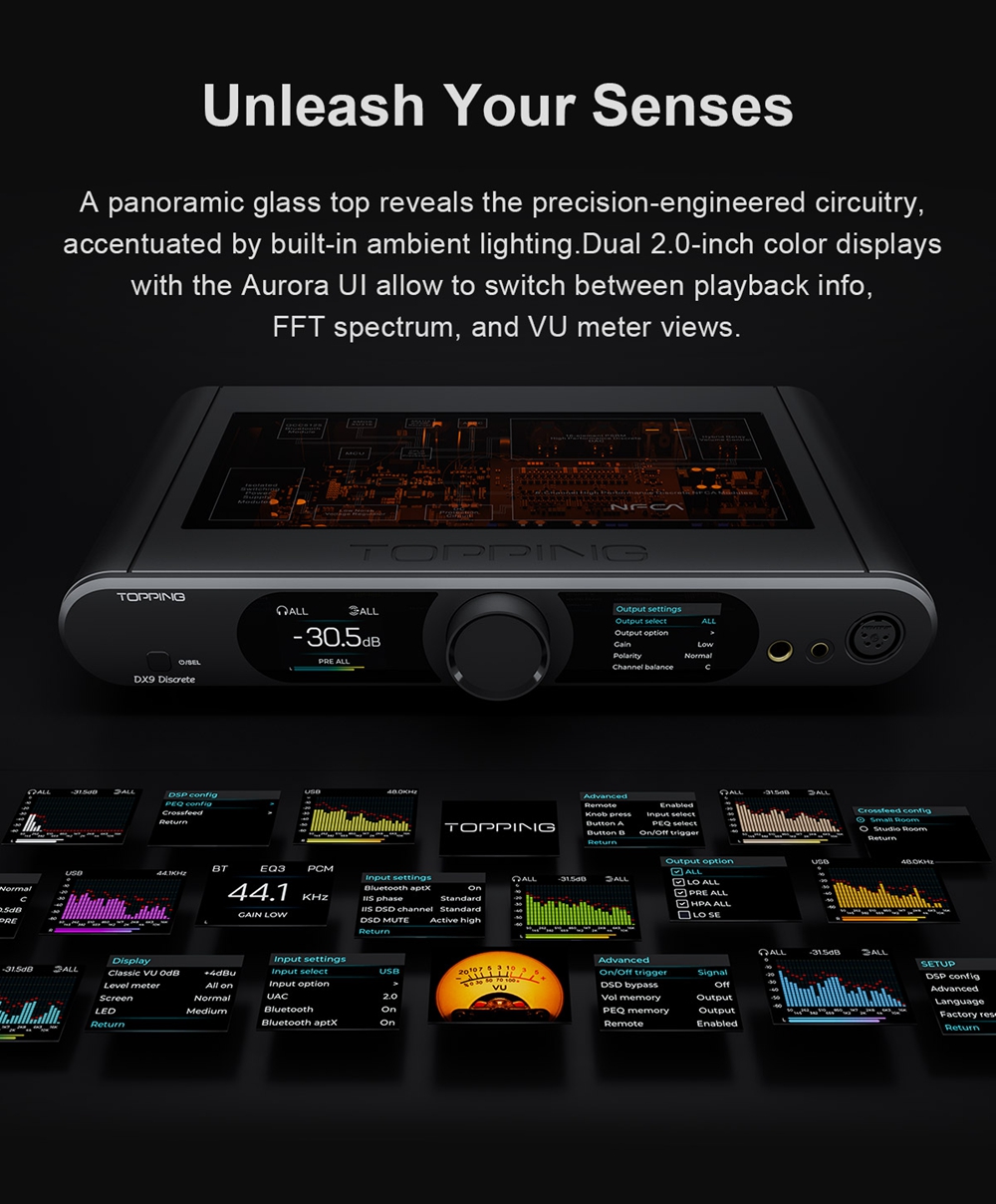 Topping DX9 Discrete features a solid build quality. This mighty all-in-one features a sleek CNC-machined aluminum alloy chassis along with a glass-top through which you can have a look at the intricate audio circuitry inside the DAC/AMP. It also features dual colorful display on the front with Aurora UI that includes FFT spectrum and VU meter display.