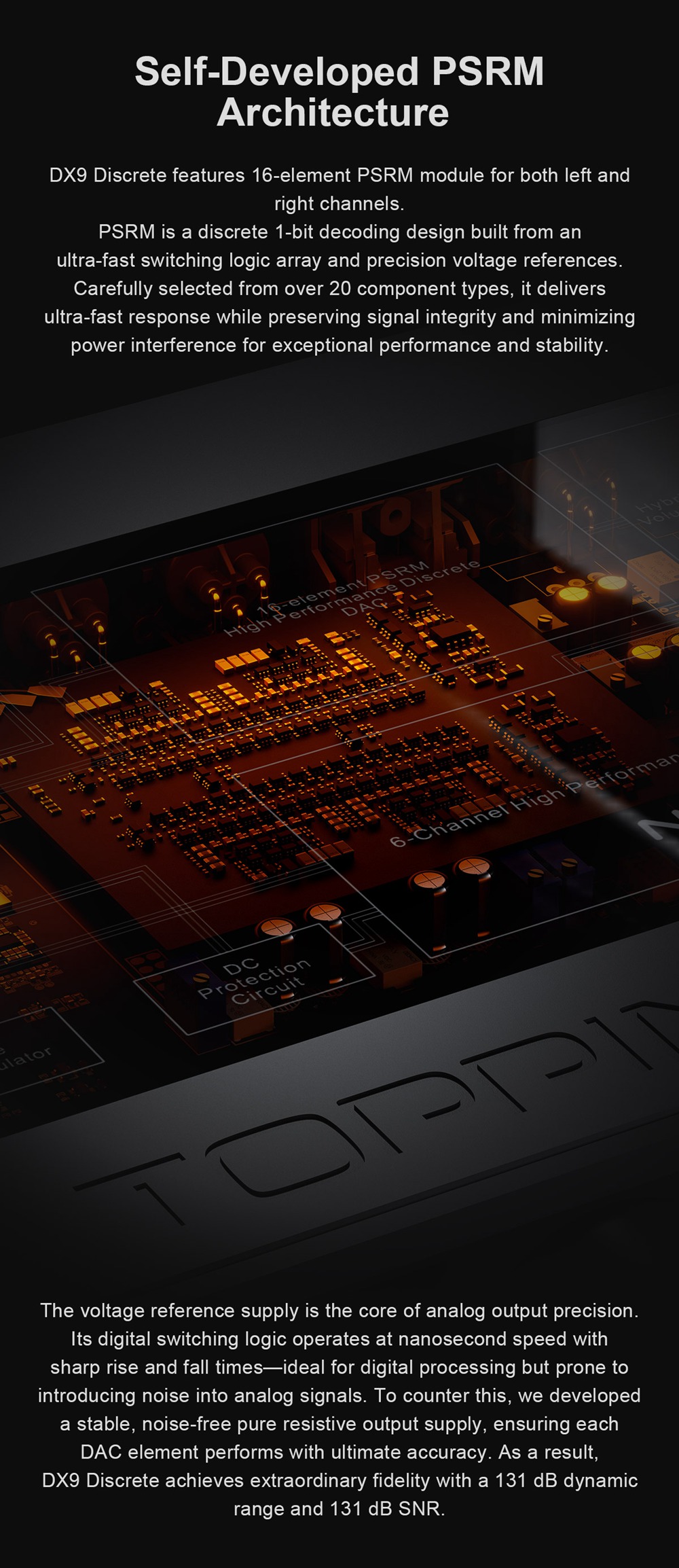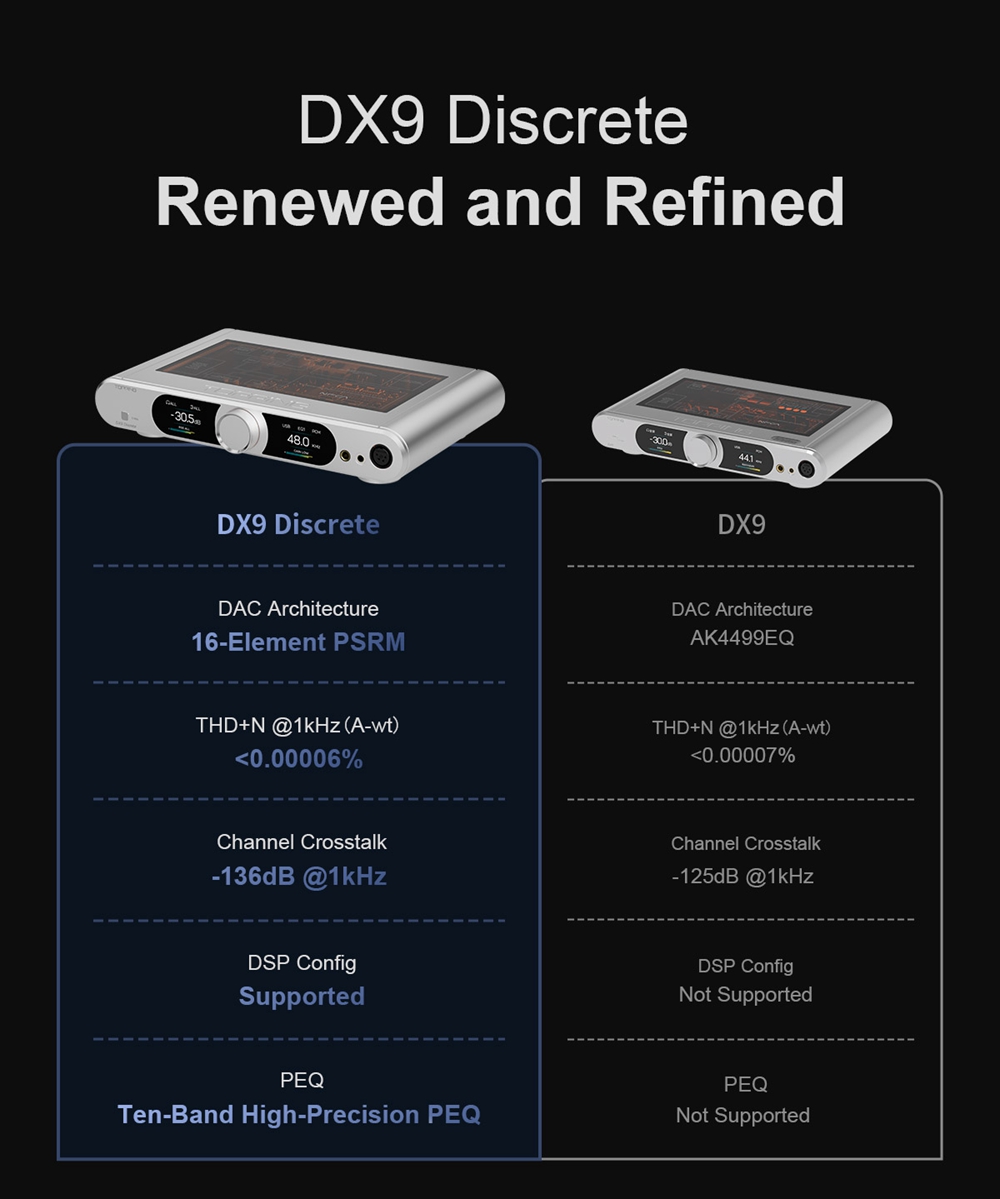 Topping DX9 Discrete drops the standard delta-sigma DACs and opts their own self-developed 16-element PSRM 1-bit discrete DAC. This architecture is professionally designed using top-quality components to ensure a true high-fidelity sound experience. It helps the DX9 Discrete achieve an astonishing 131dB SNR, <0.00006% THD+N, and supreme dynamic range across a wide frequency response range.