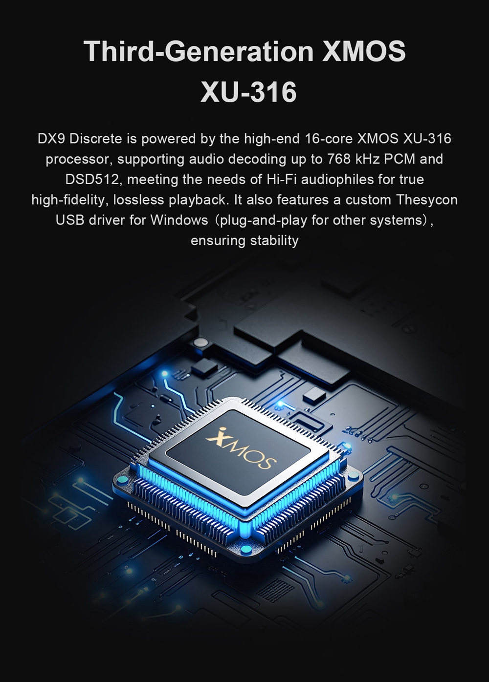Topping has featured CPLD Clock processor and AK4118 digital receiver on the DX9 Discrete. It maintains ultra-low jitter and enables high-fidelity sound reproduction on the device. With advanced XMOS XU316 USB processor, and this ultra-low jitter clock architecture, the DX9 Discrete ensures high-resolution 32-bit/768kHz PCM and native DSD512 audio signal processing with stable synchronization.