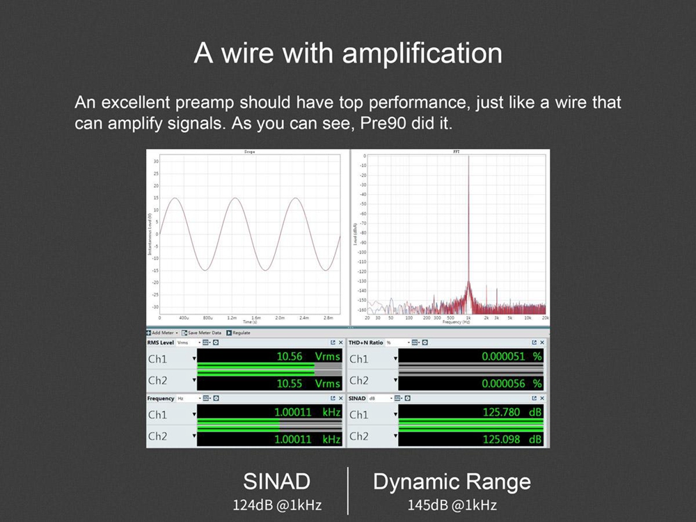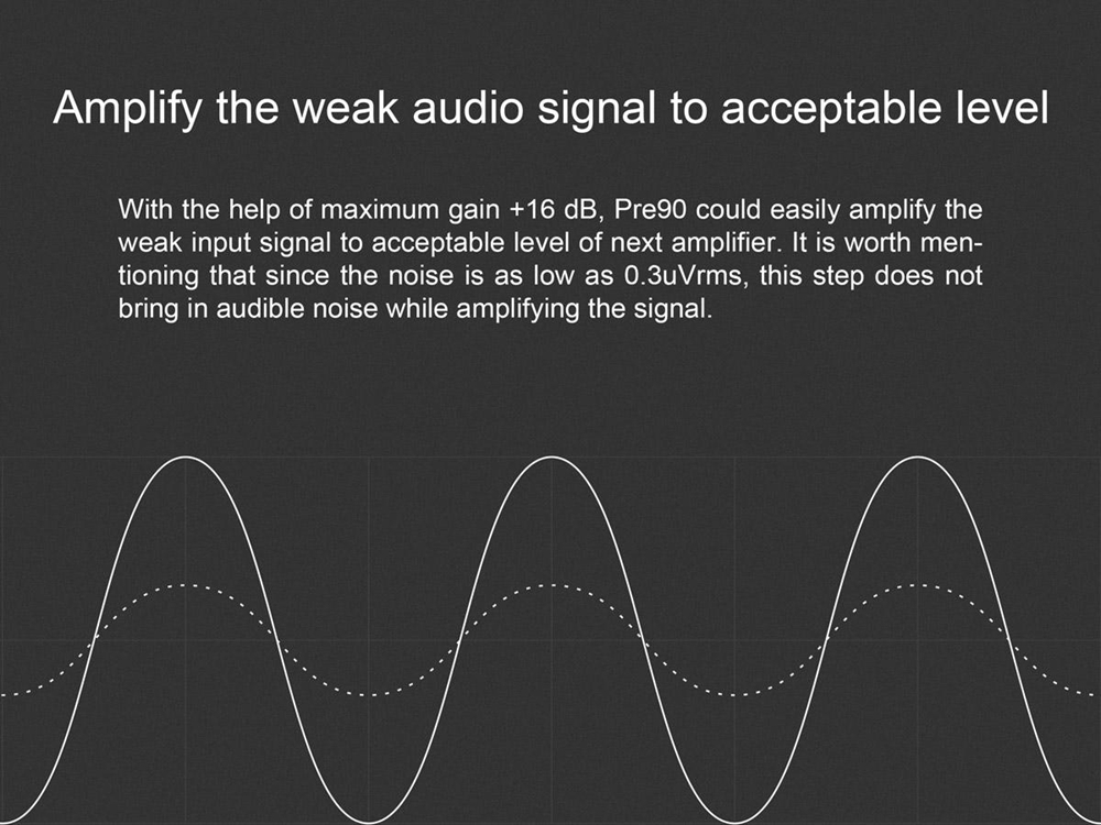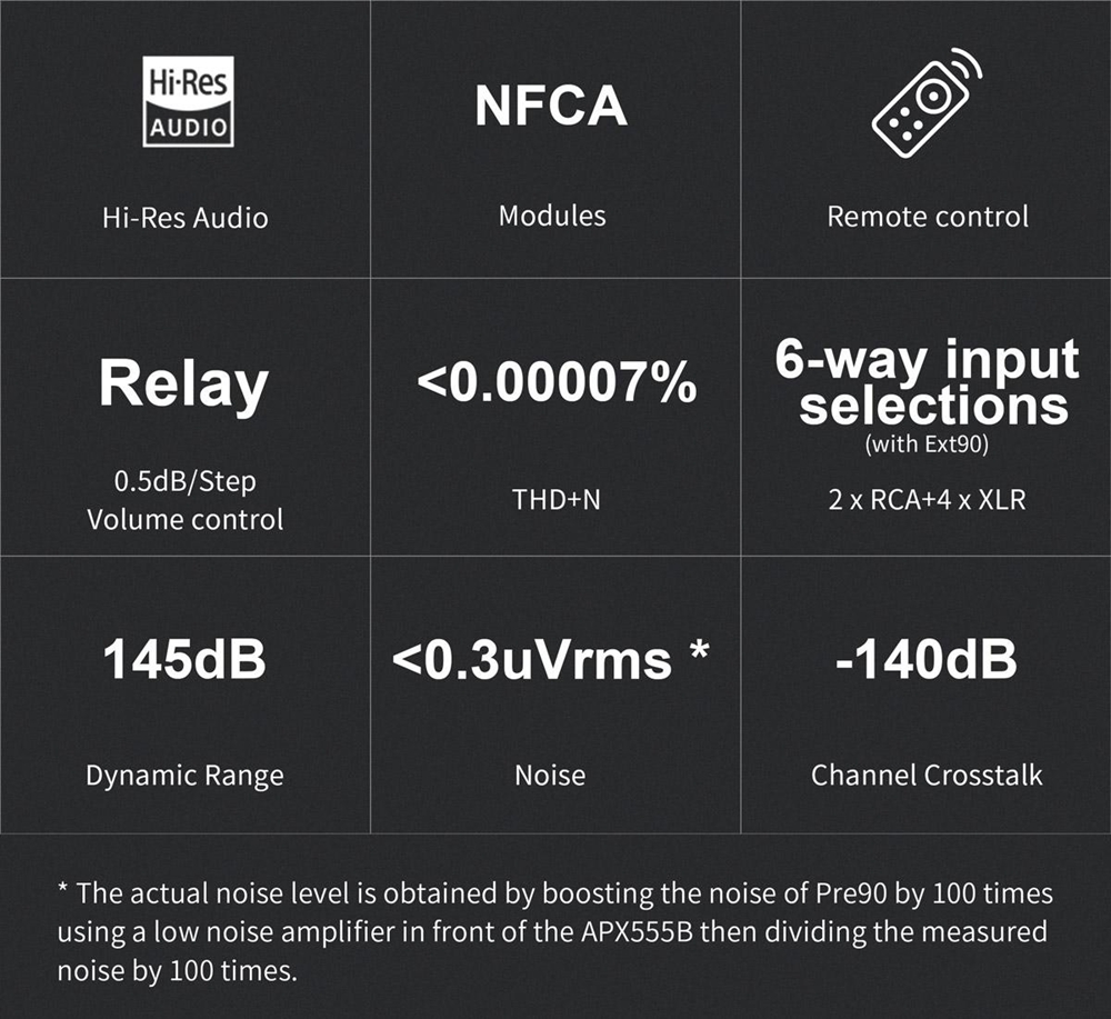 Equipped with a premium NFCA(Nested Feedback Composite Amplifier) module just like the flagship Topping A90 amplifier, the Pre90 delivers an outstanding performance. It also features Voltage Current Hybrid Feedback Architecture and Ultra-High Gain Feedback providing noise and distortion-free signal amplification for weak audio signals.