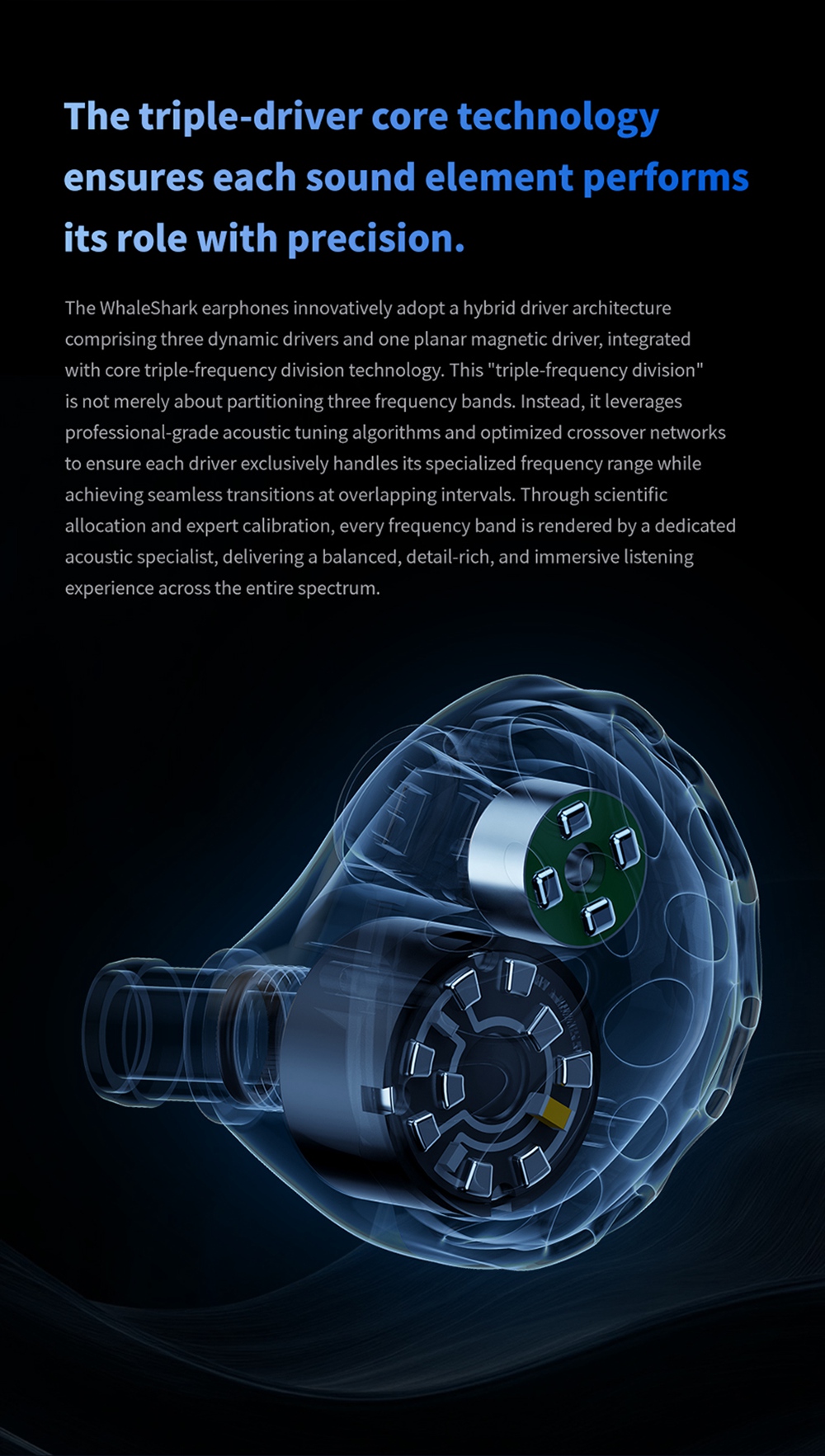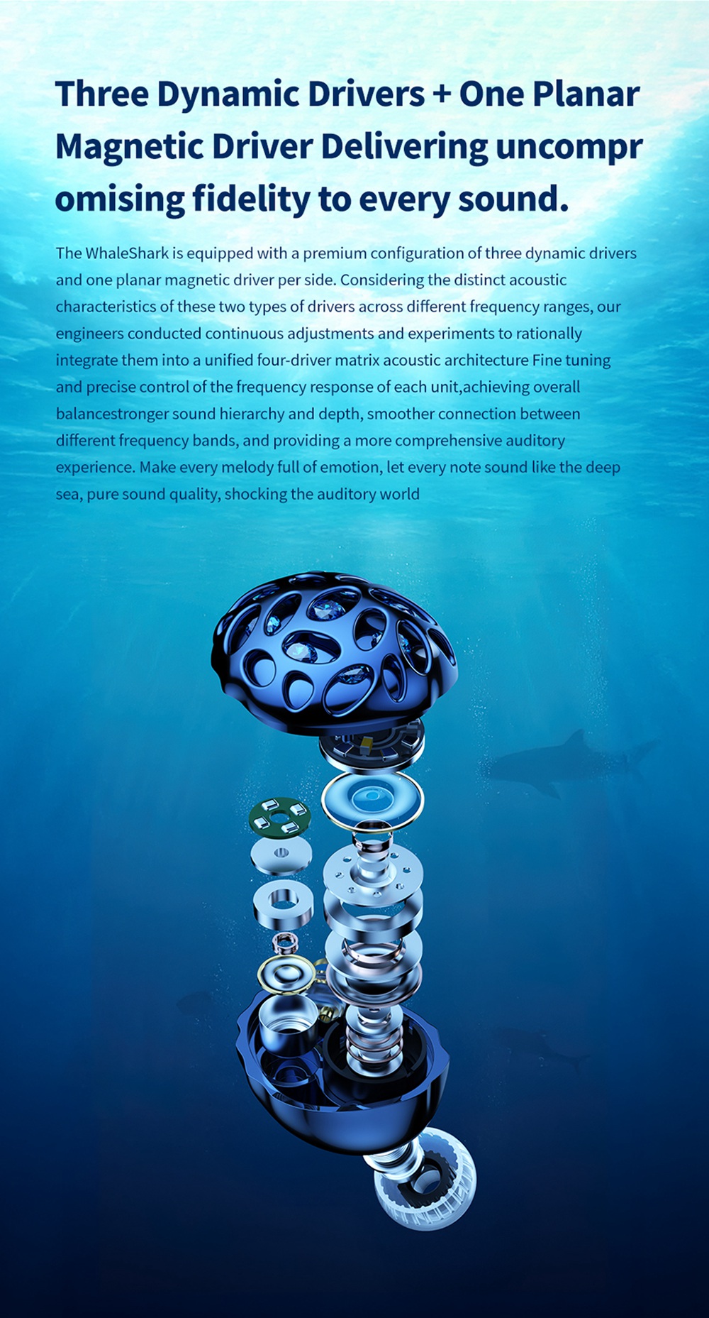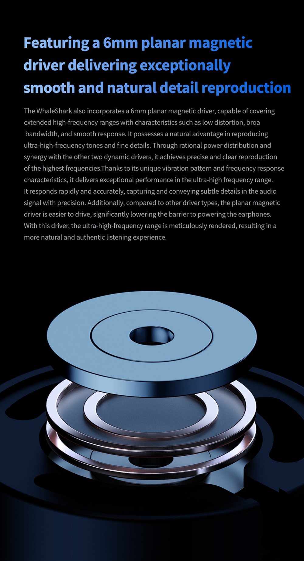 TRN has equipped the Whale Shark IEM with an innovative four-driver hybrid design on each side. The pair houses three powerful dynamic drivers and a planar magnetic driver unit. We have a 10.5mm beryllium-plated dynamic driver for thunderous lower-end, an 8mm PET diaphragm dynamic driver for accurate and lively midrange, a 6mm titanium-coated dynamic driver for crisp and defined treble region, and a 6mm self-developed planar magnetic driver that provides unmatched details and extensions in the ultra-high frequency region. This quad-driver configuration is arranged together in a professionally designed three-frequency crossover for crystal clear sound reproduction with ultra-low distortion characteristics.