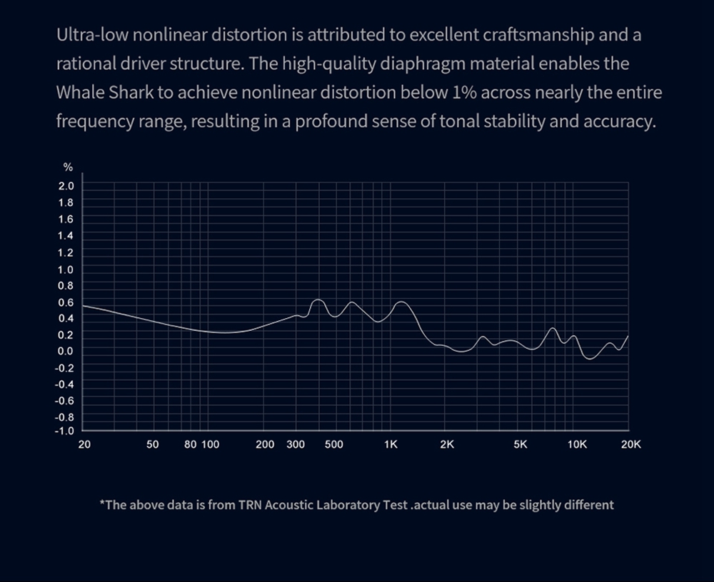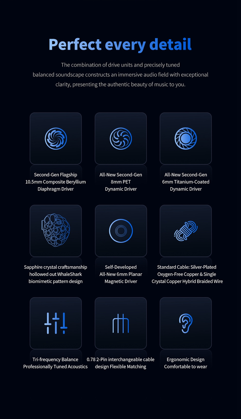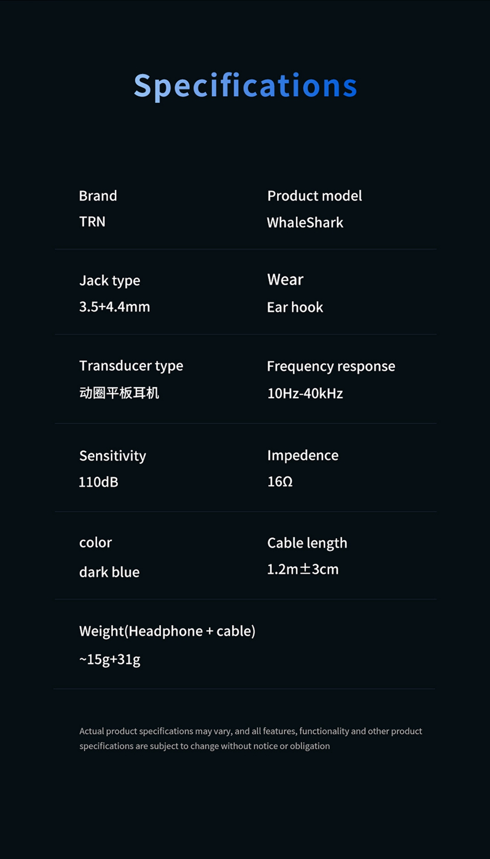 TRN has equipped the Whale Shark IEM with an innovative four-driver hybrid design on each side. The pair houses three powerful dynamic drivers and a planar magnetic driver unit. We have a 10.5mm beryllium-plated dynamic driver for thunderous lower-end, an 8mm PET diaphragm dynamic driver for accurate and lively midrange, a 6mm titanium-coated dynamic driver for crisp and defined treble region, and a 6mm self-developed planar magnetic driver that provides unmatched details and extensions in the ultra-high frequency region. This quad-driver configuration is arranged together in a professionally designed three-frequency crossover for crystal clear sound reproduction with ultra-low distortion characteristics.