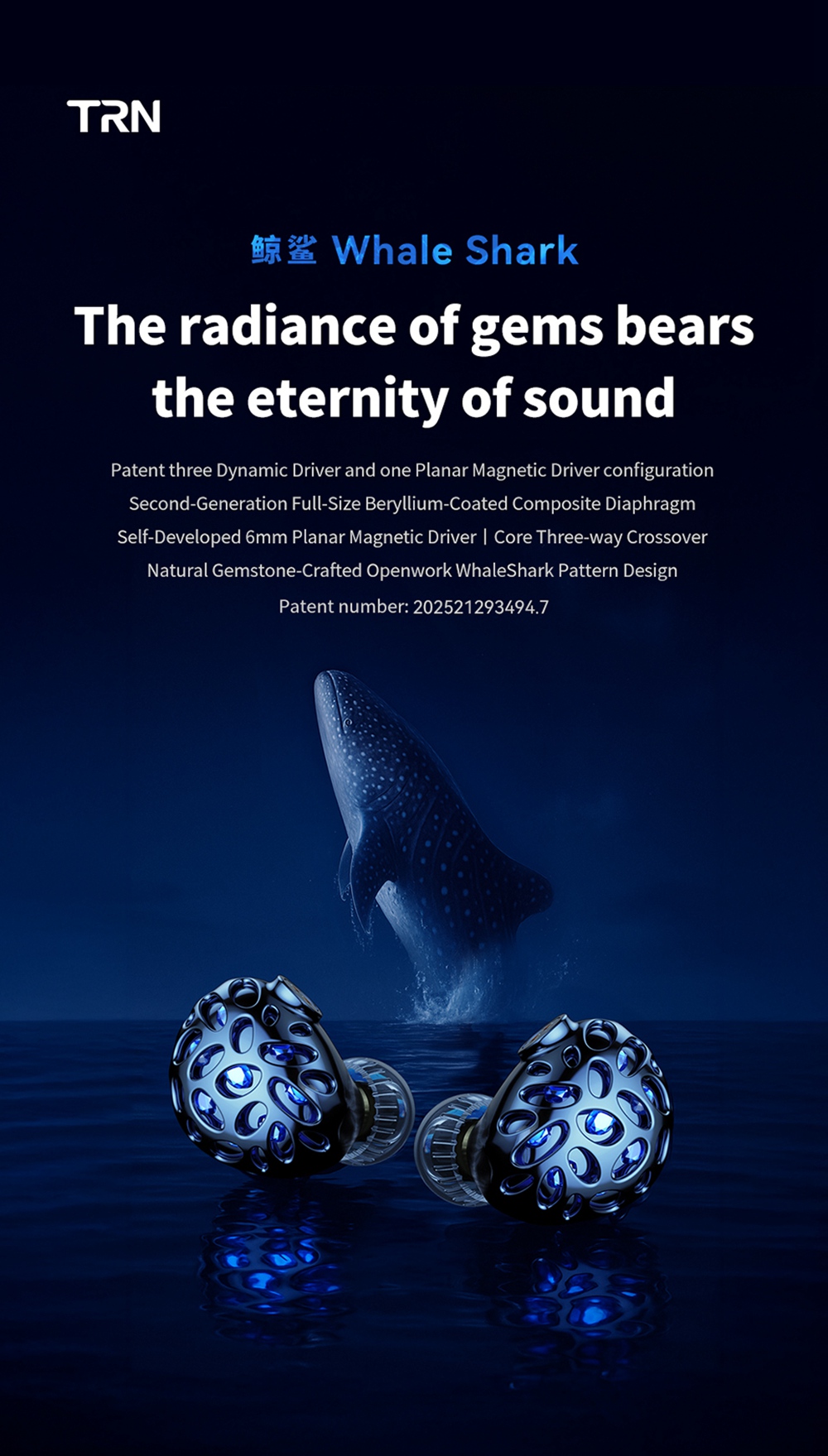 TRN introduces Whale Shark, a brand new multi-driver IEM featuring a sophisticated quad-driver configuration. TRN has equipped the pair with a patented 3DD+1Planar driver setup on each side. We have an all-new 10.5mm beryllium-plated dynamic driver for strong bass, an 8mm PET diaphragm driver for clear midrange, and a 6mm titanium-plated dynamic driver that promises sparkling high-frequency band. Additionally, we have a 6mm planar magnetic driver that complements the output with excellent focus on the ultra-high frequency band. The Whale Shark comes with three sets of swappable tuning nozzles, each having its own unique sound characteristics. TRN has engineered the pair with a premium liquid-metal cavity with a streamlined crystal gemstone artistic hollow shell design. TRN Whale Shark IEMs bring you an experience of high-fidelity sound with an exquisite shell design. It’s an IEM you will love every single time!!
