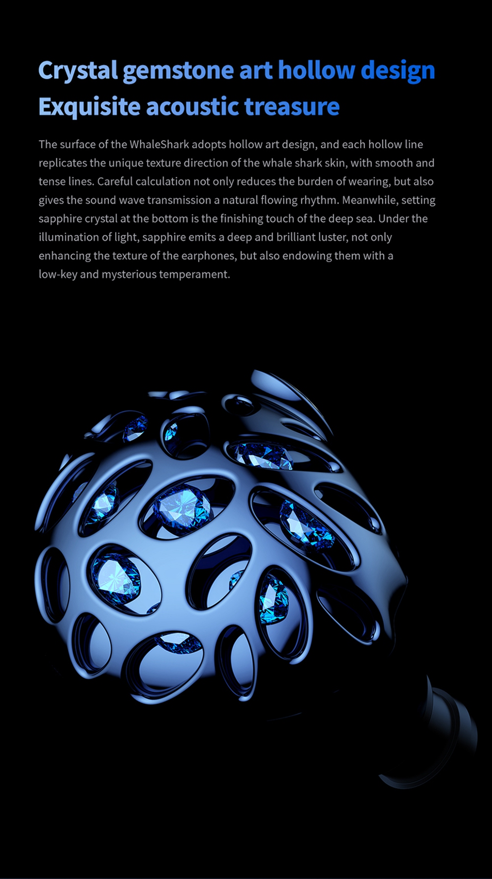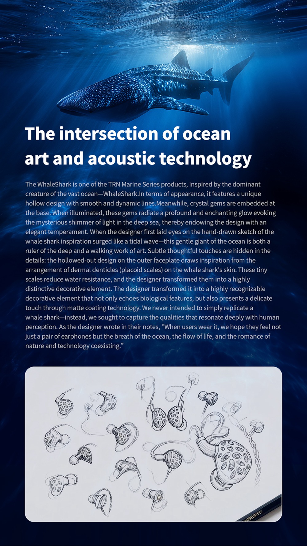TRN Whale Shark belongs to the Marin Series products by TRN. The pair is inspired by Whale Shark, a dominant creature of the vast ocean. Its inspiration is widely reflected in the unique hollow design with smooth and dynamic lines. Crystal gems are also embedded at the base. When light falls on these gems, they radiate an enchanting glow, evoking a mysterious shimmer of light in the deep sea. The hollowed-out design of the face plate draws inspiration from the arrangement of dermal denticles on the Whale Shark’s skin. These tiny details make the Whale Shark IEMs stand out in this highly competitive collection of products.