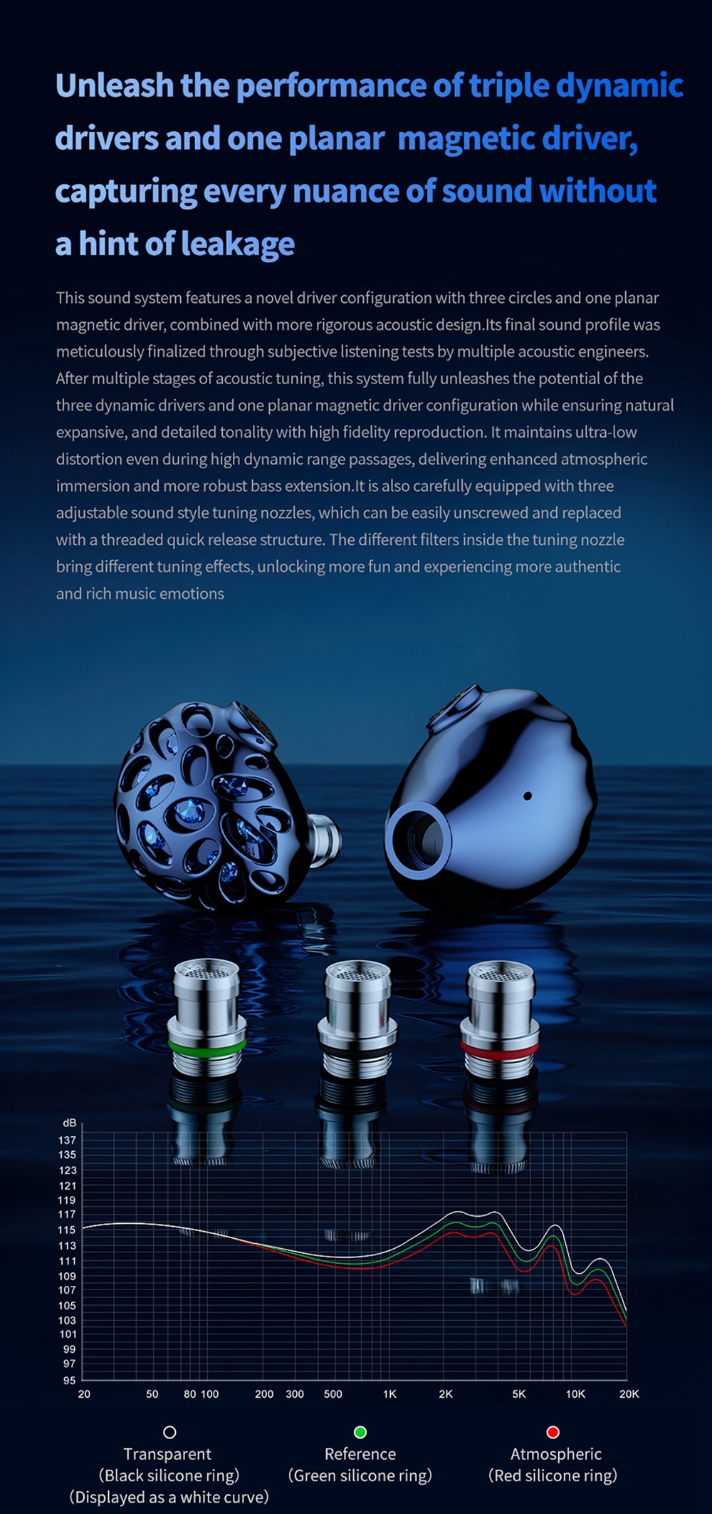 TRN Whale Shark comes with three sets of tuning nozzles. Users can replace the nozzles and experience three unique sound profiles with the pair. The black ring nozzle has a transparent sound profile with enhanced treble details, the green ring nozzle has a referenced tuning promising a balanced profile, and the red ring nozzle packs a strong atmospheric sound profile. Explore different nozzles for yourself and find your perfect sound with the TRN Whale Shark IEMs!!